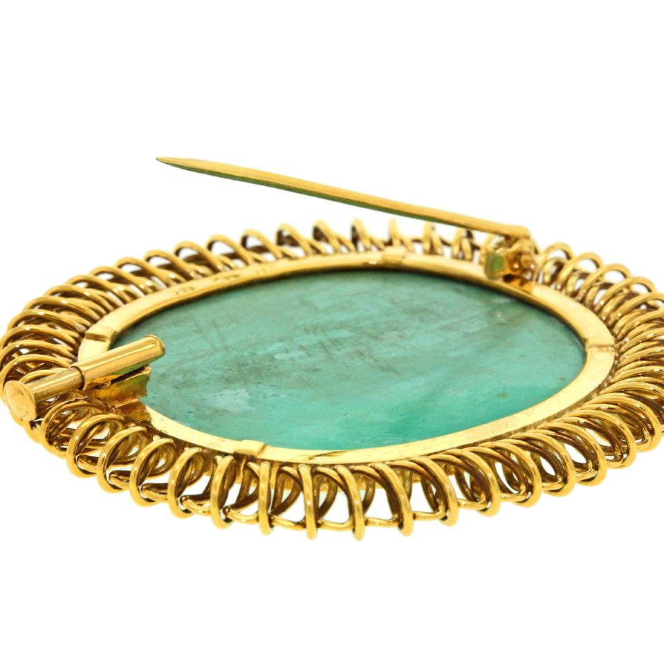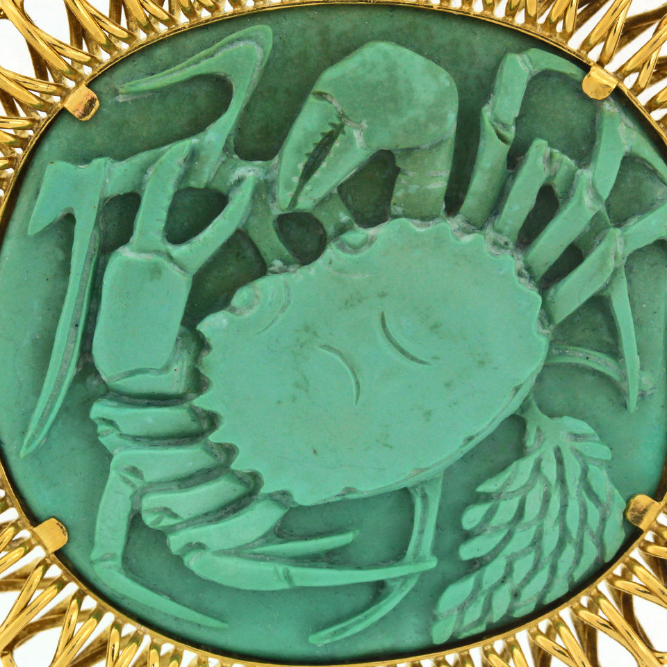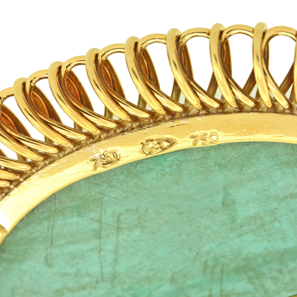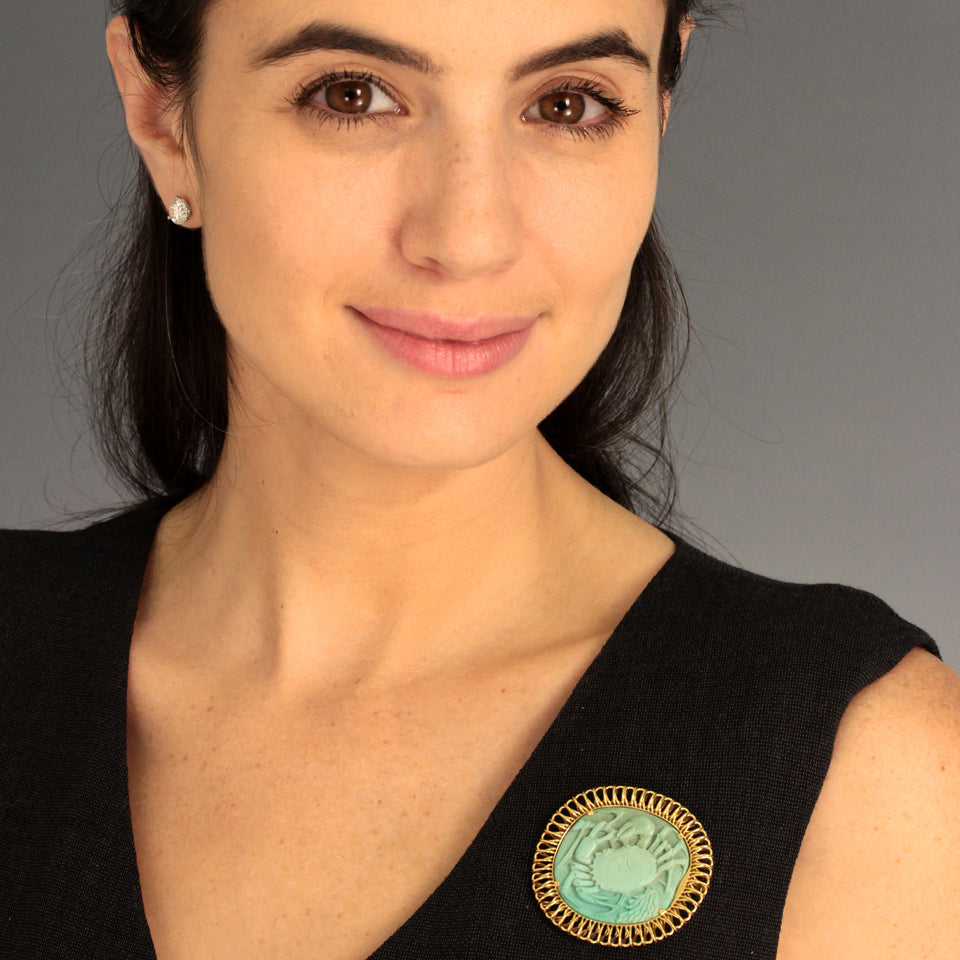 Circa 1930s, 18k, Swiss.  The turquoise carving in this wonderfully cosmopolitan brooch is Japanese from the late Meiji or Taisho periods, (so circa 1880s to 1900). Mounting antique fragments, especially Japanese or Chinese stone carvings in jewelry, was very popular in the Deco period. The silhouette motif of the 18k gold frame is meticulously hand fabricated.