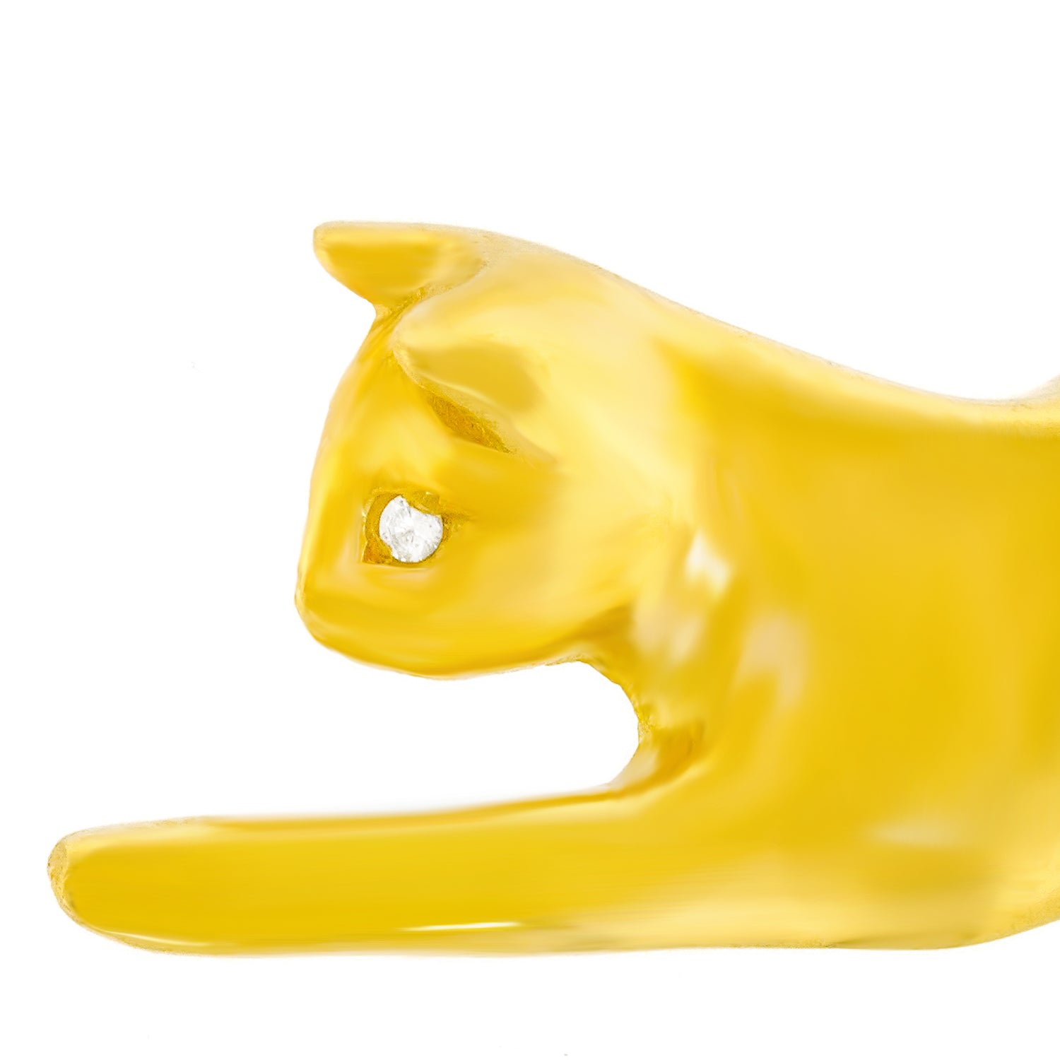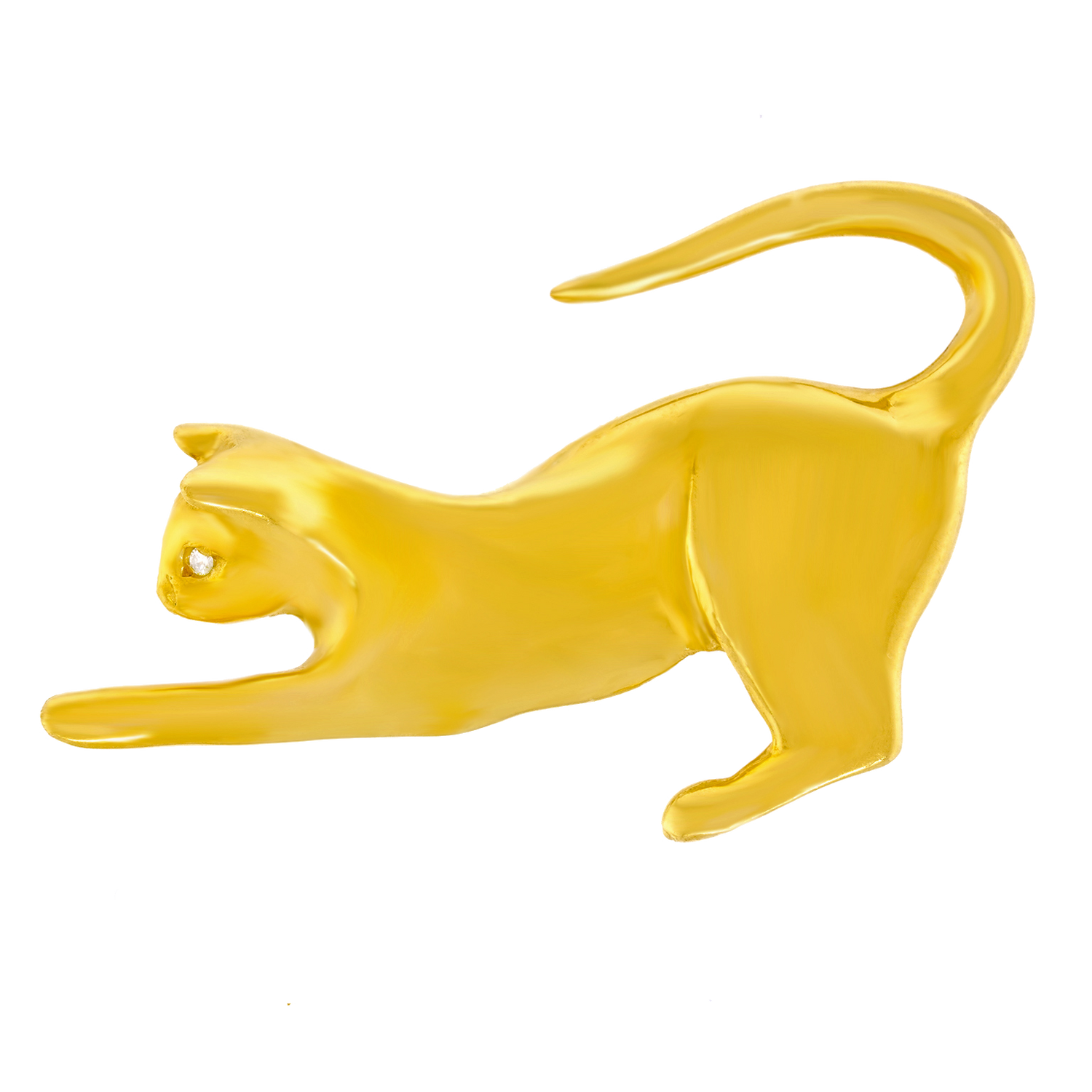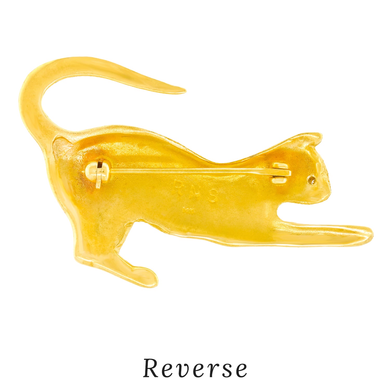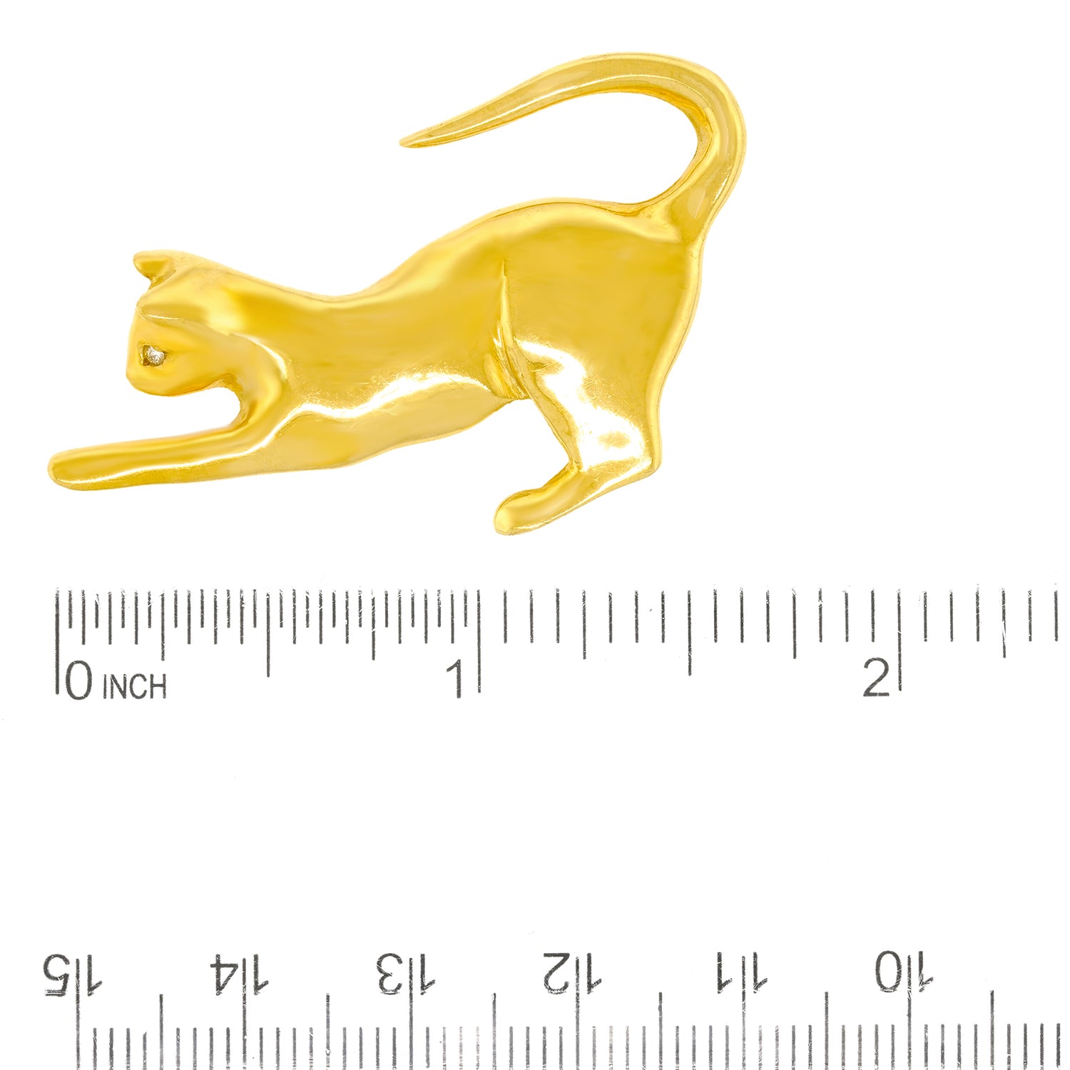 Circa 1970s, 14k, American. This whimsical cat brooch brings a playful element to any look. It features bright yellow gold construction with a diamond eye. Excellent condition.