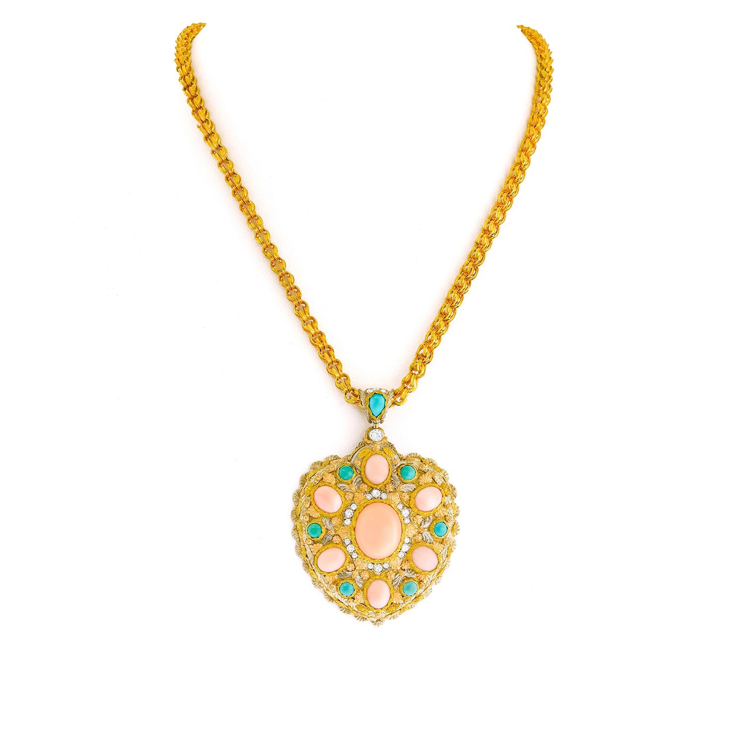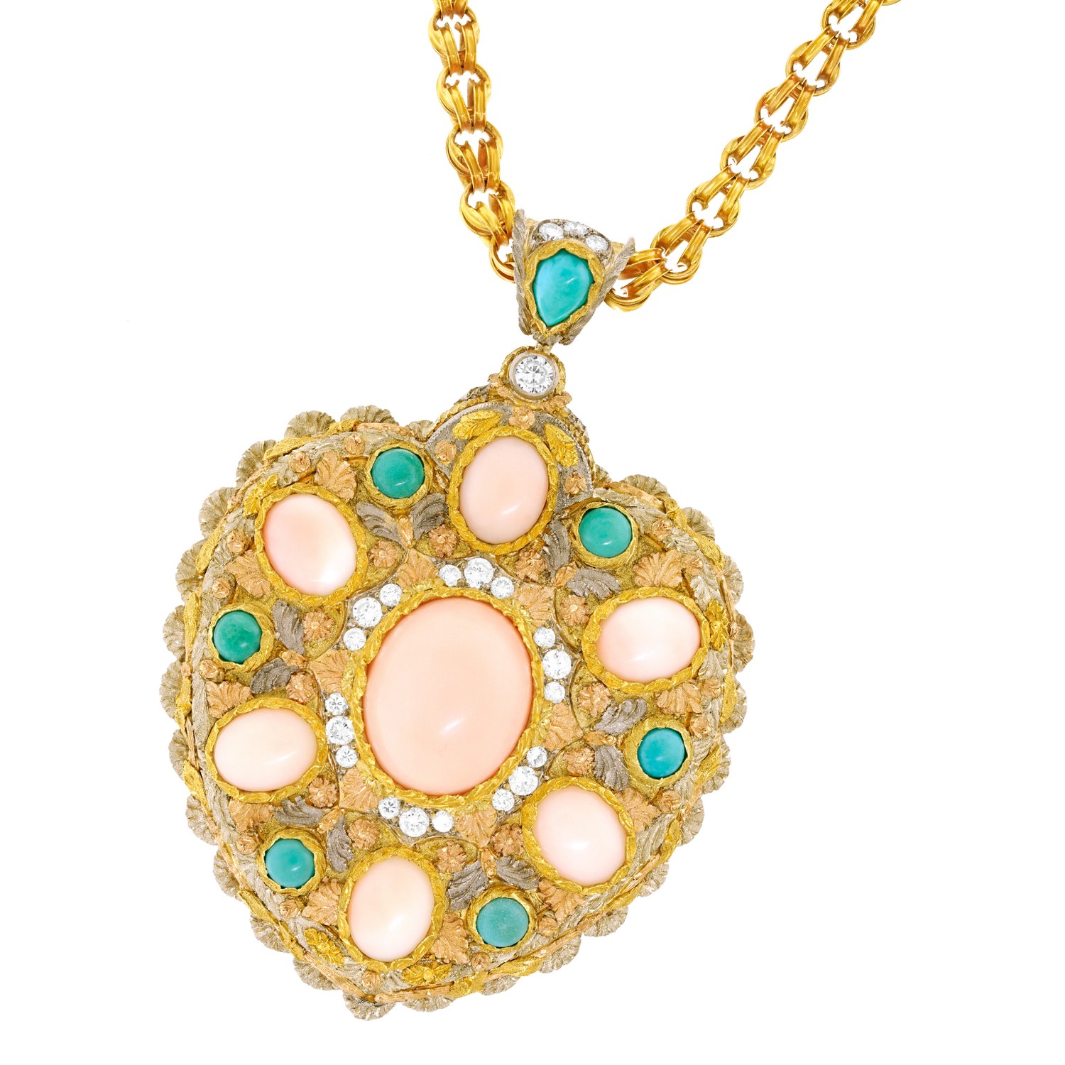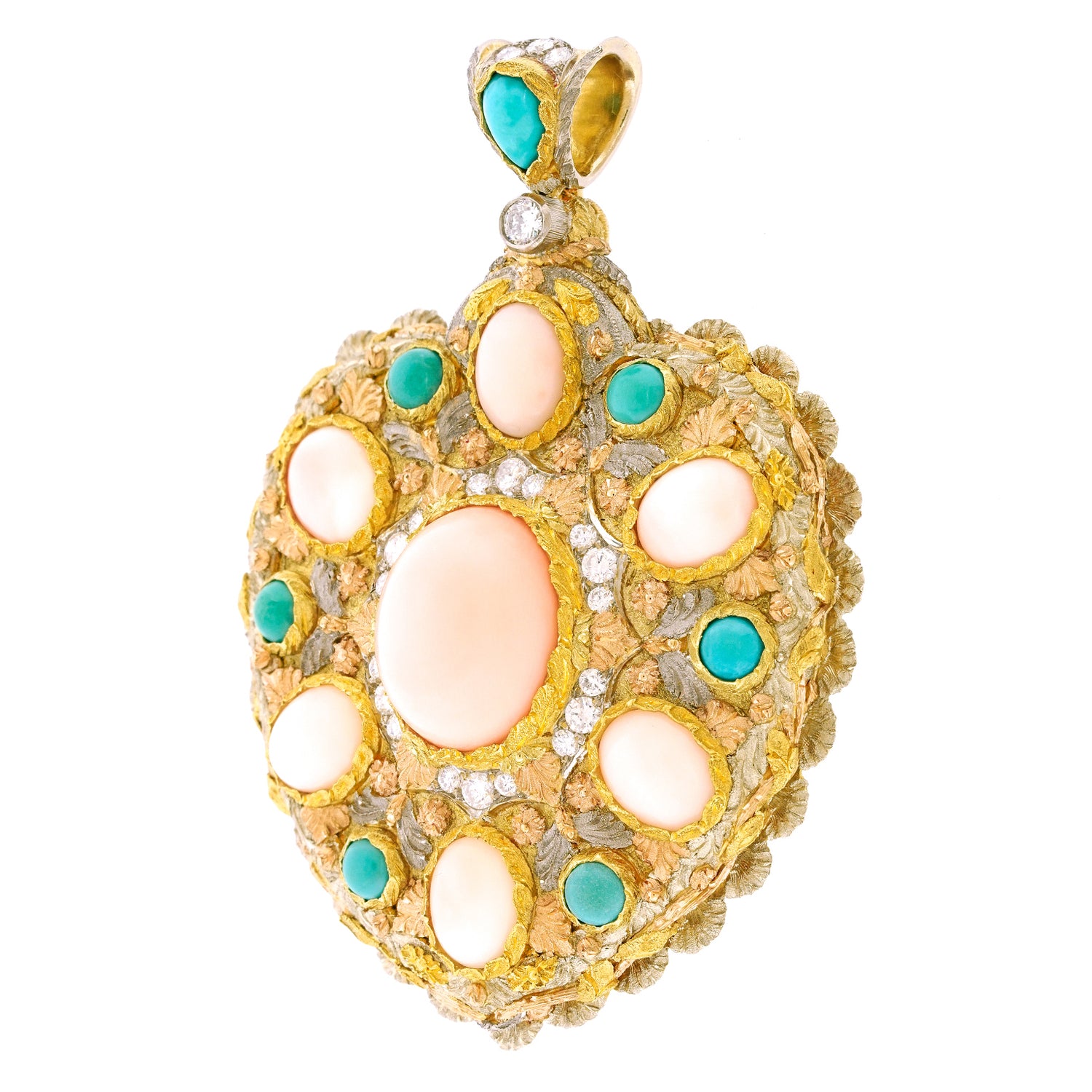 Circa 1960s, 18k, by Cazzaniga, Italy. This exquisitely detailed heart pendant is unlike any other. Handmade by the celebrated Roman firm Cazzaniga, it features striking design, underscored by meticulous fabrication. Adorned with golden flowers, white and rose gold leaves, it is replete with sublime hand-engraving. Fine coral and turquoise are set in the heart, and fine white diamonds add sparkle. Founded in 1929, Cazzaniga’s salon is now by appointment only, continuing to create one-of-a-kind pieces for a select clientele.