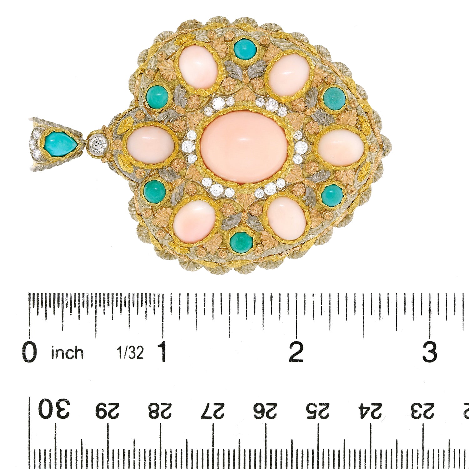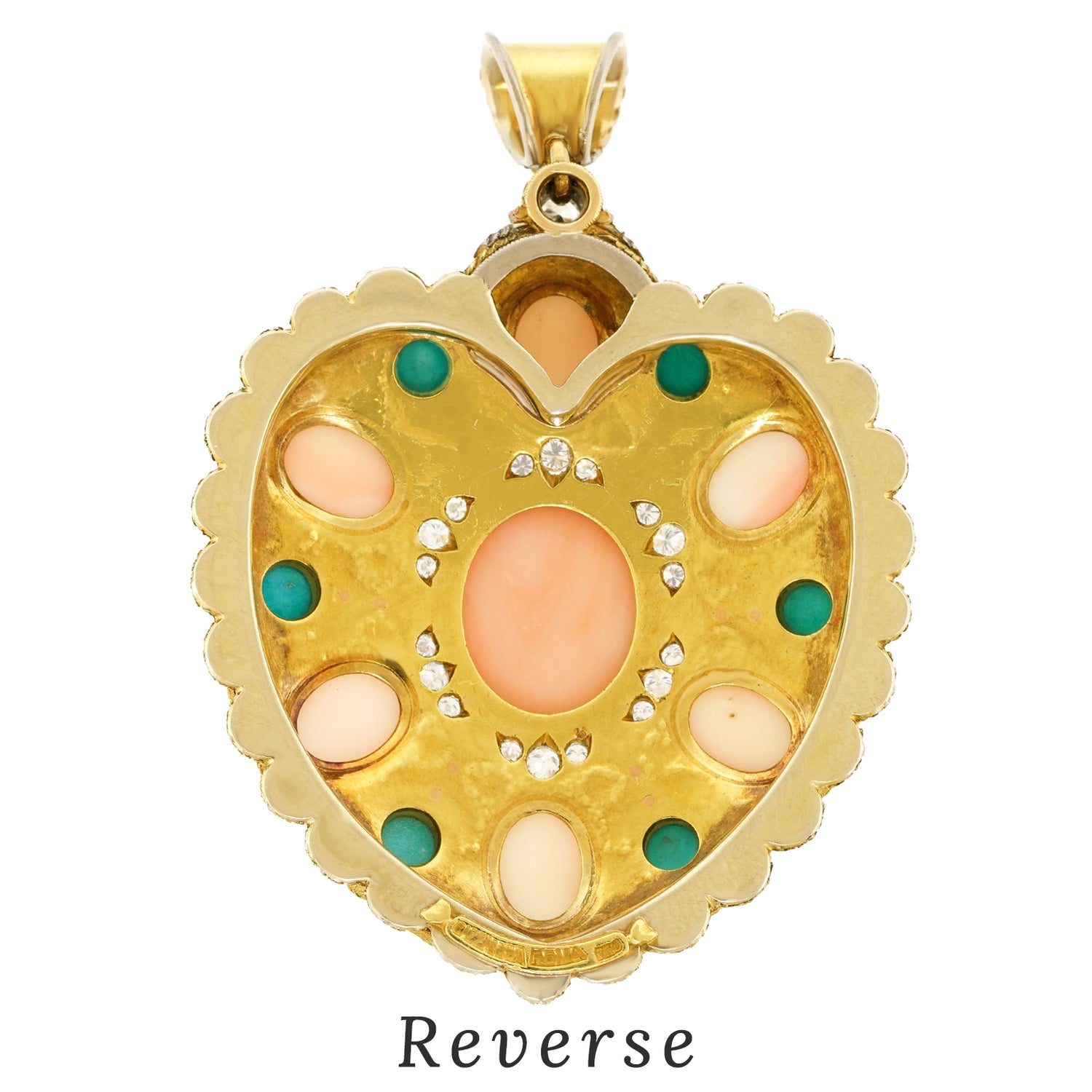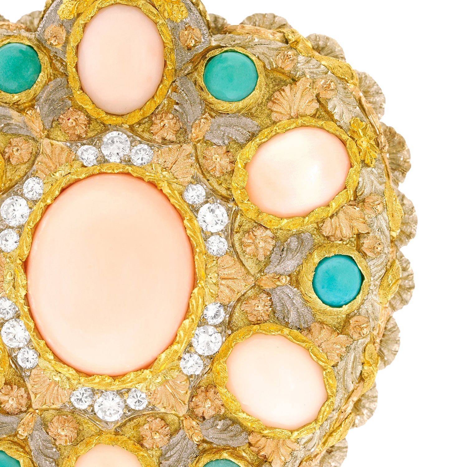Circa 1960s, 18k, by Cazzaniga, Italy. This exquisitely detailed heart pendant is unlike any other. Handmade by the celebrated Roman firm Cazzaniga, it features striking design, underscored by meticulous fabrication. Adorned with golden flowers, white and rose gold leaves, it is replete with sublime hand-engraving. Fine coral and turquoise are set in the heart, and fine white diamonds add sparkle. Founded in 1929, Cazzaniga’s salon is now by appointment only, continuing to create one-of-a-kind pieces for a select clientele.