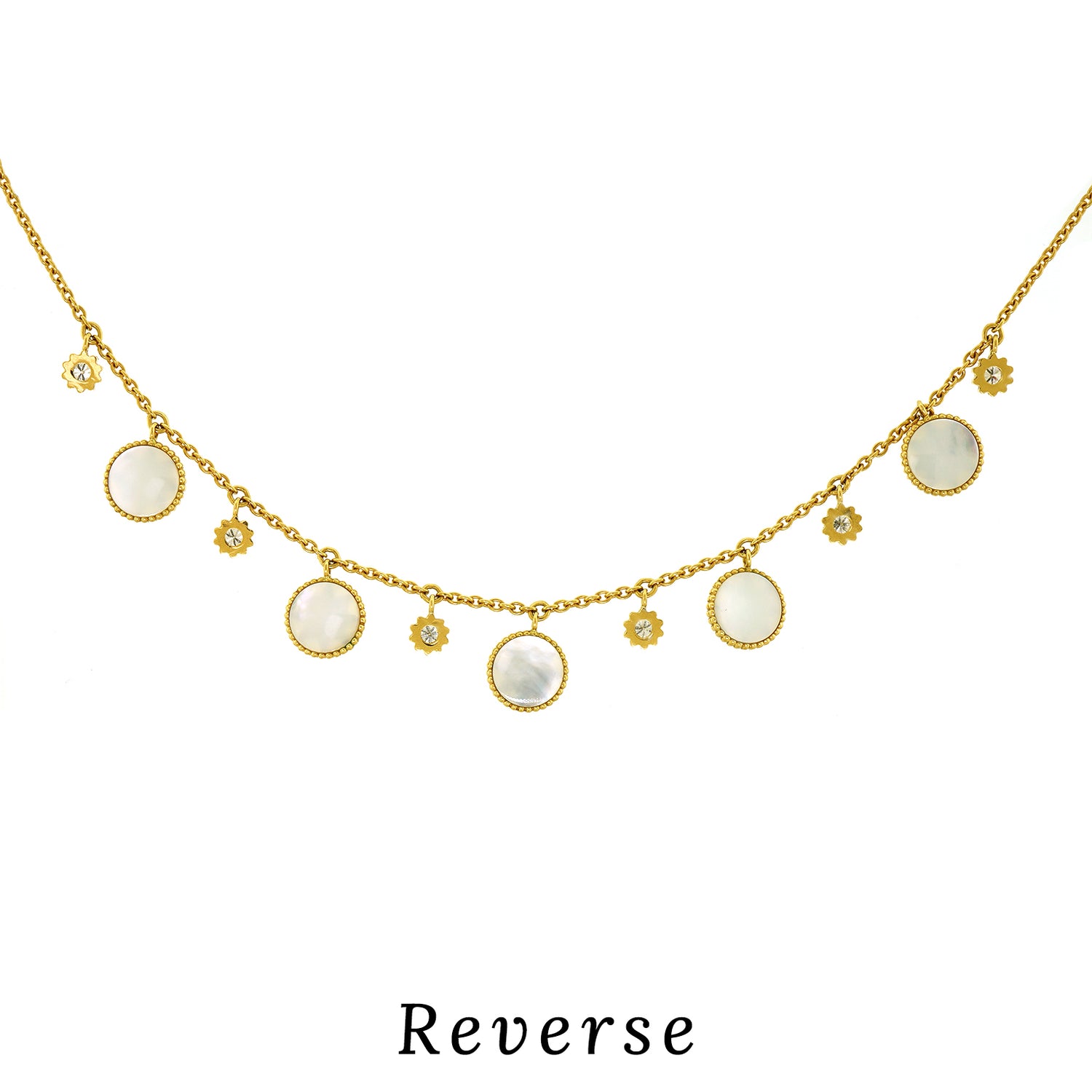 Circa 2000s, 18k, by Victoire de Castellane for Dior, France. Victoire de Castellane's eight-point star-on-star design for necklaces is a fashion success. Her work is instantly recognizable, fresh, playful, and expressive. This 17-inch long example features five of Mr. Dior's "Lucky Stars" with a reverse of soft pink mother of pearl. Instant signature style, wear it on its own or with long chains for a multiples look. Excellent condition.