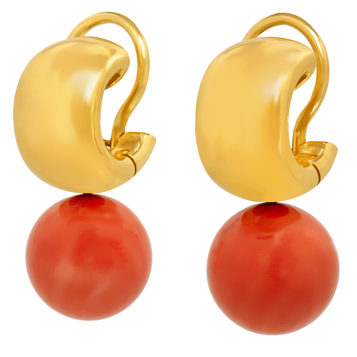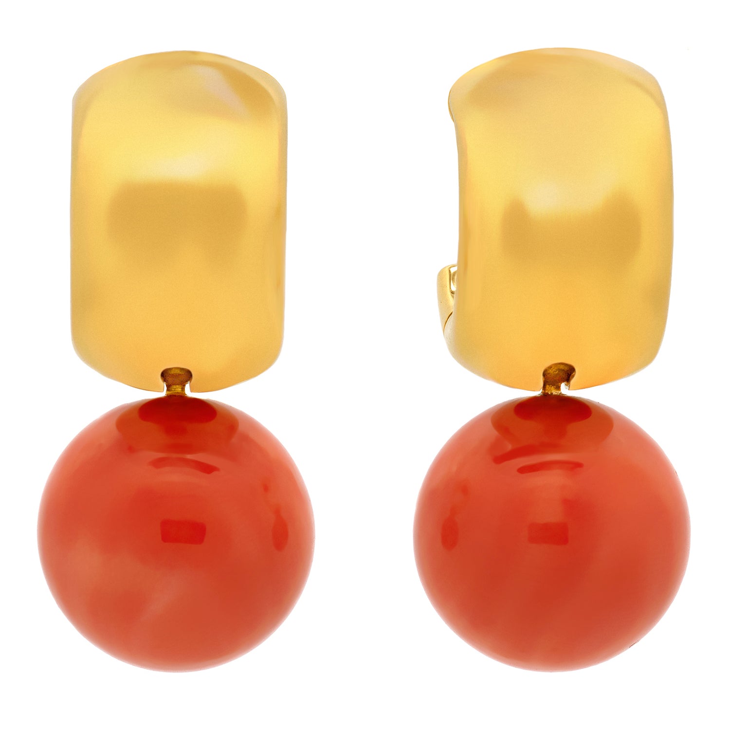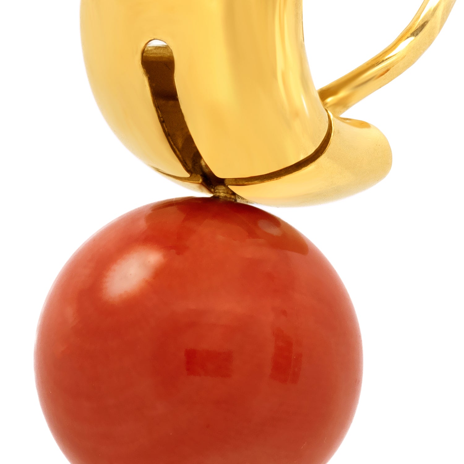 Circa 1970s, 18k, Switzerland. These fabulous seventies earrings have a stylishly chic, brilliantly modern style. Bright red coral orbs are suspended from a wide curvilinear polished eighteen-karat yellow gold element. With quality craftsmanship found throughout, they are a delight to wear. Excellent condition.