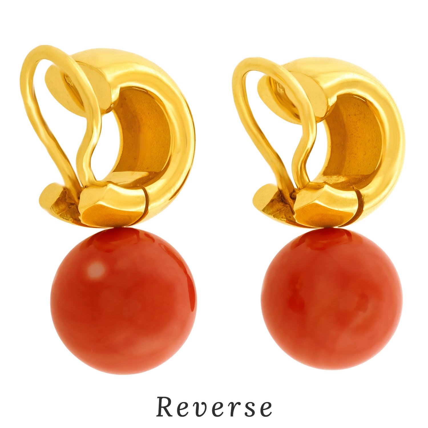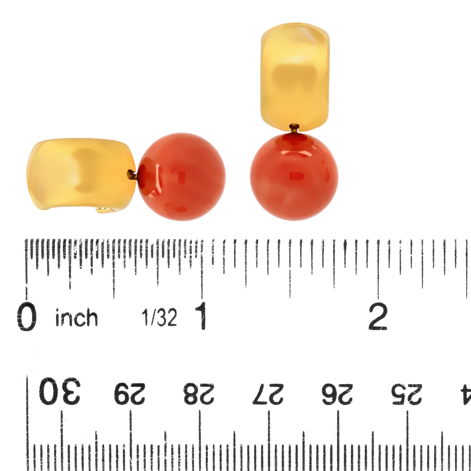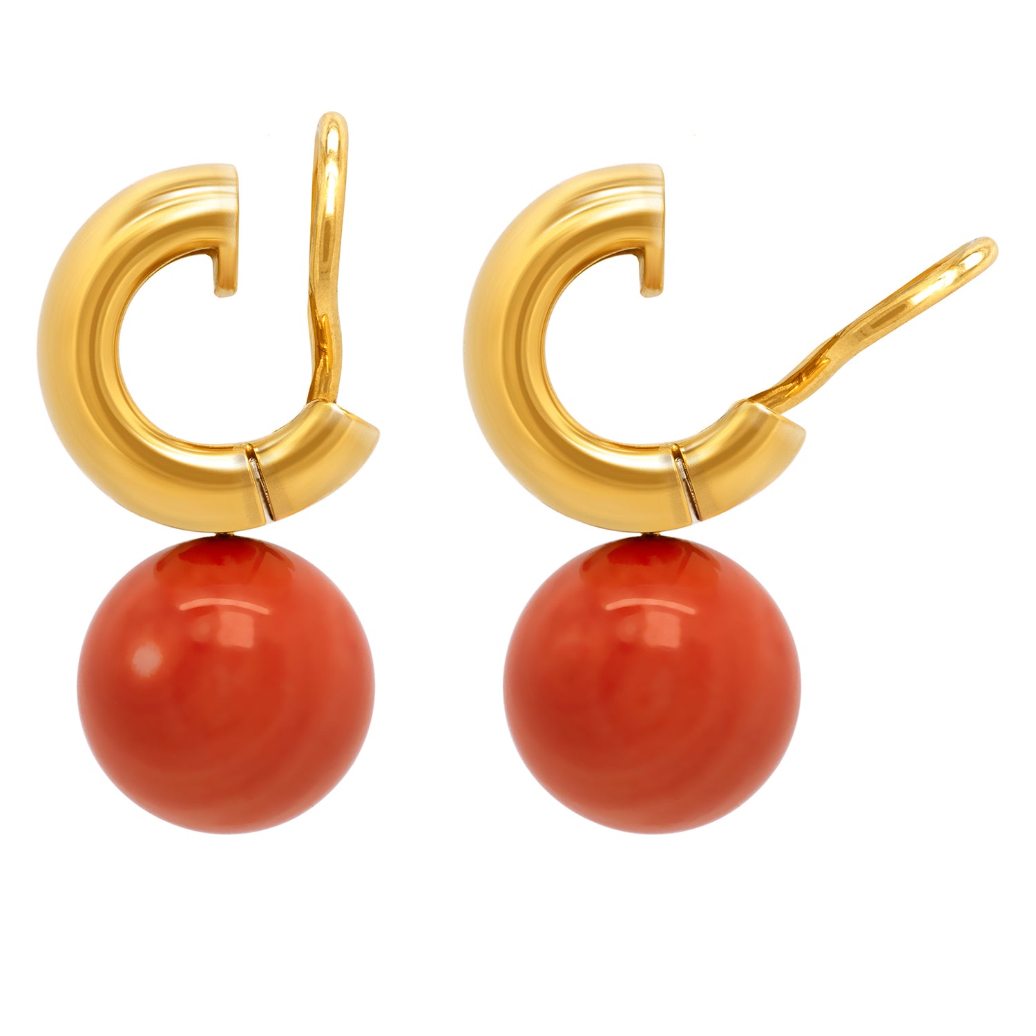 Circa 1970s, 18k, Switzerland. These fabulous seventies earrings have a stylishly chic, brilliantly modern style. Bright red coral orbs are suspended from a wide curvilinear polished eighteen-karat yellow gold element. With quality craftsmanship found throughout, they are a delight to wear. Excellent condition.