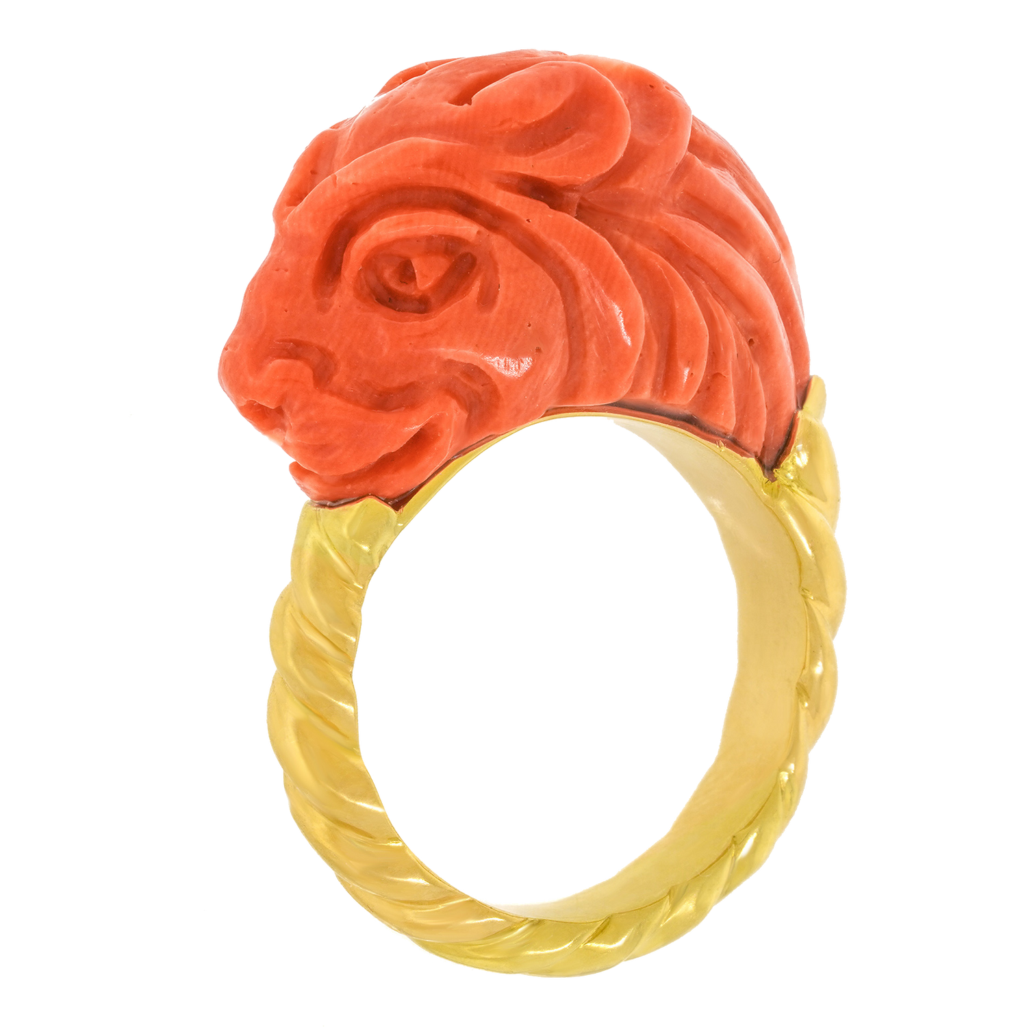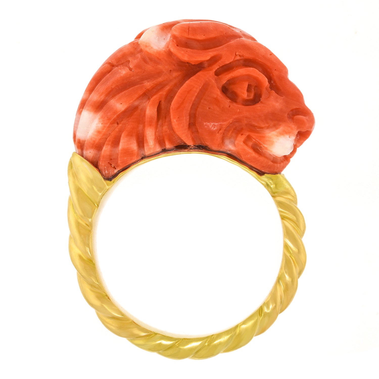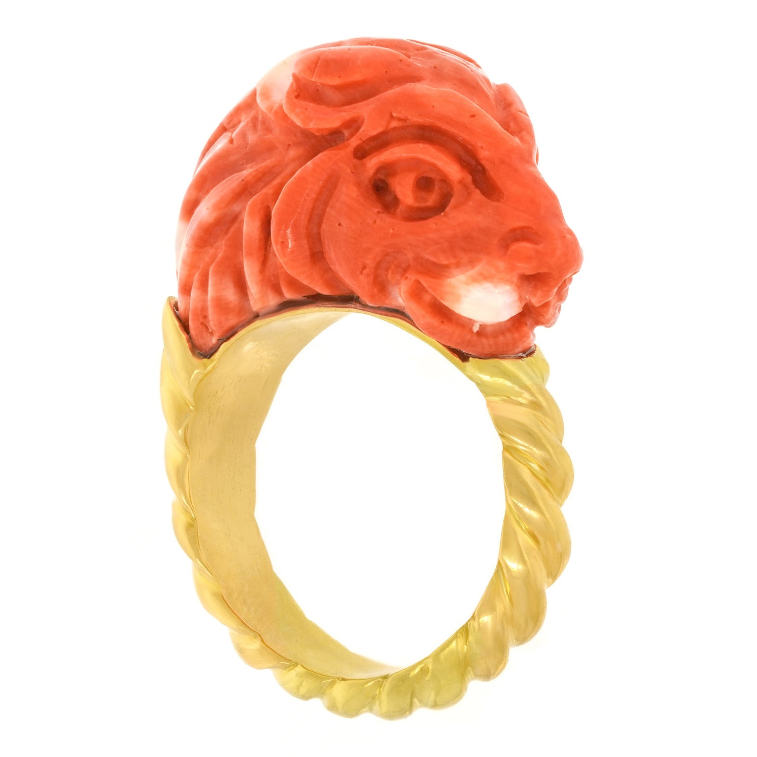 Circa 1960s, 18k, Switzerland.  Carved in vividly hued coral, this ring features a classic Roman-style leopard (lion) set on an 18-karat yellow gold rope twist ring. The look is poolside at your 2000-year-old Sicilian Villa or cocktails with your favorite Contessa!  Excellent condition.