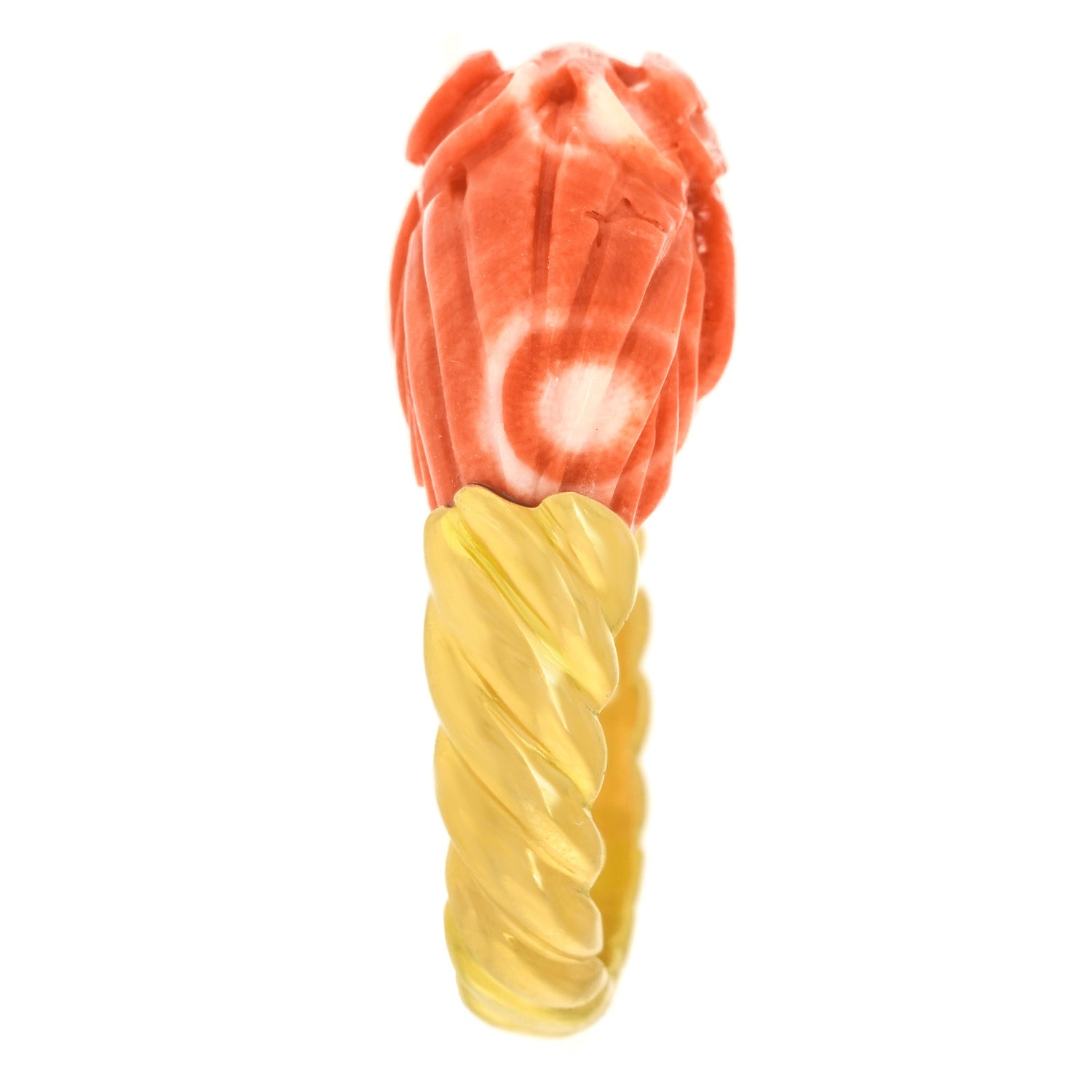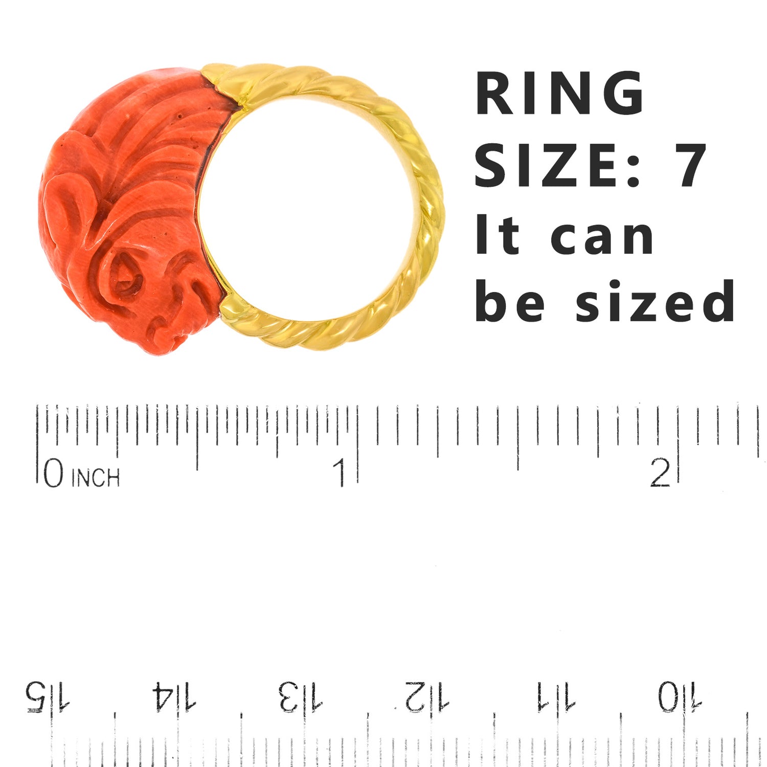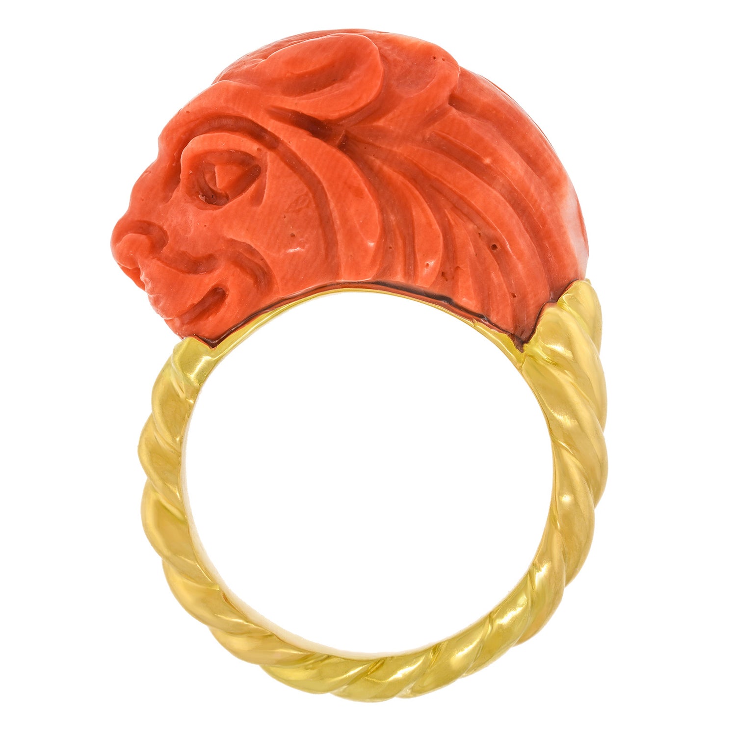 Circa 1960s, 18k, Switzerland.  Carved in vividly hued coral, this ring features a classic Roman-style leopard (lion) set on an 18-karat yellow gold rope twist ring. The look is poolside at your 2000-year-old Sicilian Villa or cocktails with your favorite Contessa!  Excellent condition.
