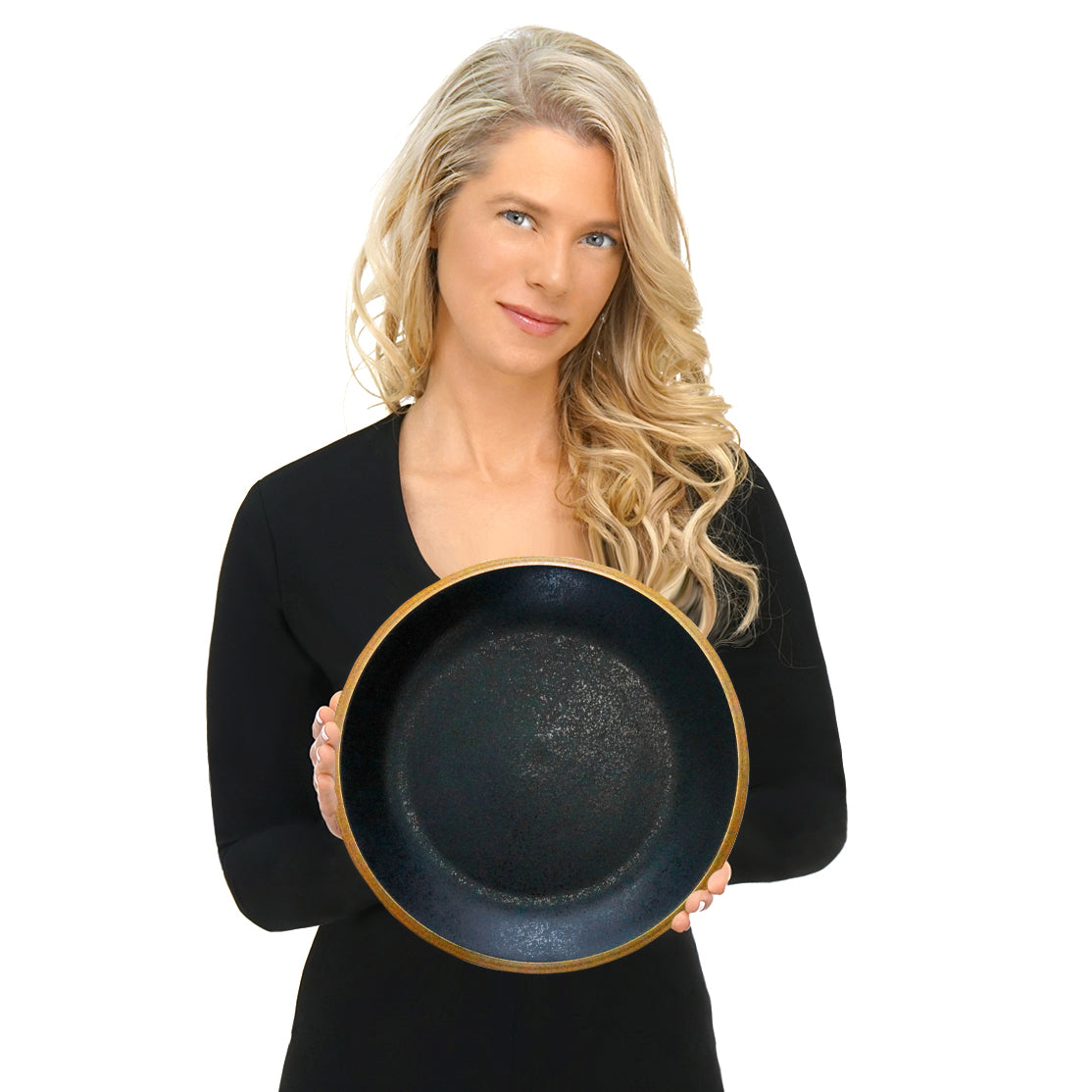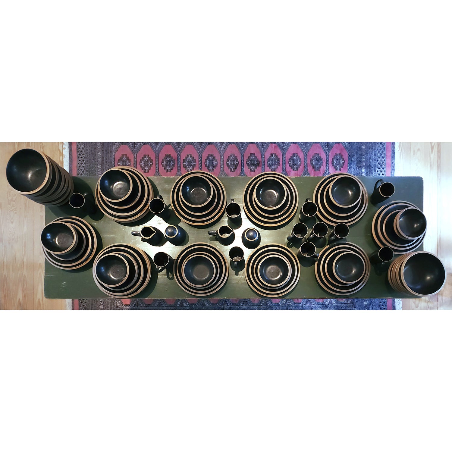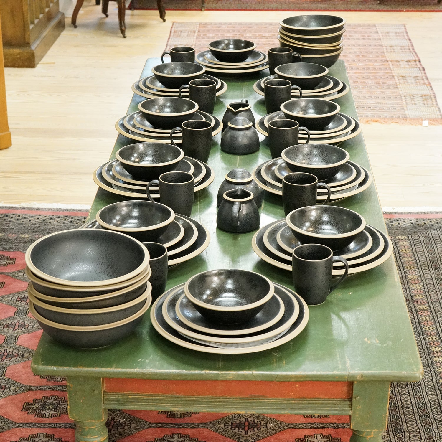 Circa 2000, by Dansk, American. This unique, extra complete set for 12 of Santiago Black is everyday dinnerware perfection. In addition to all the normal pieces, this set has twelve 12 inch serving platters as chargers and twelve 9 inch serving bowls for pasta bowls. Perfect for your million-dollar-farm house, this collection is known for the understated look and durability of Dansk stoneware. Excellent condition.