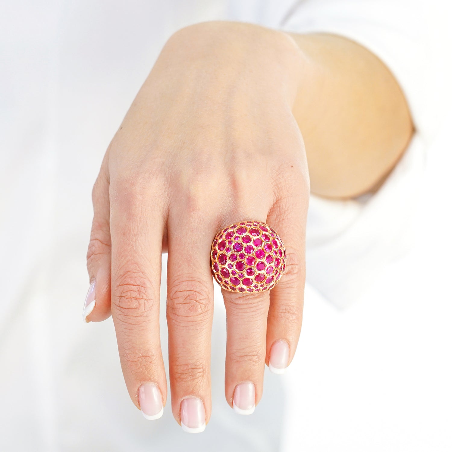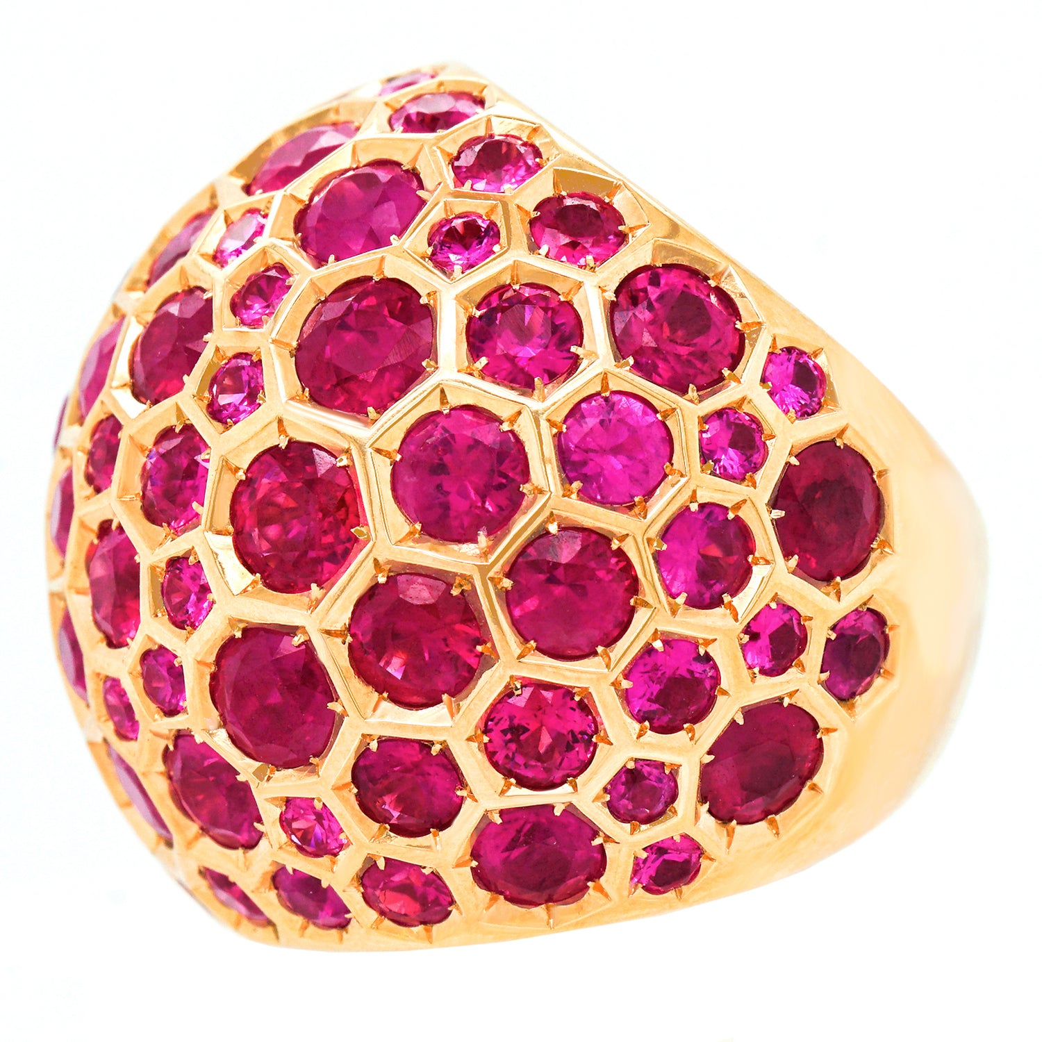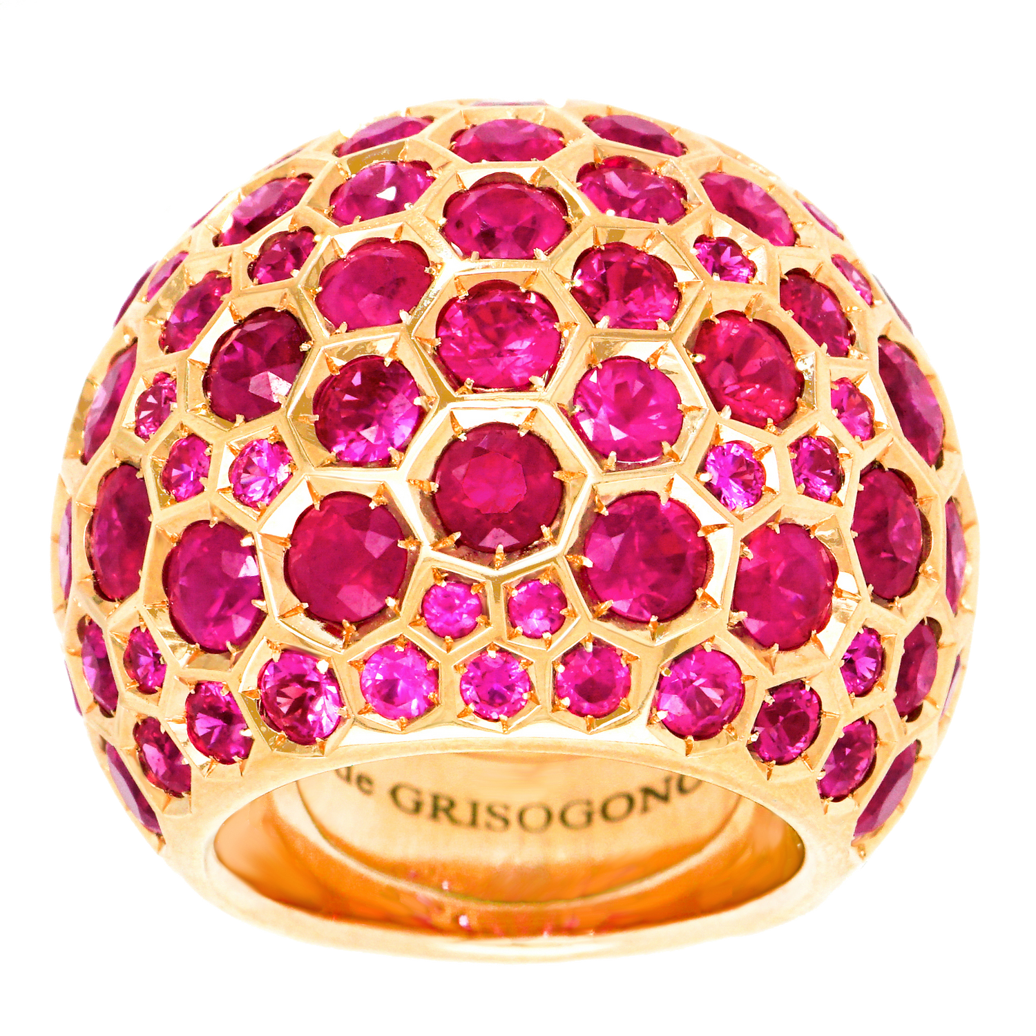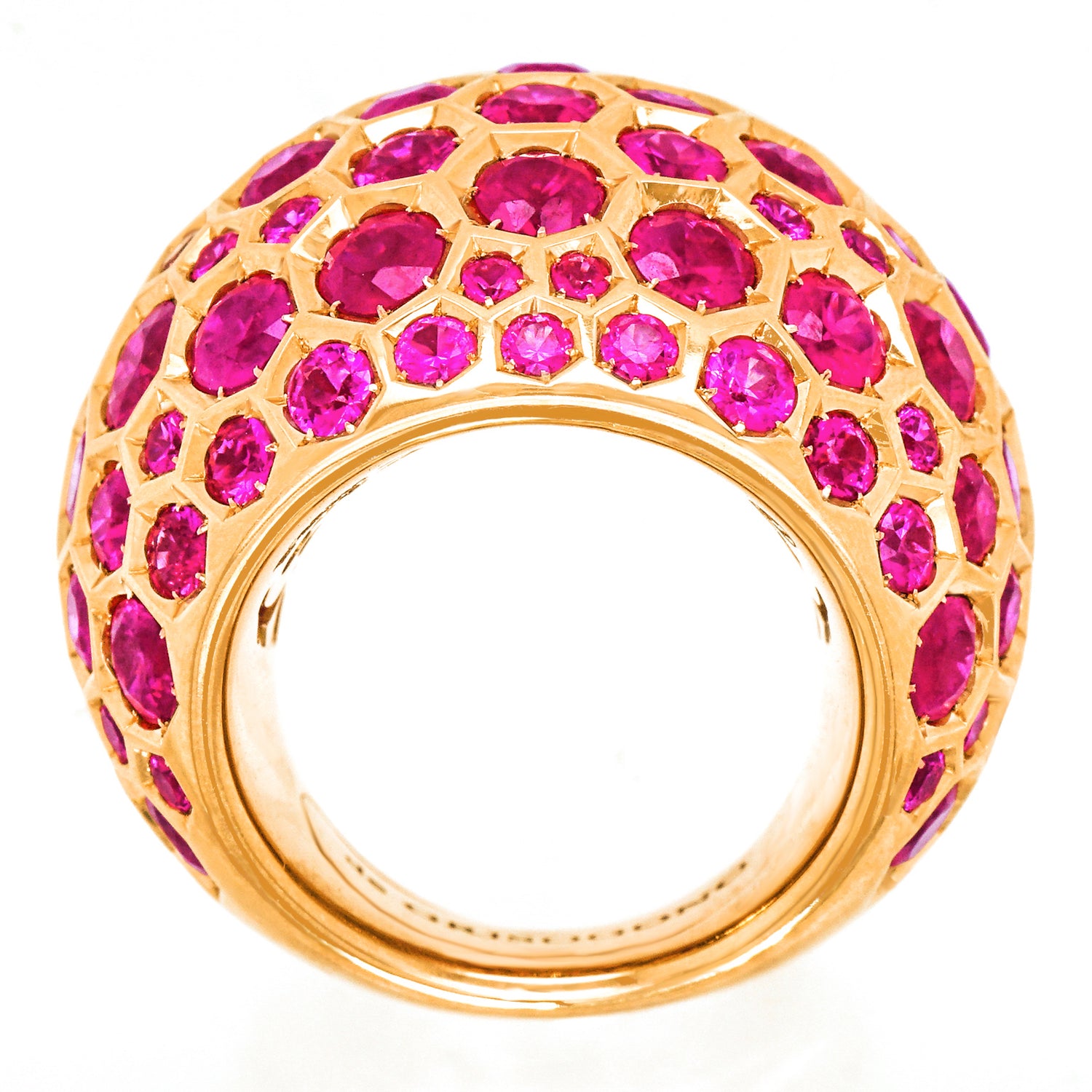 Circa 2000s, 18k, by de Grisogono, Genève, Switzerland. Color, color, COLOR! This decadently glamorous bombe ring sparkles with 15.0 carats of delicately-hued pink sapphire and ruby. This ring flaunts the dramatic over-the-top style that French fashion is famous for. Meticulously designed and superbly made, it is in excellent condition.