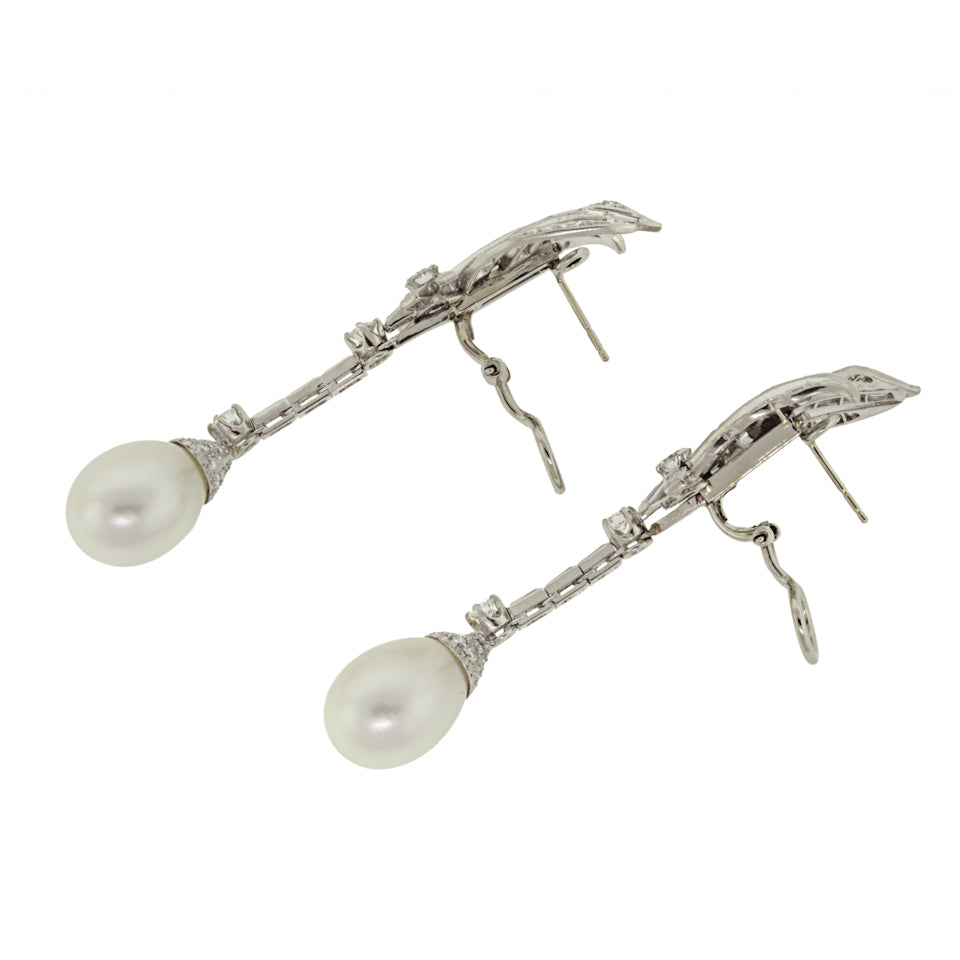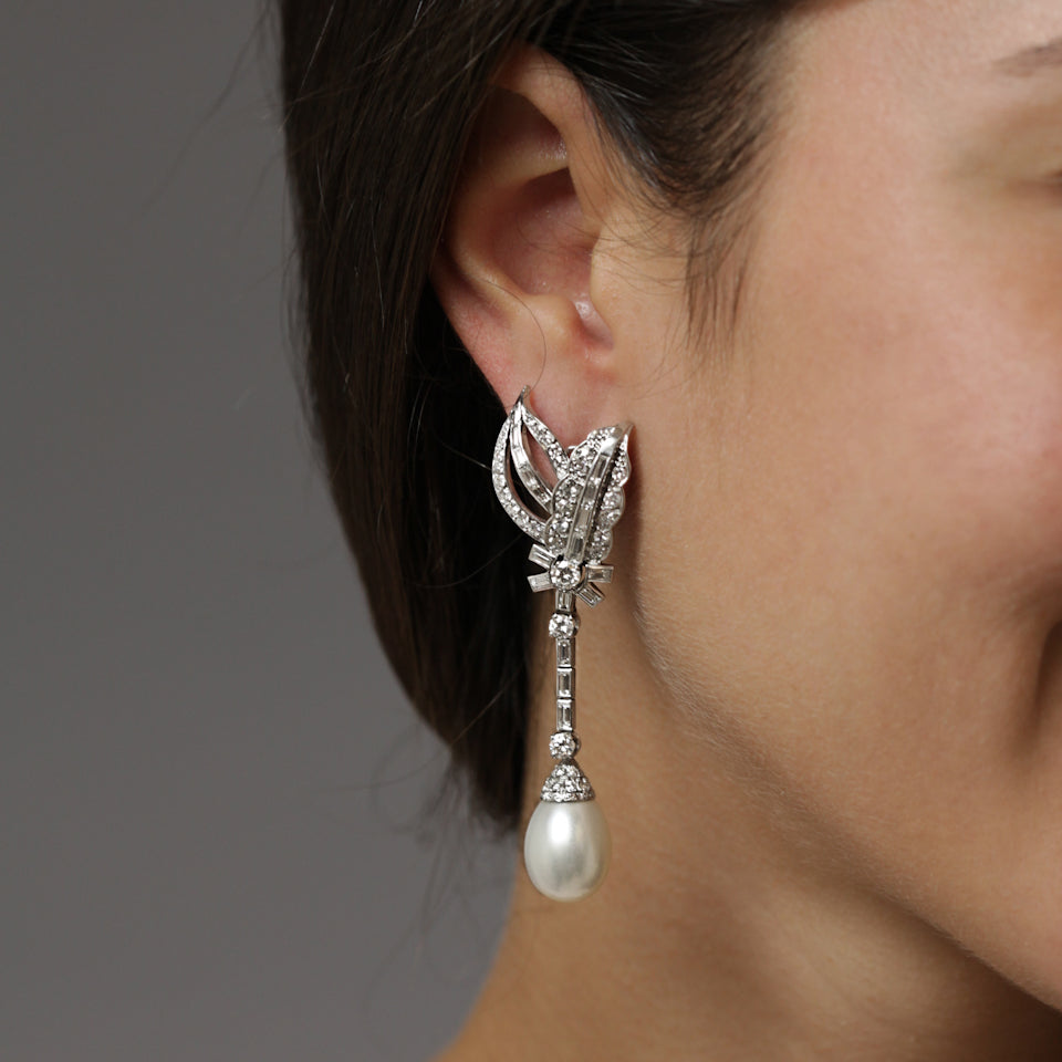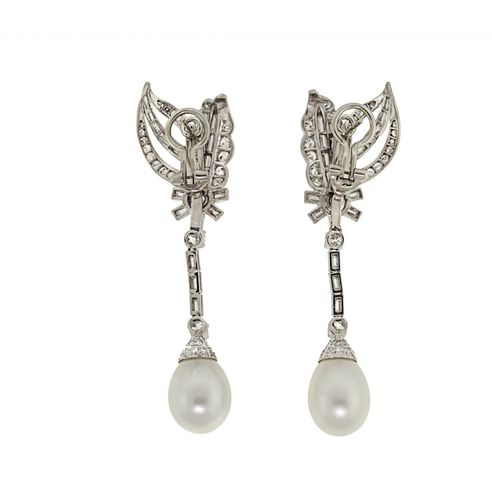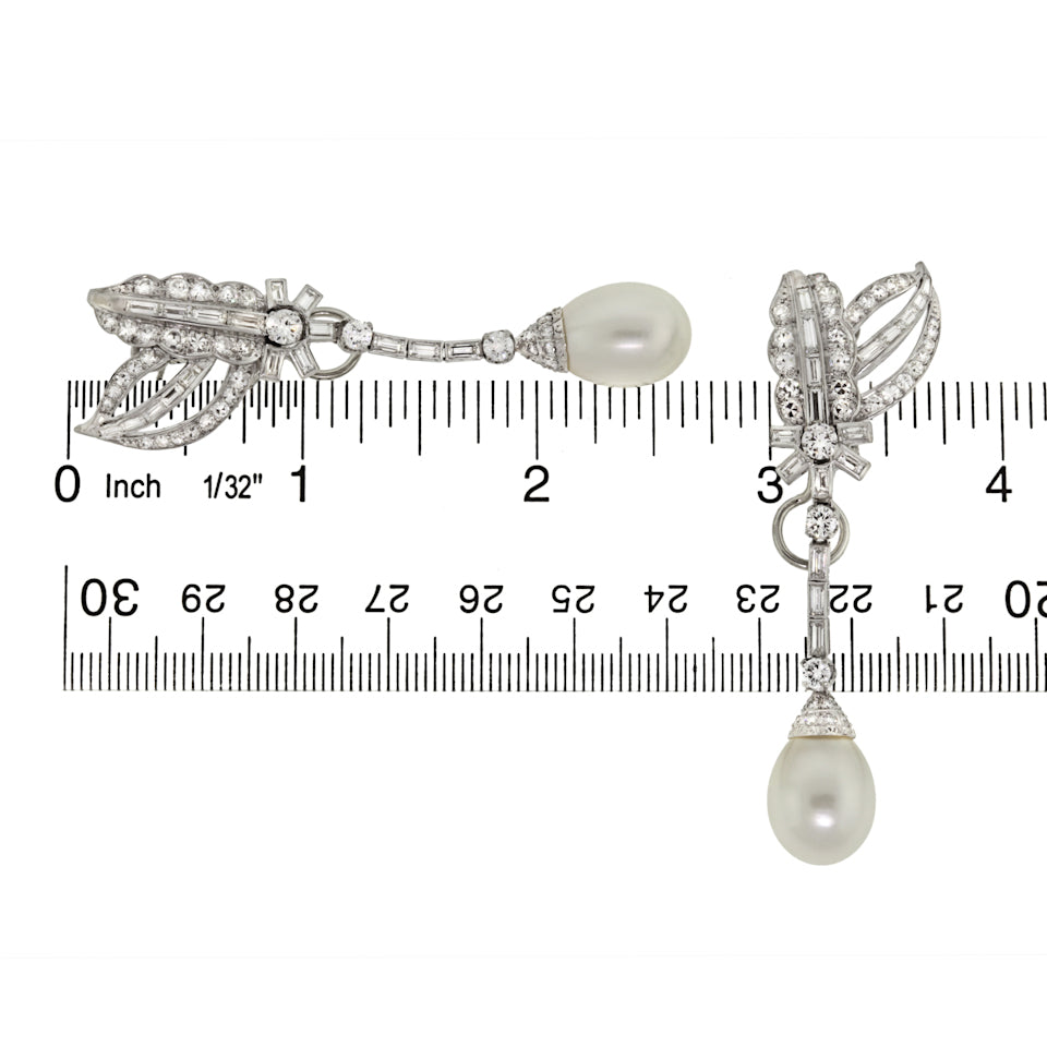 Circa 1950s, 18k. Swiss. A fine example of what the elegantly dressed woman wore in the 1950's. These earrings are exceptionally well made with luminescent natural cultured pearl drops and 5.0 carats of sublime white diamonds. Perfect for any formal occasion, they are simply fabulous. Excellent condition.  Restoration to the findings noted.