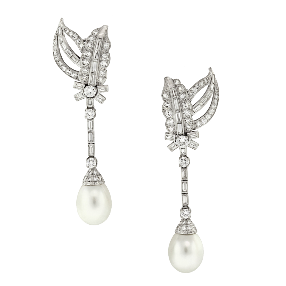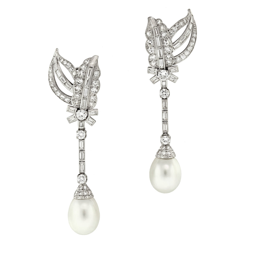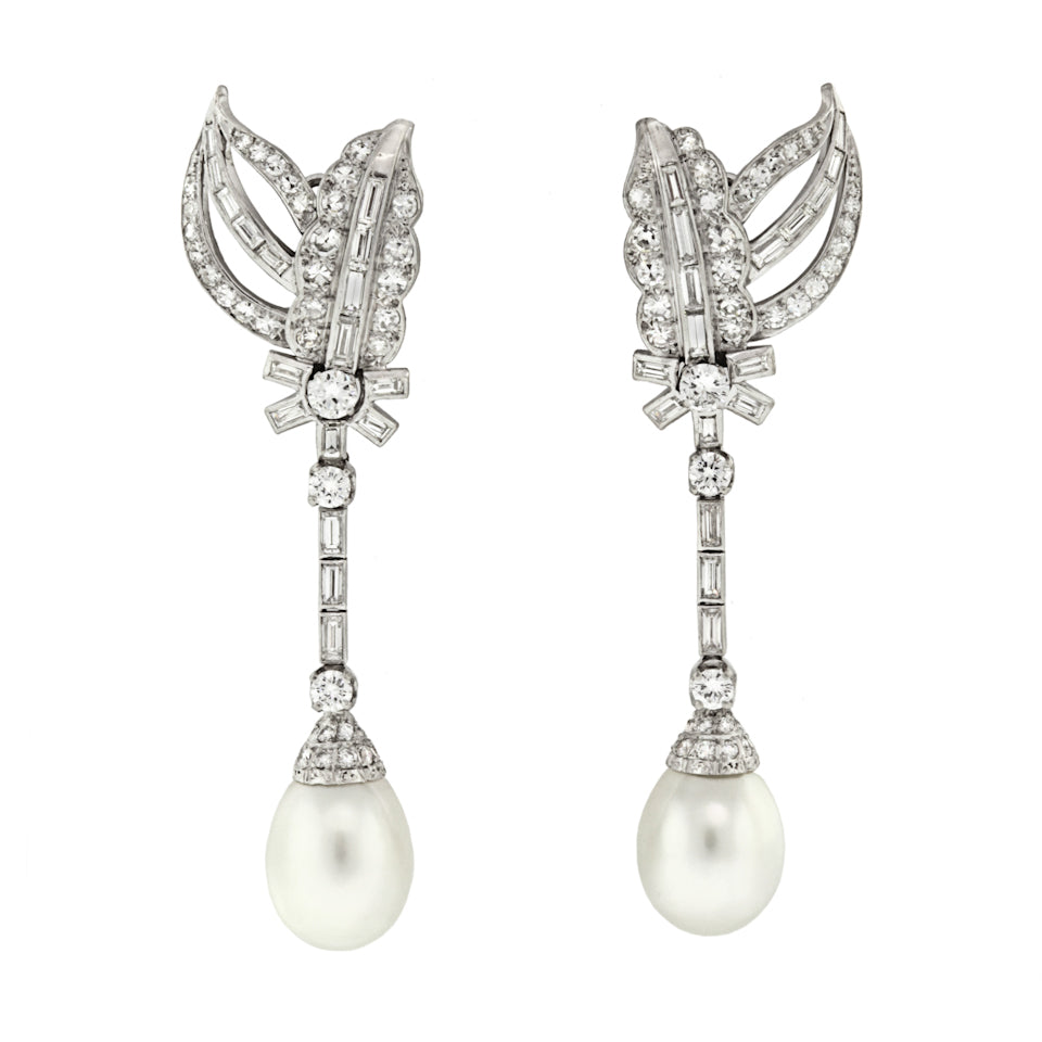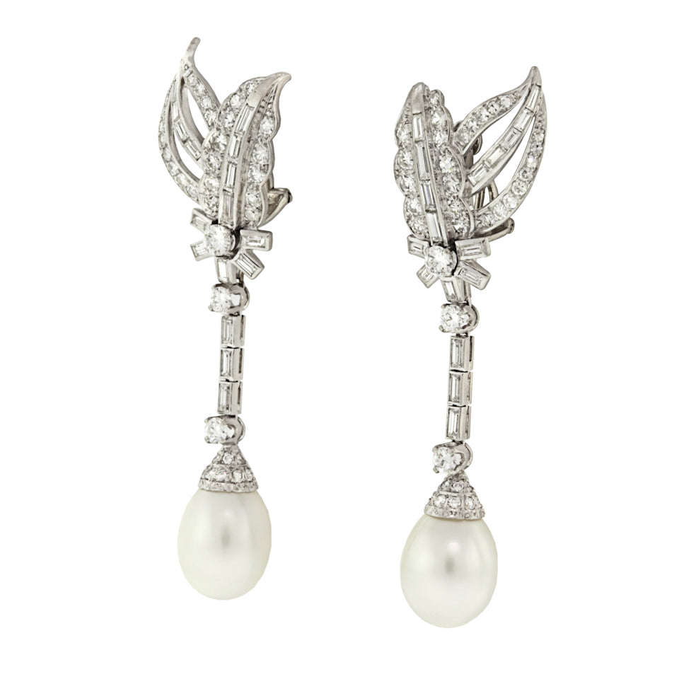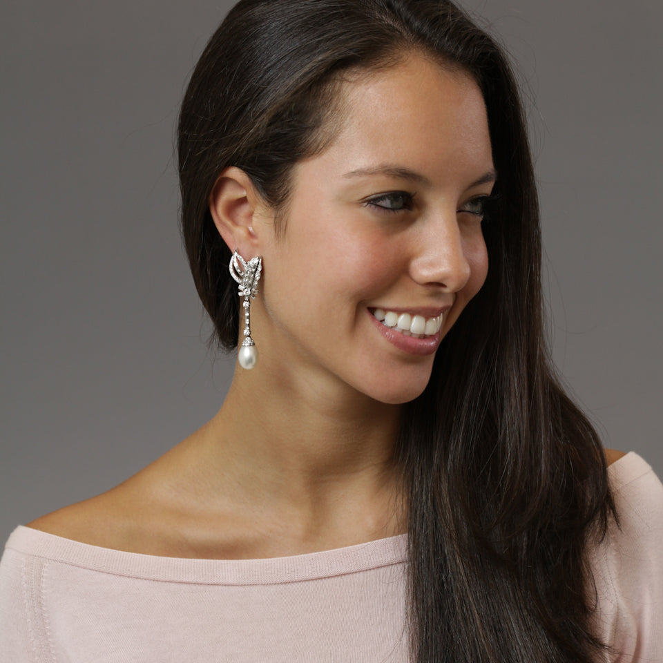 Circa 1950s, 18k. Swiss. A fine example of what the elegantly dressed woman wore in the 1950's. These earrings are exceptionally well made with luminescent natural cultured pearl drops and 5.0 carats of sublime white diamonds. Perfect for any formal occasion, they are simply fabulous. Excellent condition.  Restoration to the findings noted.