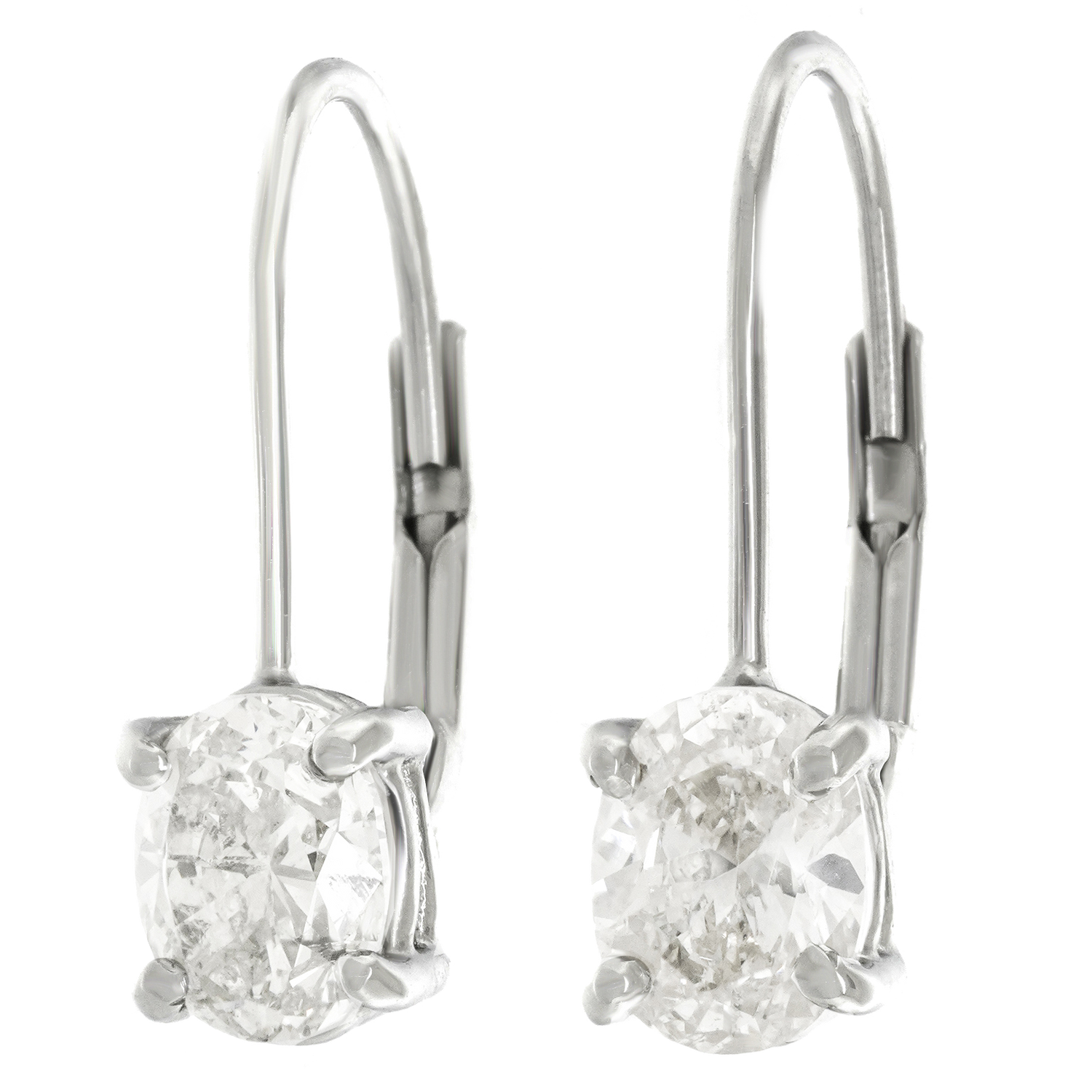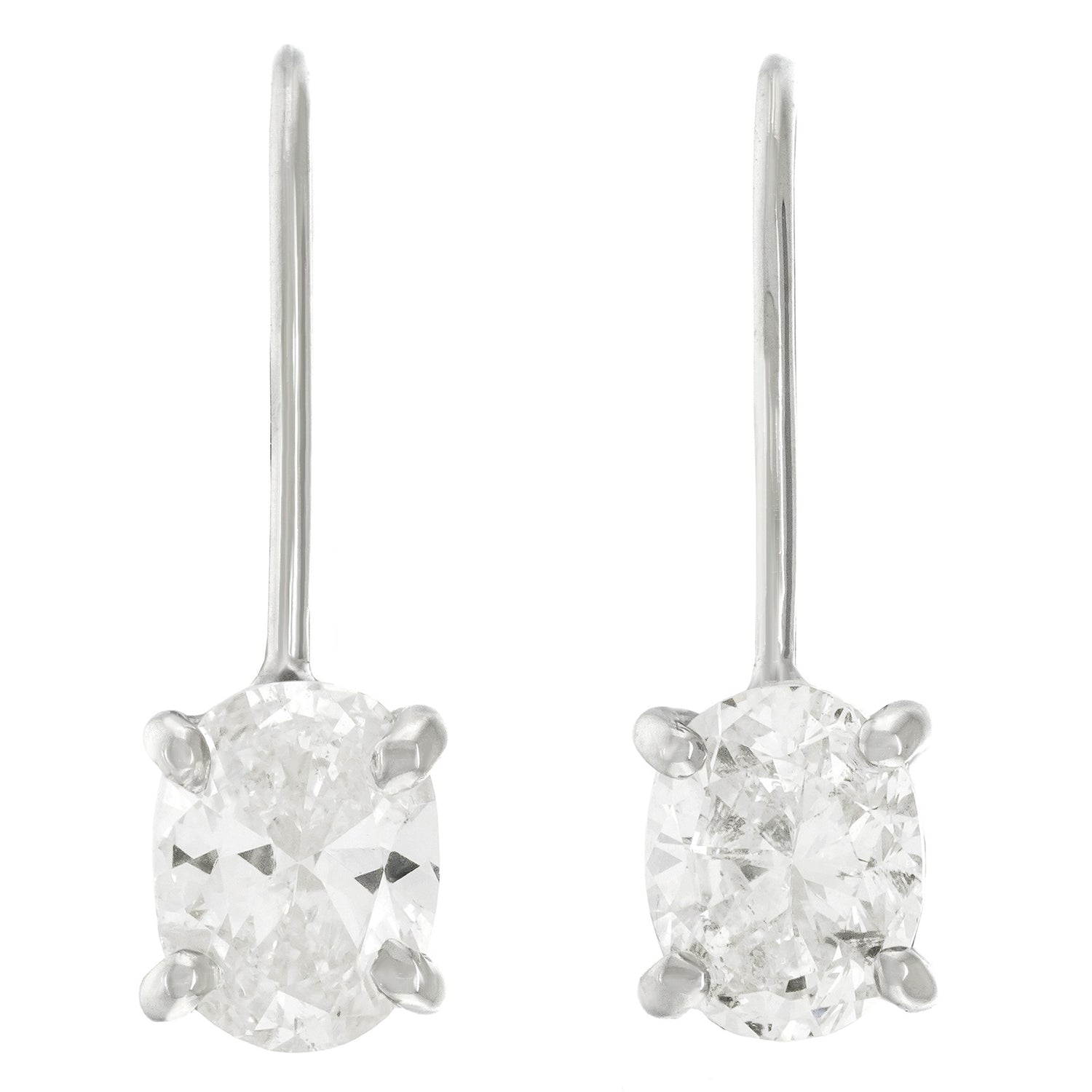 Circa 2000s, 18k, American.   Set with two brilliant oval-shaped diamonds, these Victorian-style drop earrings are charmingly elegant. Finely fashioned in 18k white gold, they effortlessly go from casual to dressy. The vintage diamonds are .69ct H color, SI1 clarity, and .70ct I color, SI2 clarity. Excellent condition. The repurposed diamonds are estate.