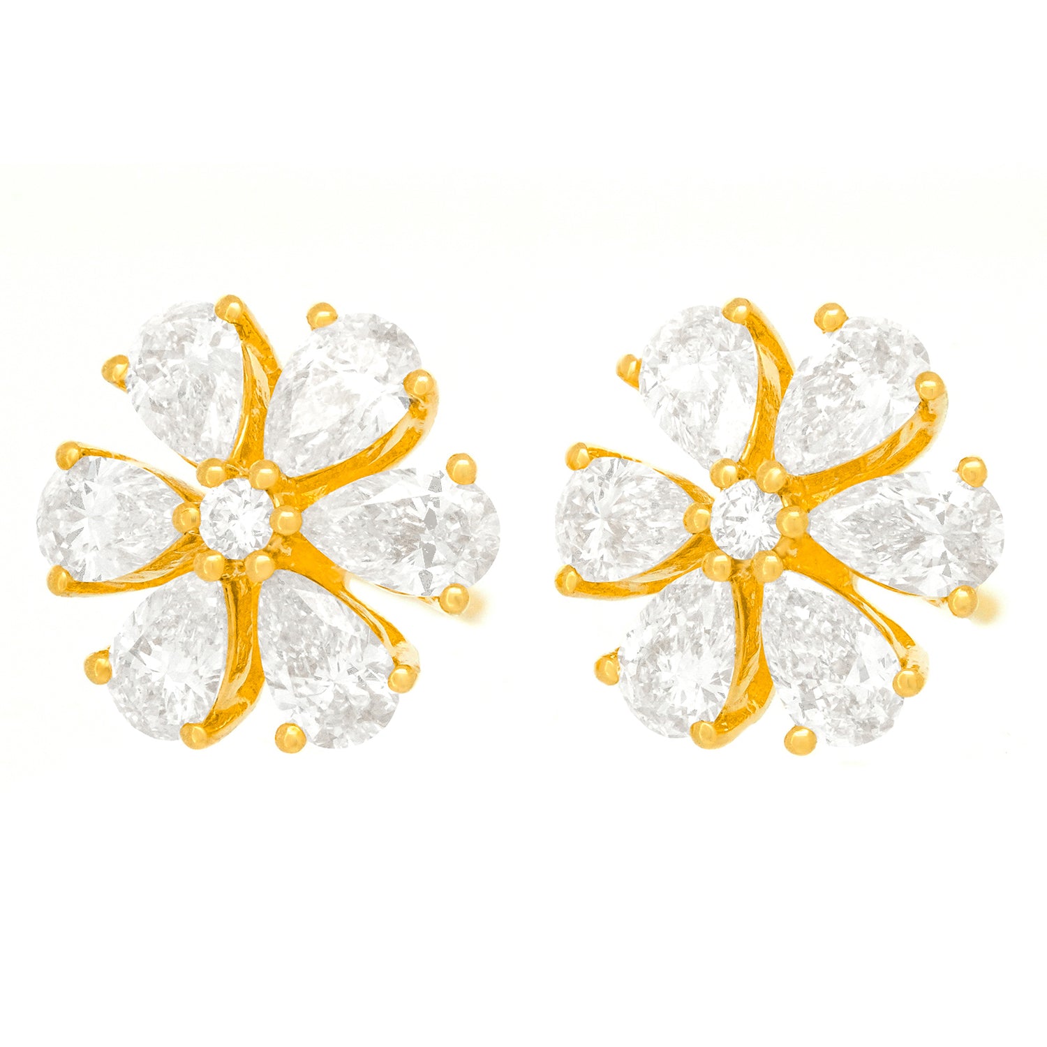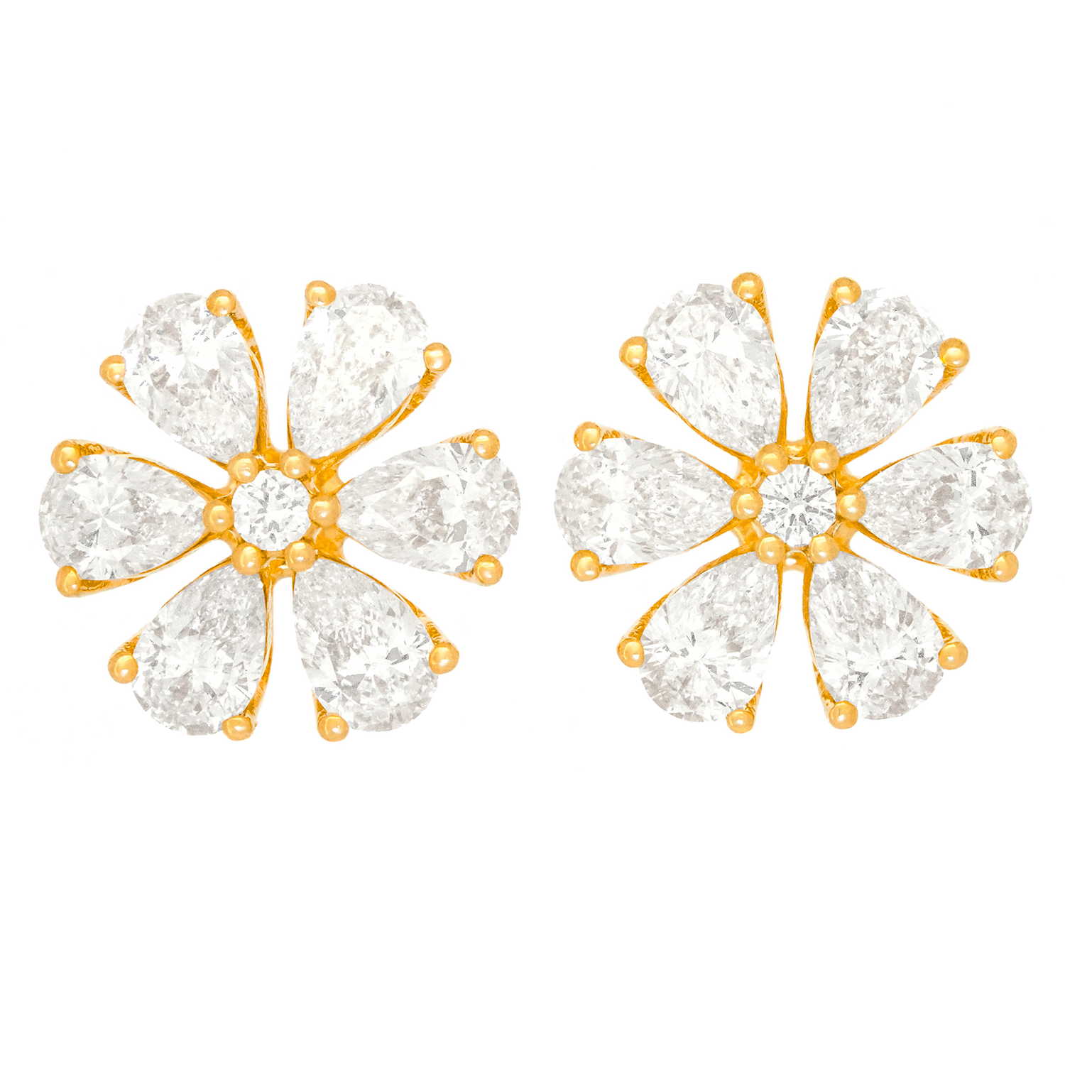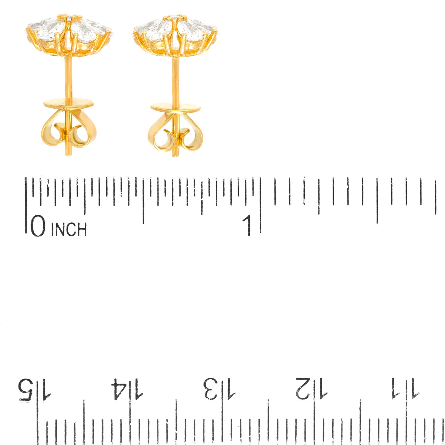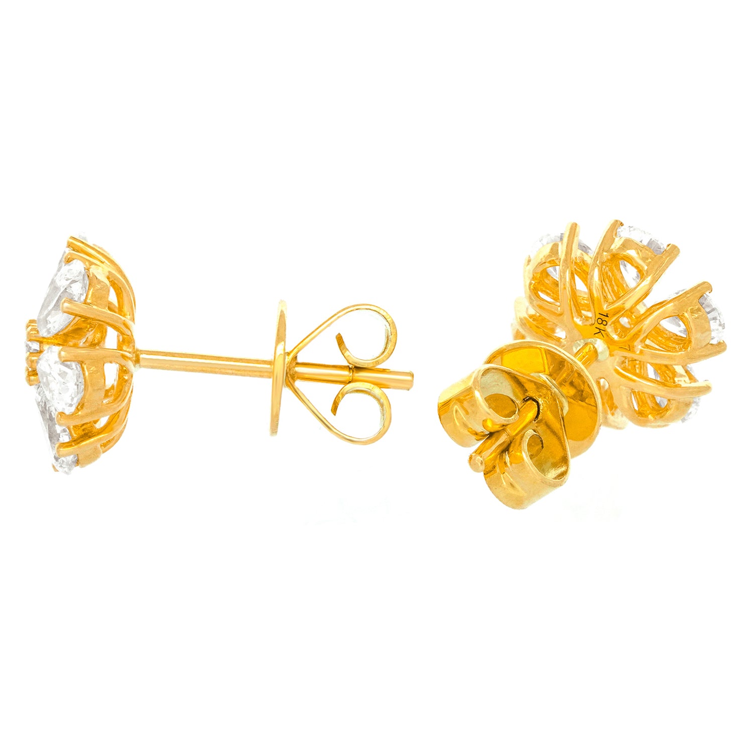 Circa 2000s, 18k, American. These chic diamond-set earrings perfectly catch the light from every angle. The look is everyday American glamour.  Set with 1.50 carats of sparkly white diamonds (H color, SI1 clarity) in a lovely flower motif, their low profile looks amazing on the ear and is very comfortable. Well-made in 14k yellow gold, these diamond studs are in excellent condition.