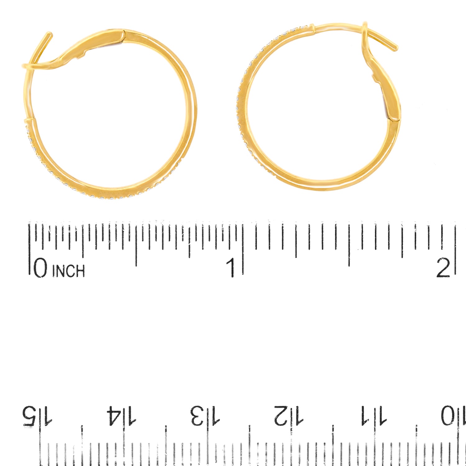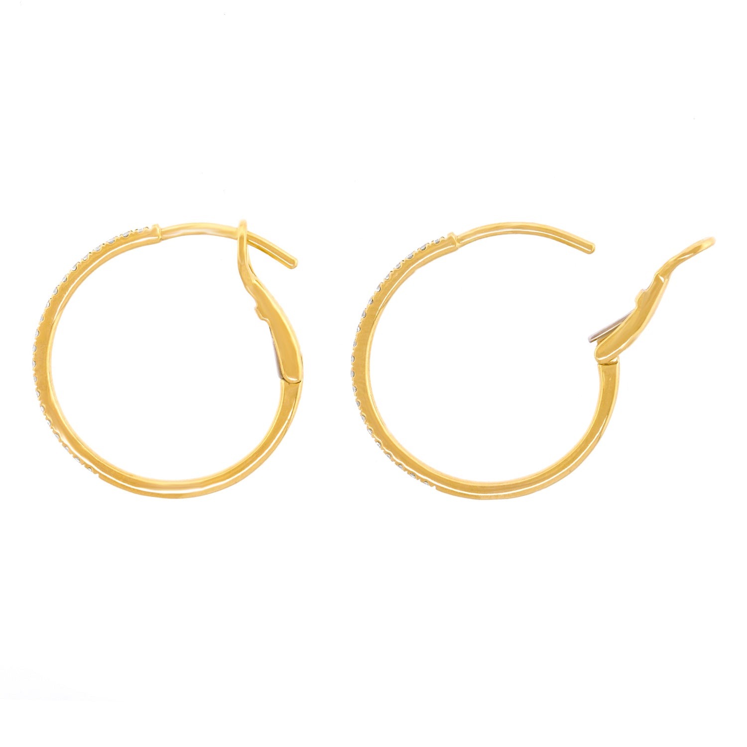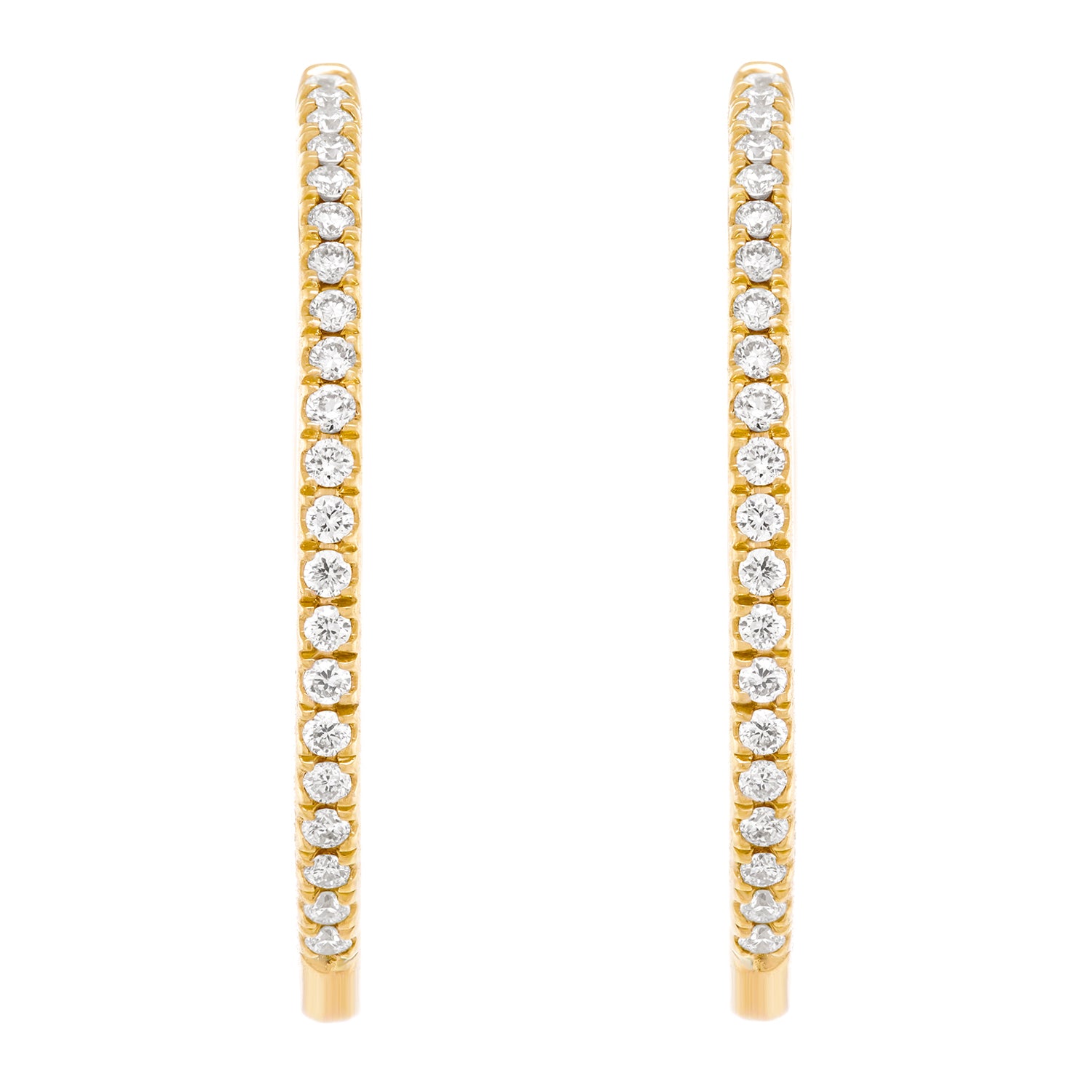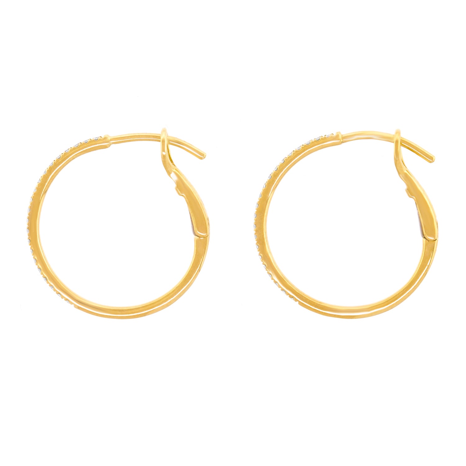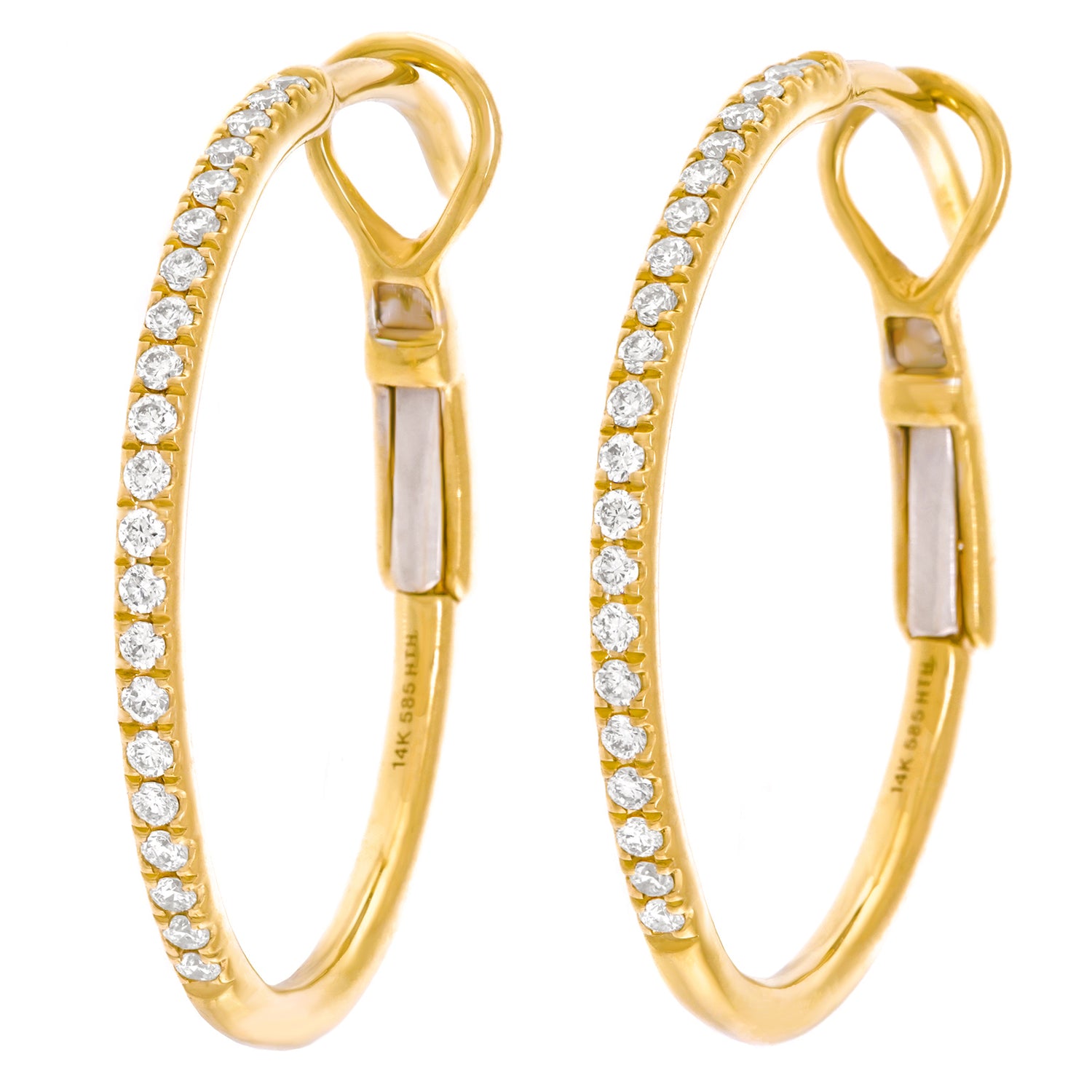 Circa 2000s, 14k, American.   A stylish twist on the classic, this refined pair of yellow-gold hoops have sleek, sparkly silhouettes. Perfect in scale and set with .20 carats of superb diamonds (G-H color, VS2 clarity), they effortlessly dress up or down. Exquisitely made in fourteen-karat yellow gold, they are in excellent condition.