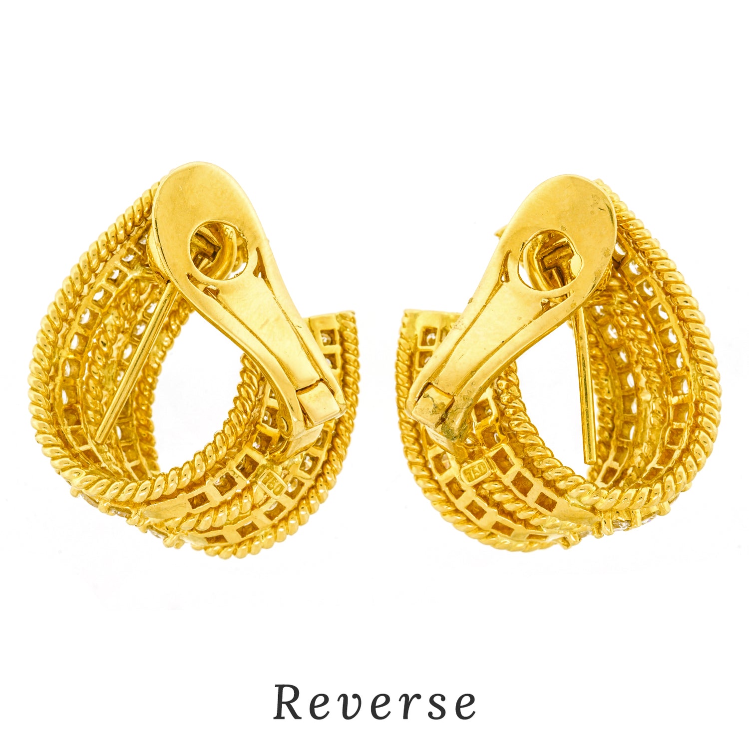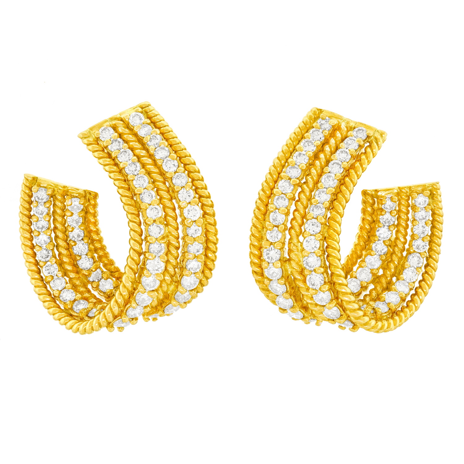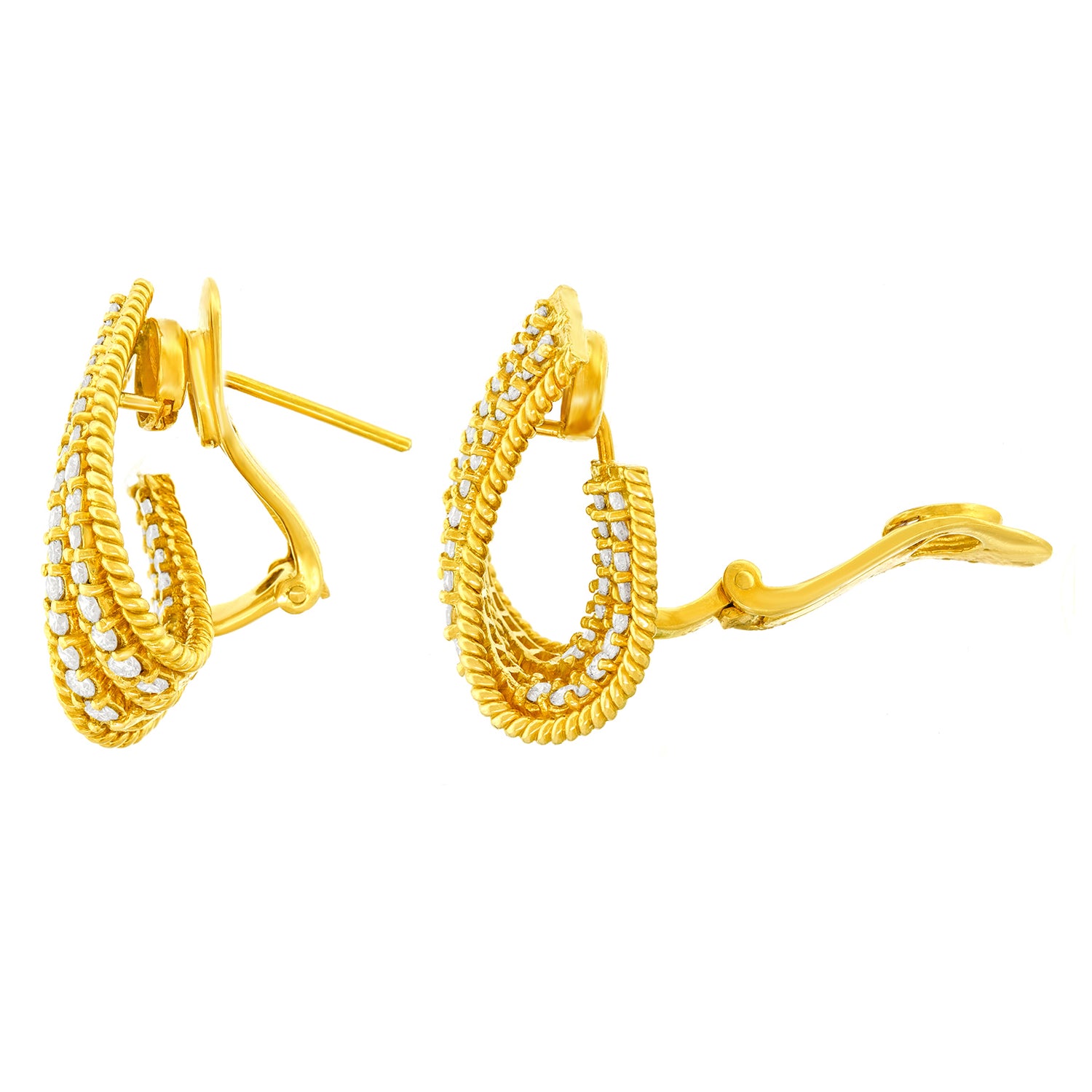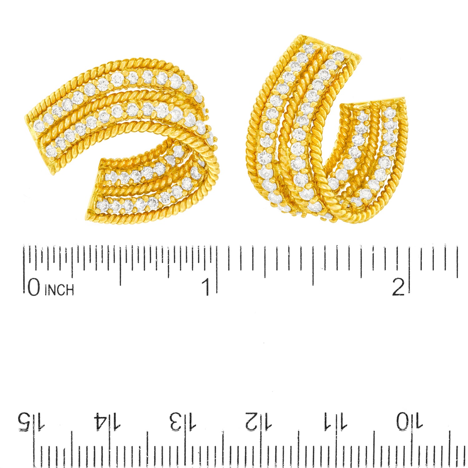 Circa 1950s, 18k, Switzerland.  Set with 3.0 carats of brilliant white diamonds (G color, VS clarity) in eighteen-carat yellow gold, these elegant fifties earrings are bright and appealing. Meticulously fashioned, they have a foldable post so they may be worn as clips or pierced earrings, and are in excellent condition.