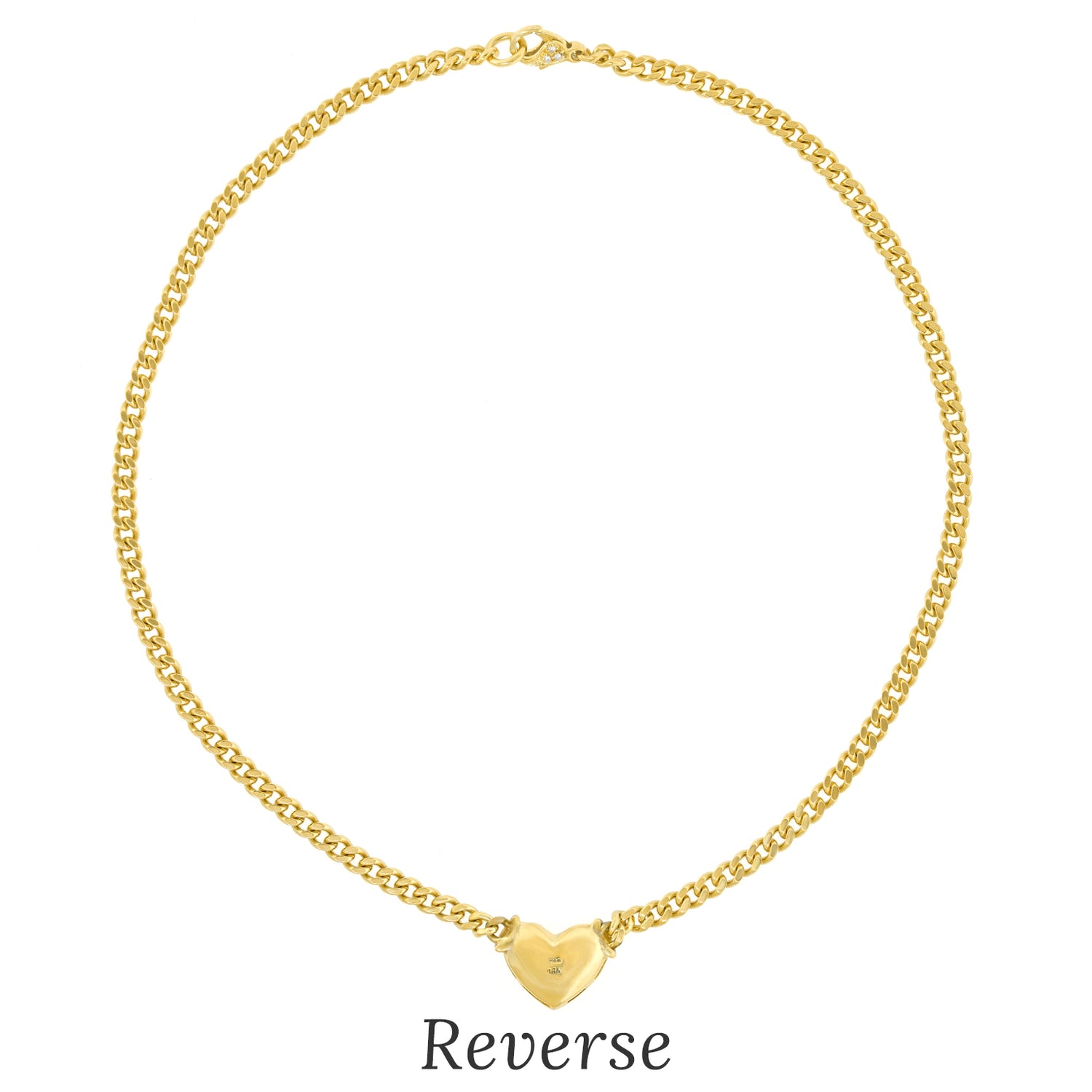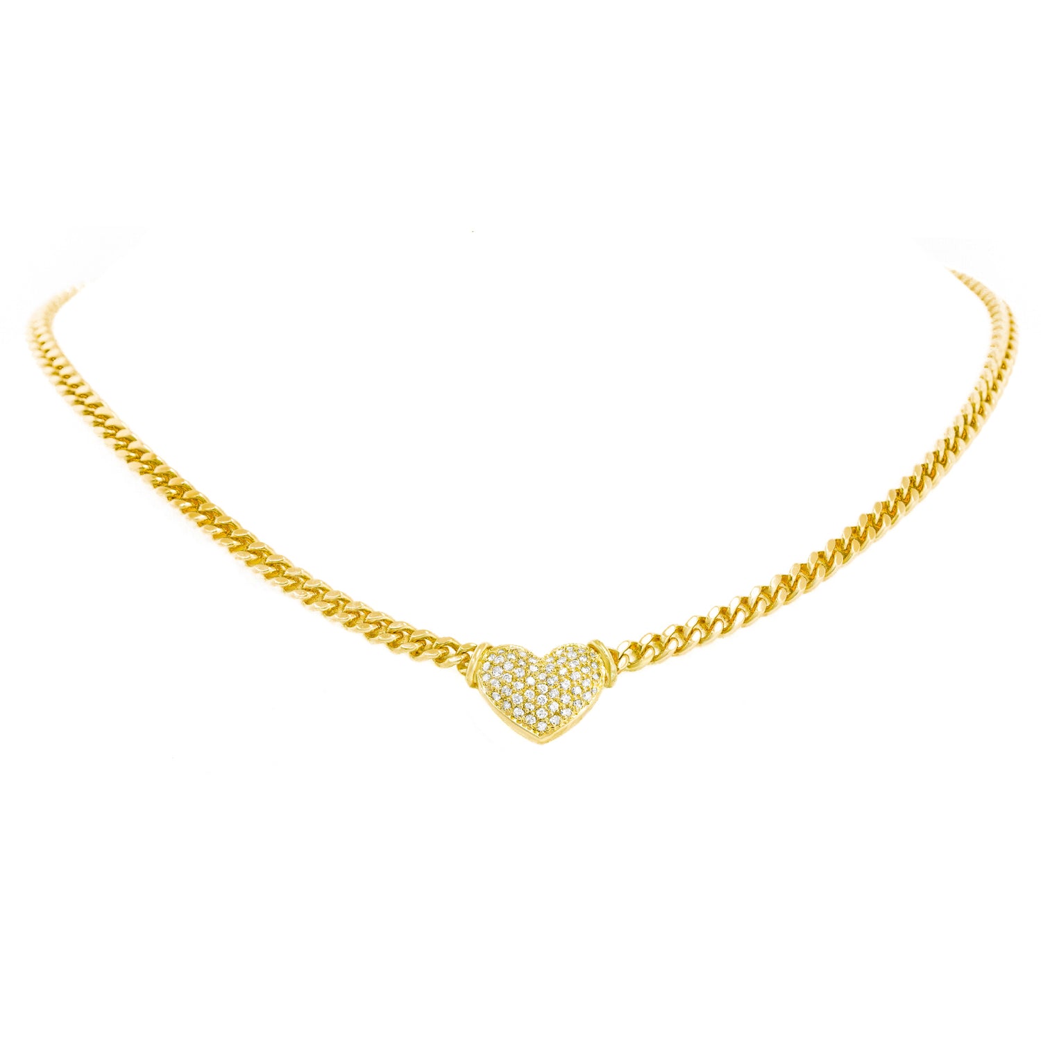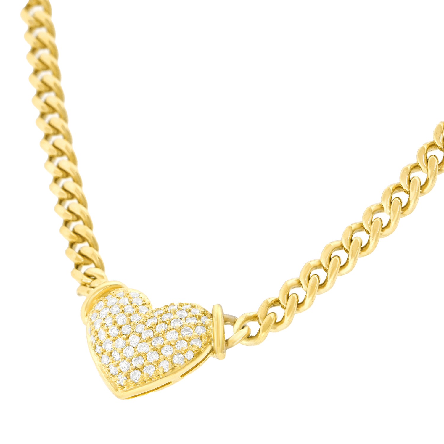 Circa 1980s, 18k, Switzerland. This stylish yellow gold necklace features a heart pave set with fine white diamonds. Perfect for everyday fashion, the look is a pop of eighties style. Finely fashioned in 18k gold, it is in excellent condition.