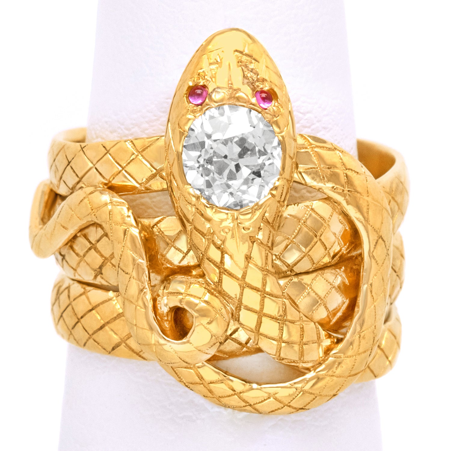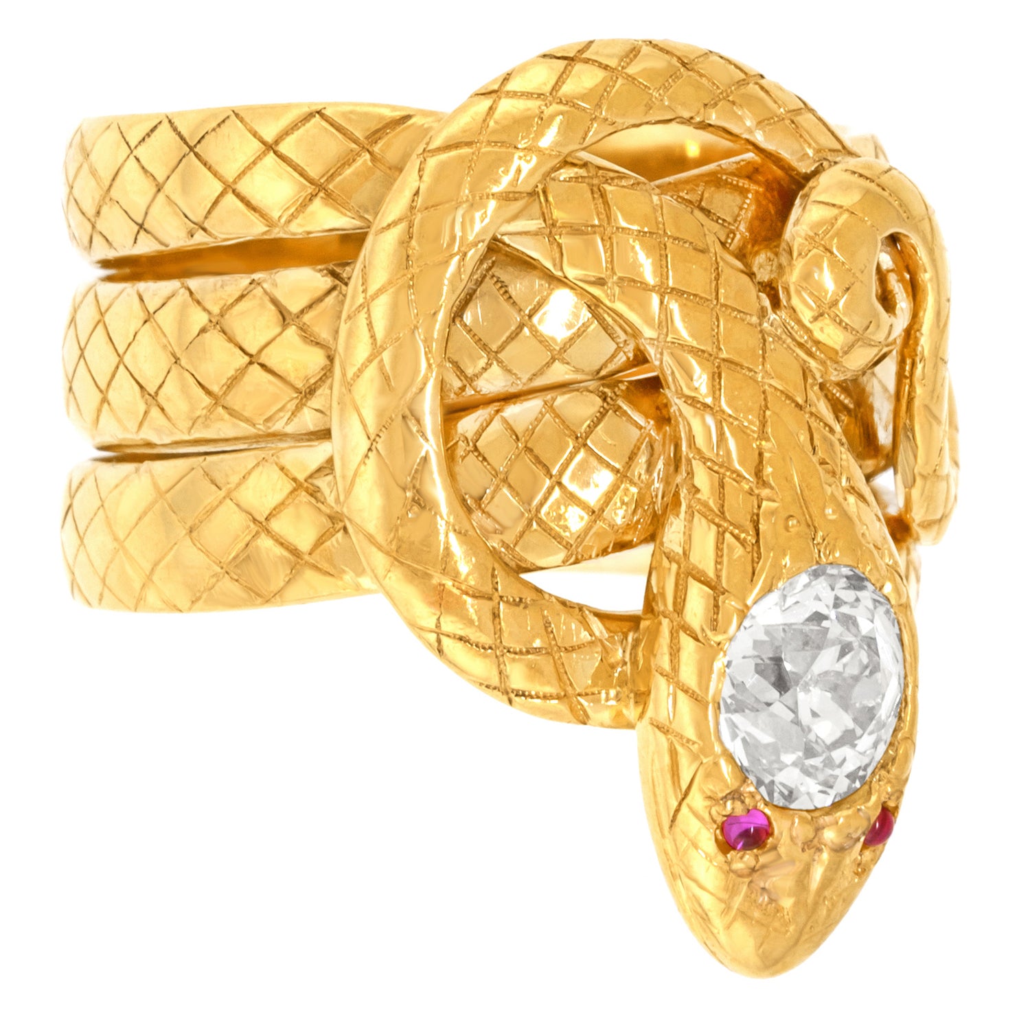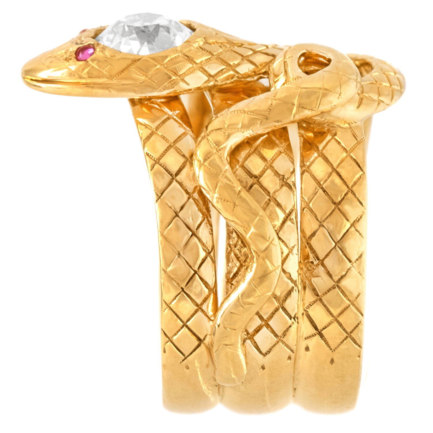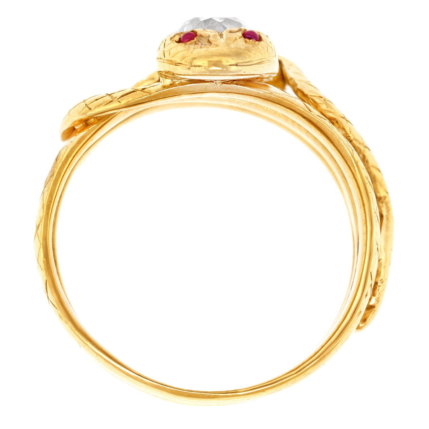 Circa 1900, 14k. Set with a .65-carat diamond and ruby eyes, this early 20th-century serpent ring speaks to the jewelry of the ancients. In Victorian times snake rings were symbols of friendship and trustworthiness. Stylish, mystical, and easy to wear, this charming ring is beautifully handmade and in excellent condition.