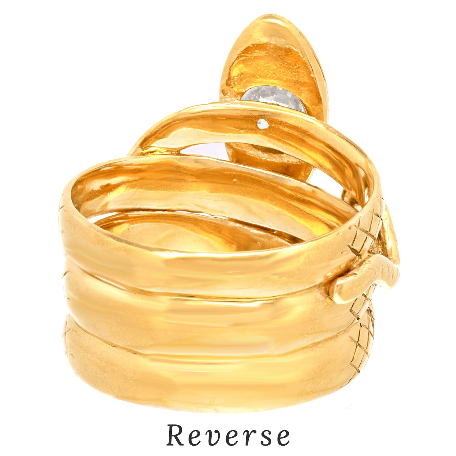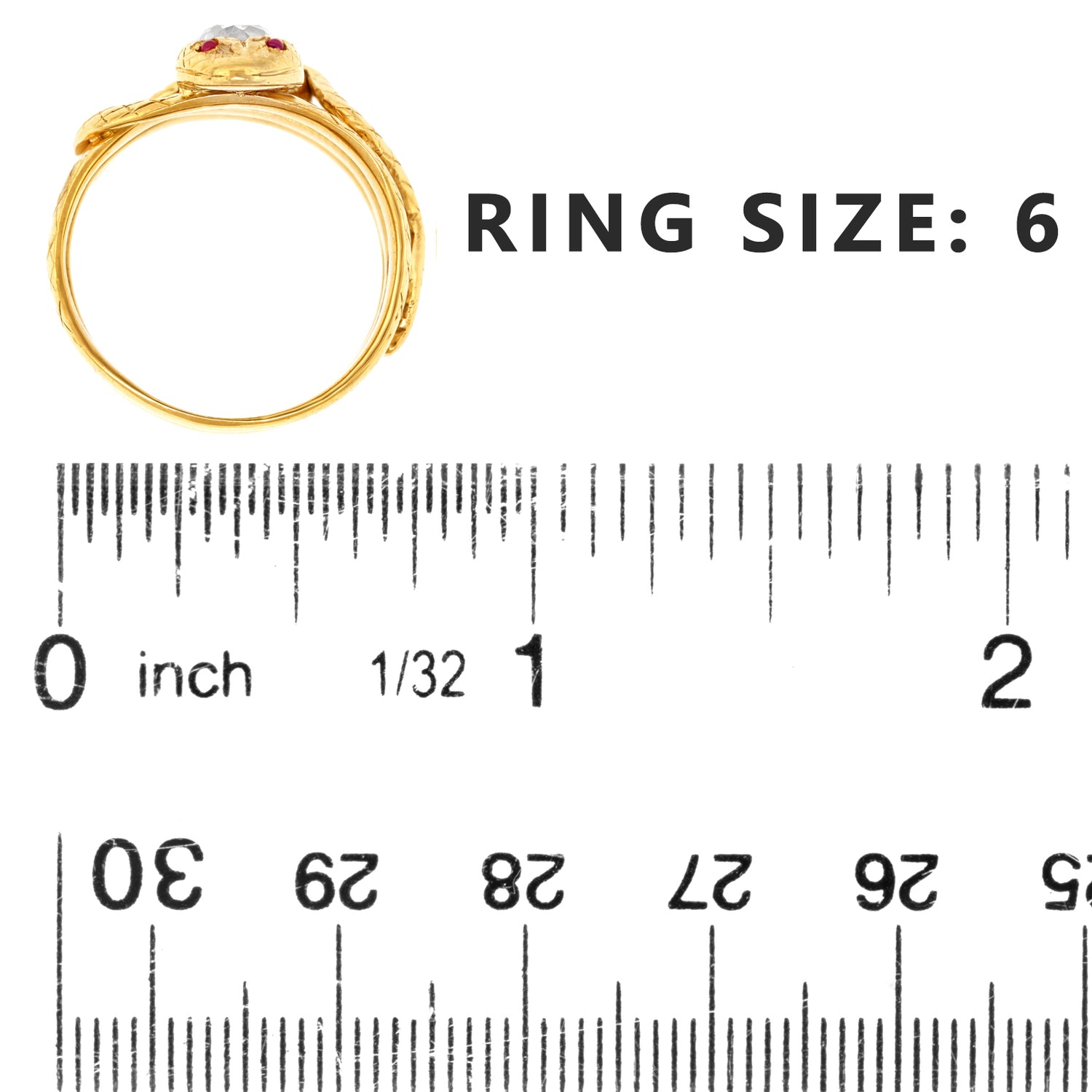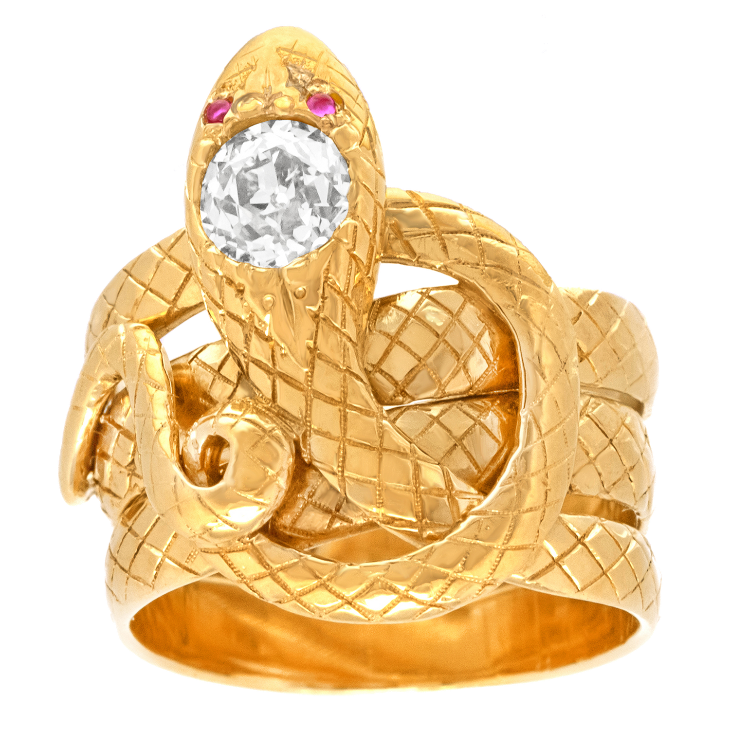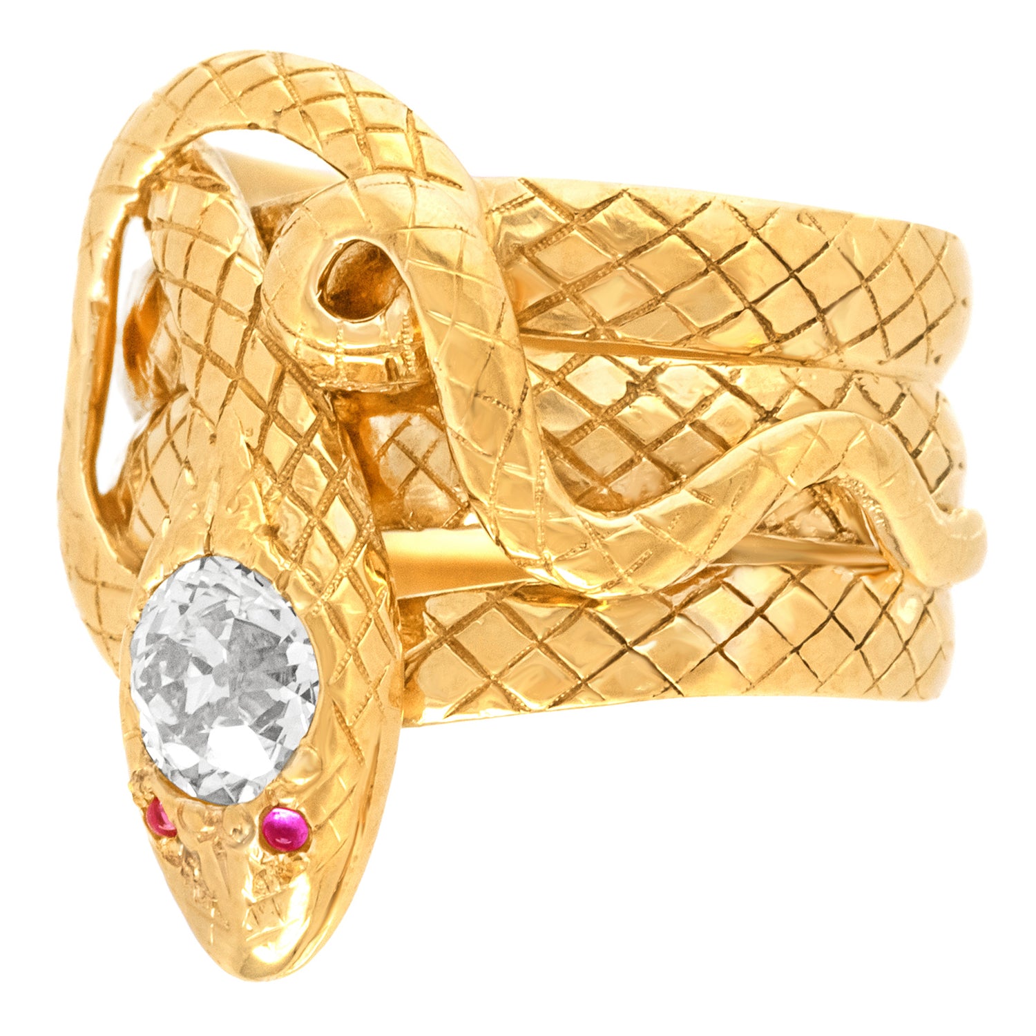 Circa 1900, 14k. Set with a .65-carat diamond and ruby eyes, this early 20th-century serpent ring speaks to the jewelry of the ancients. In Victorian times snake rings were symbols of friendship and trustworthiness. Stylish, mystical, and easy to wear, this charming ring is beautifully handmade and in excellent condition.