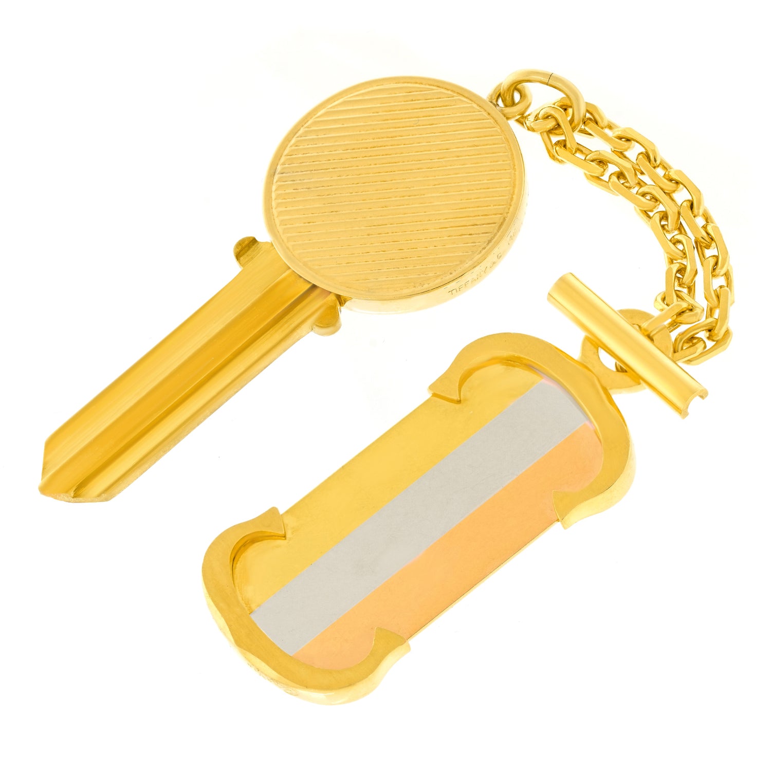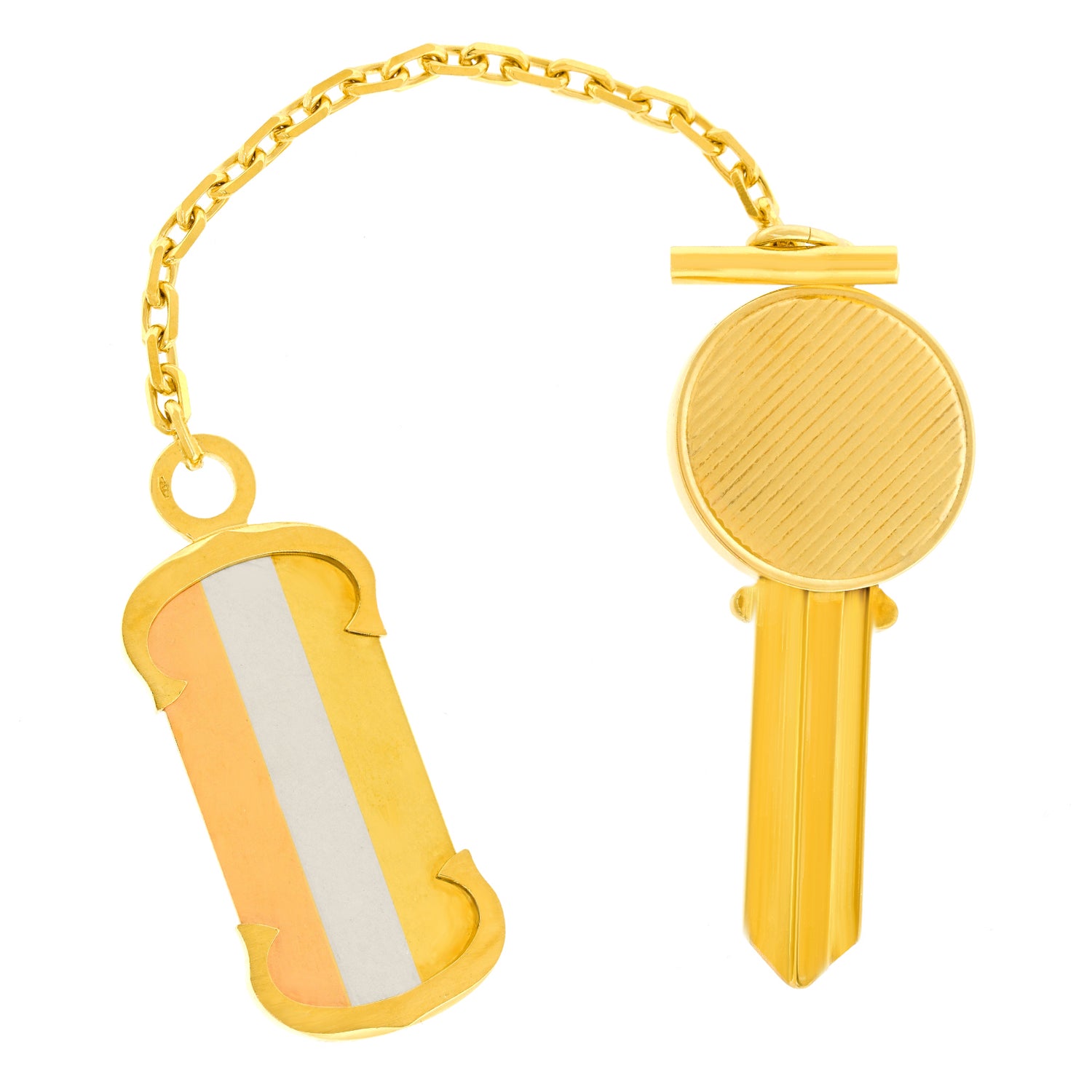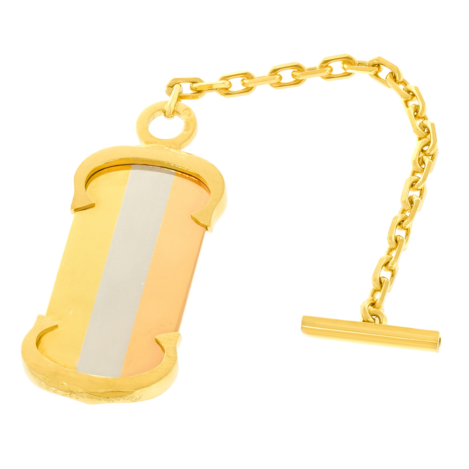 Circa 1980s, 18k, by Cartier. This tasteful eighteen-karat gold key ring by Cartier is the perfect accessory. Yellow, white, and rose gold in the classic trinity taste are framed by the timeless double C motif for an iconic Parisian look. Excellent condition.