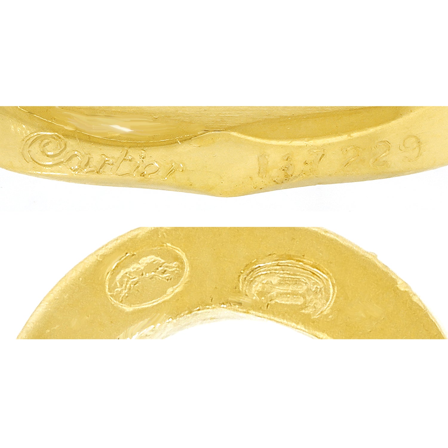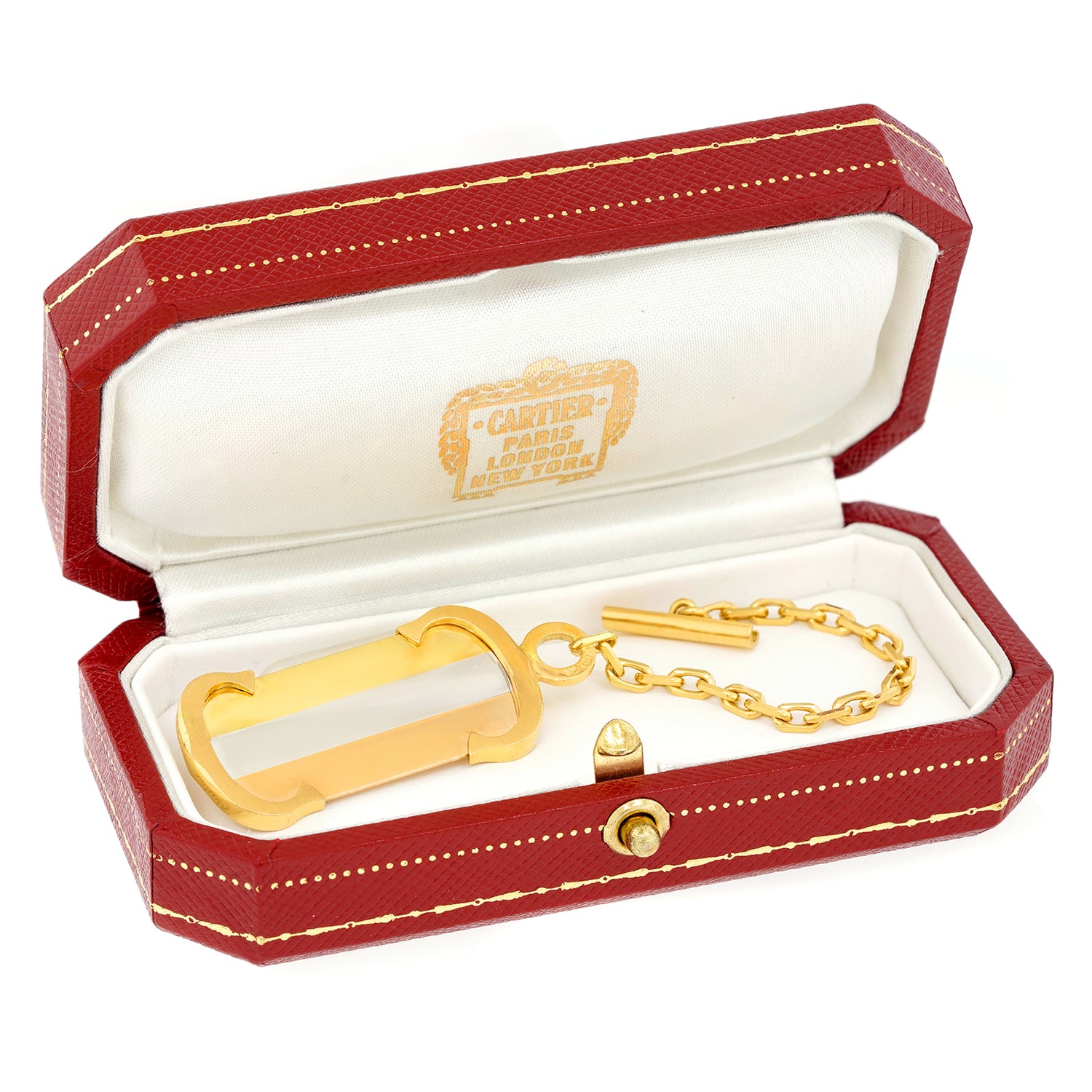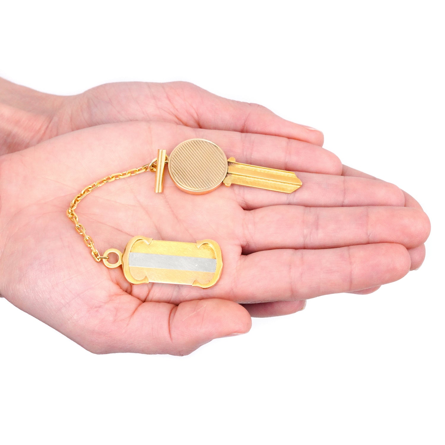 Circa 1980s, 18k, by Cartier. This tasteful eighteen-karat gold key ring by Cartier is the perfect accessory. Yellow, white, and rose gold in the classic trinity taste are framed by the timeless double C motif for an iconic Parisian look. Excellent condition.