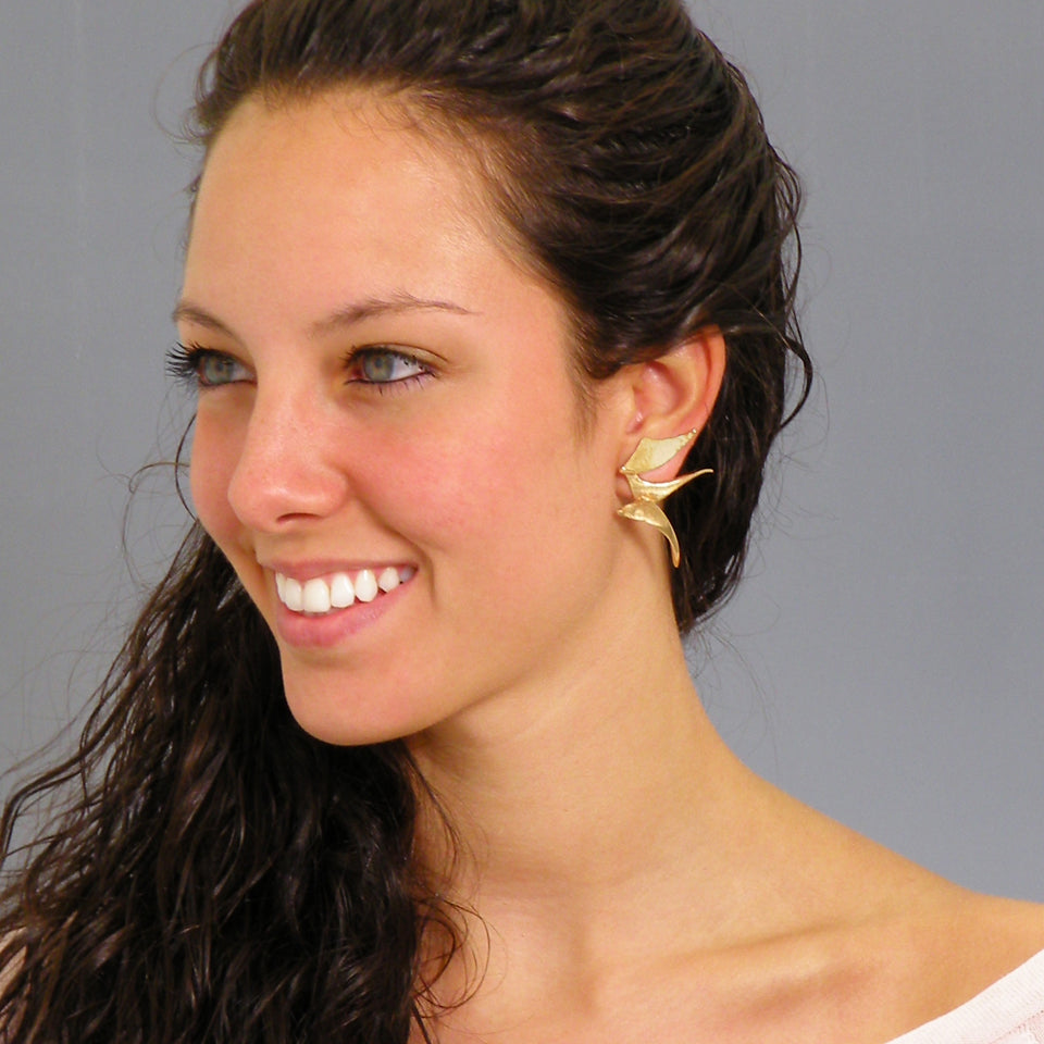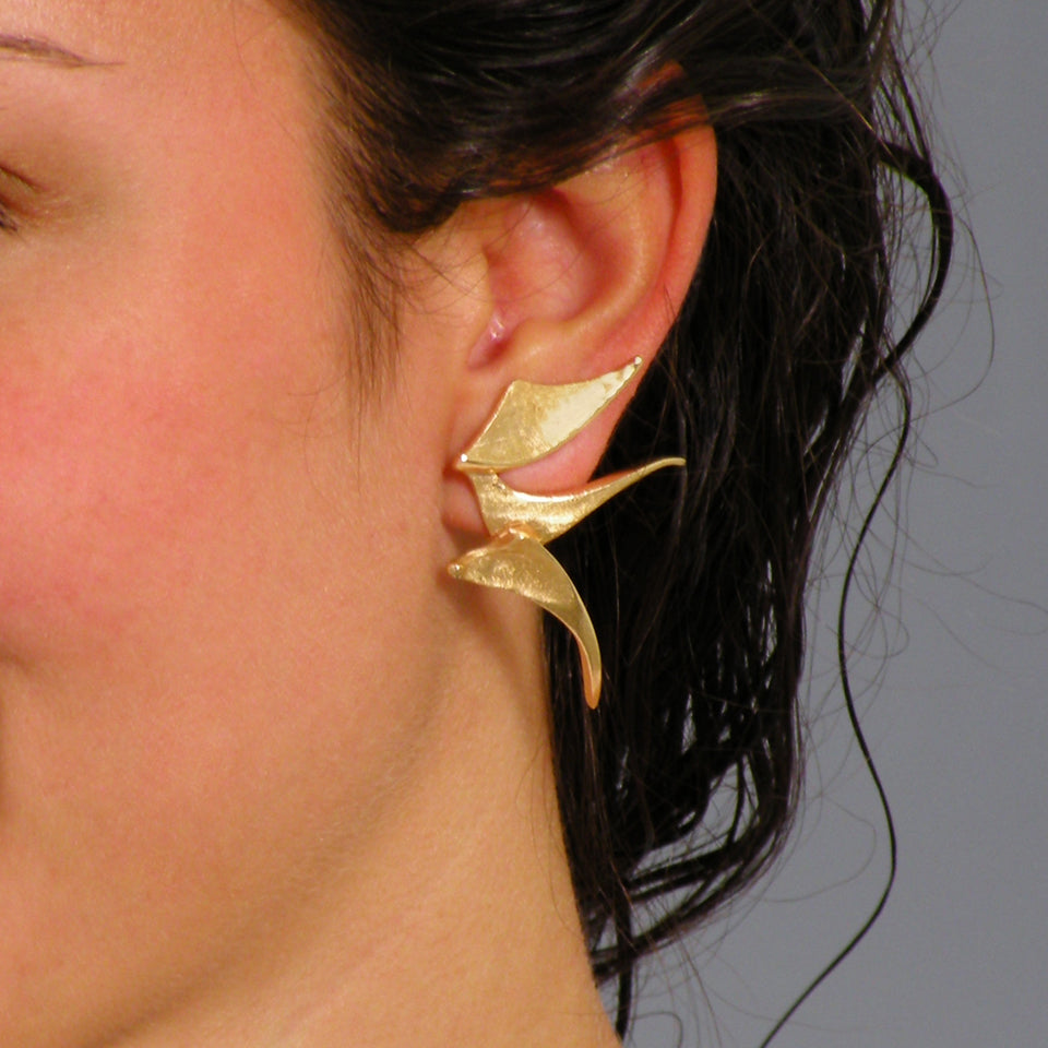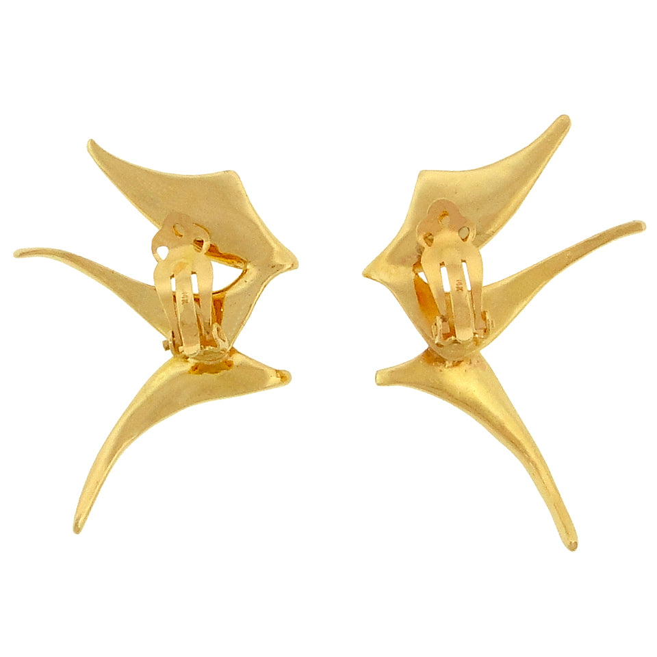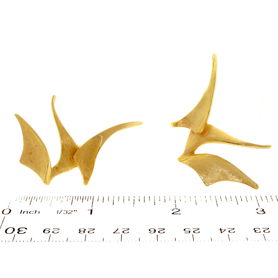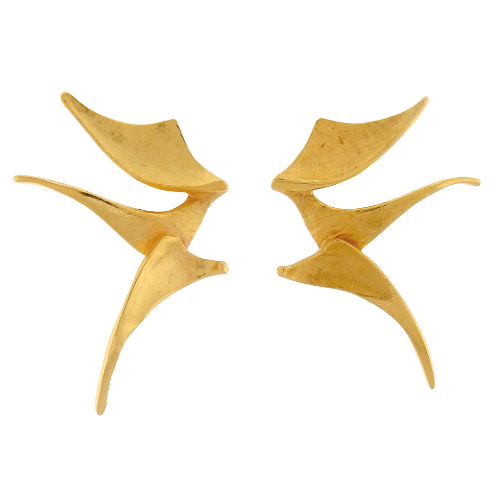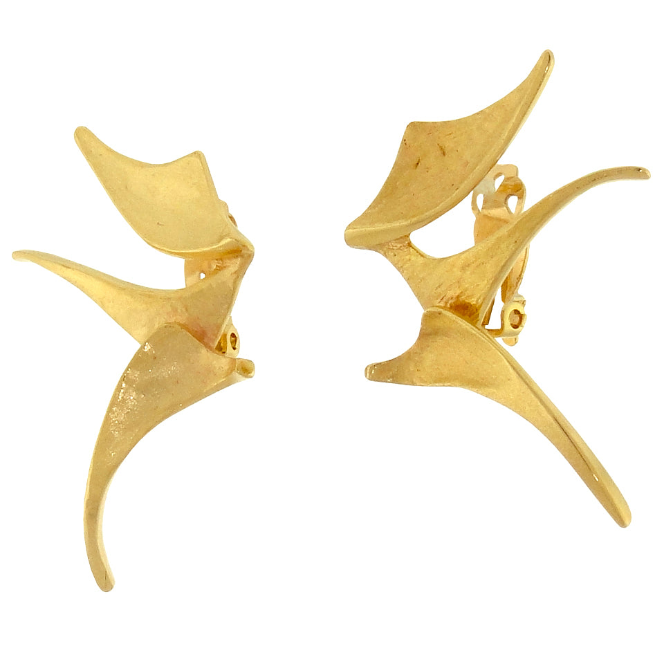 Circa 1960s, 14k, by Ed Wiener, New York City.  These abstract motif  earrings are especially fluid examples of Ed Wieners mid- career work. He liked them enough to feature them on the cover his catalog. The crude organic construction is an artists ruse, these pieces are sophisticated and articulate fitting the body adroitly and telling a moving visual story. Excellent condition.