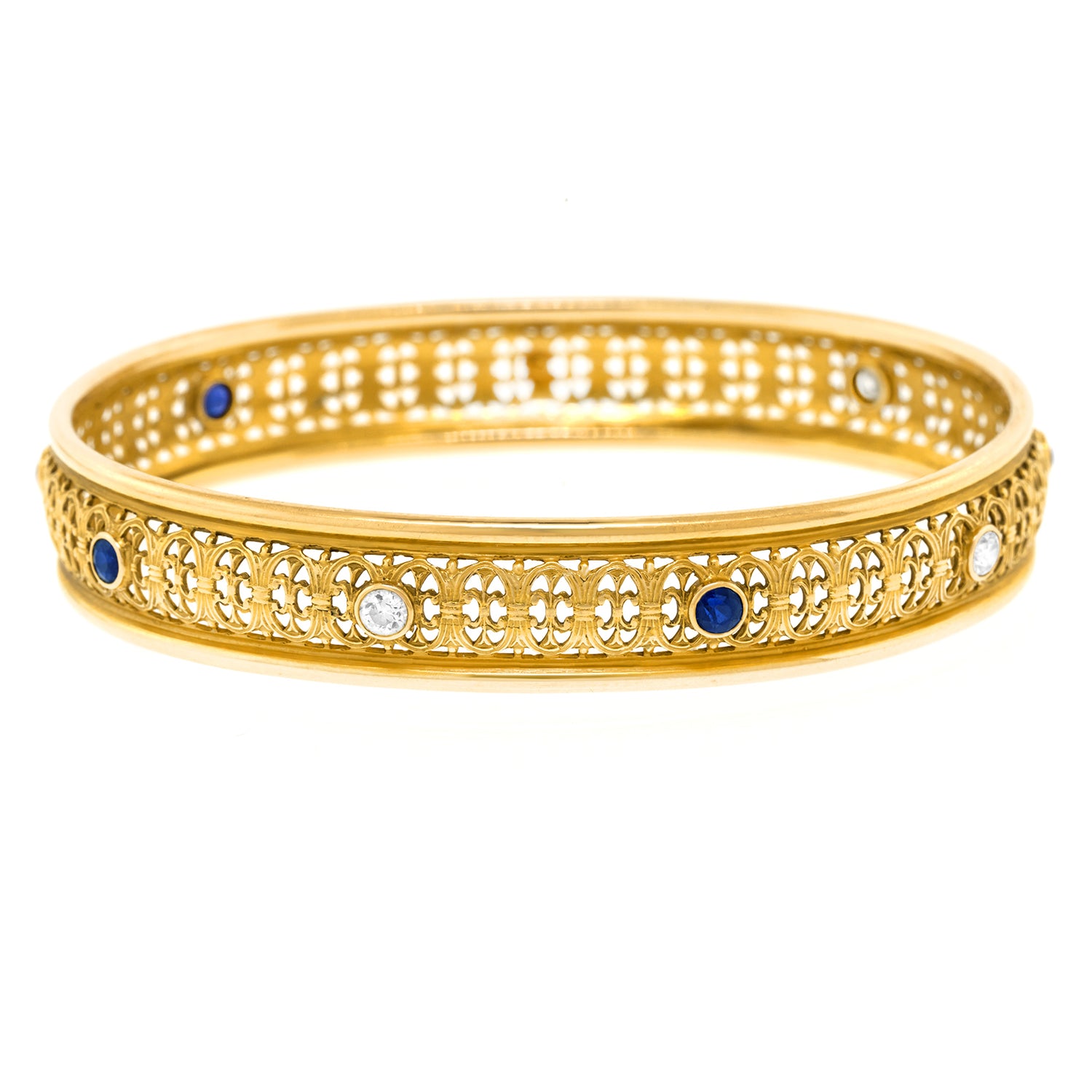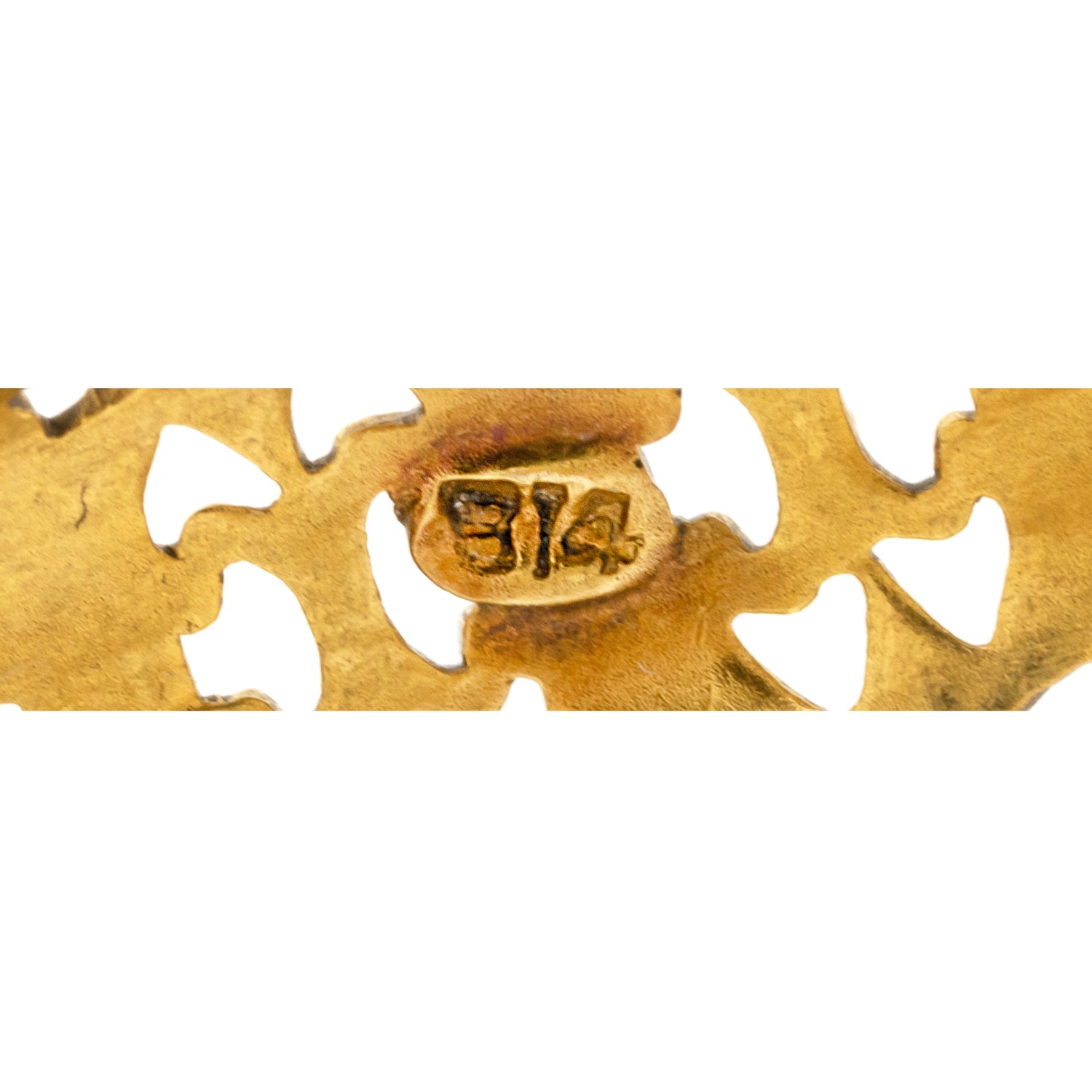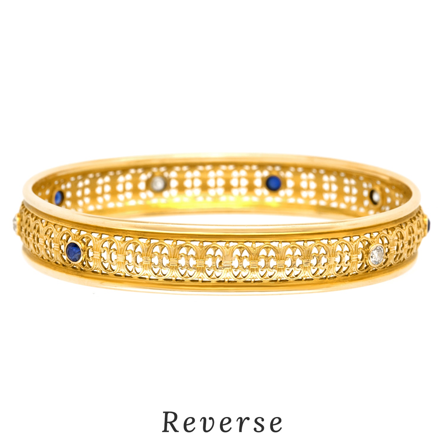 Circa 1905, 14k, American. This beautiful Renaissance Revival bangle features a reticulated foliate motif with hidden fleurs-de-lis. Reminiscent of Roman designs, it is delightfully antique-chic. It looks amazing worn alone or added to your "arm candy." Pieces like this one are quintessential examples of how the New Jersey Goldsmiths of the late 19th and early 20th century were central to the Aesthetic movement in America. Beautifully made, it is in very good condition.
