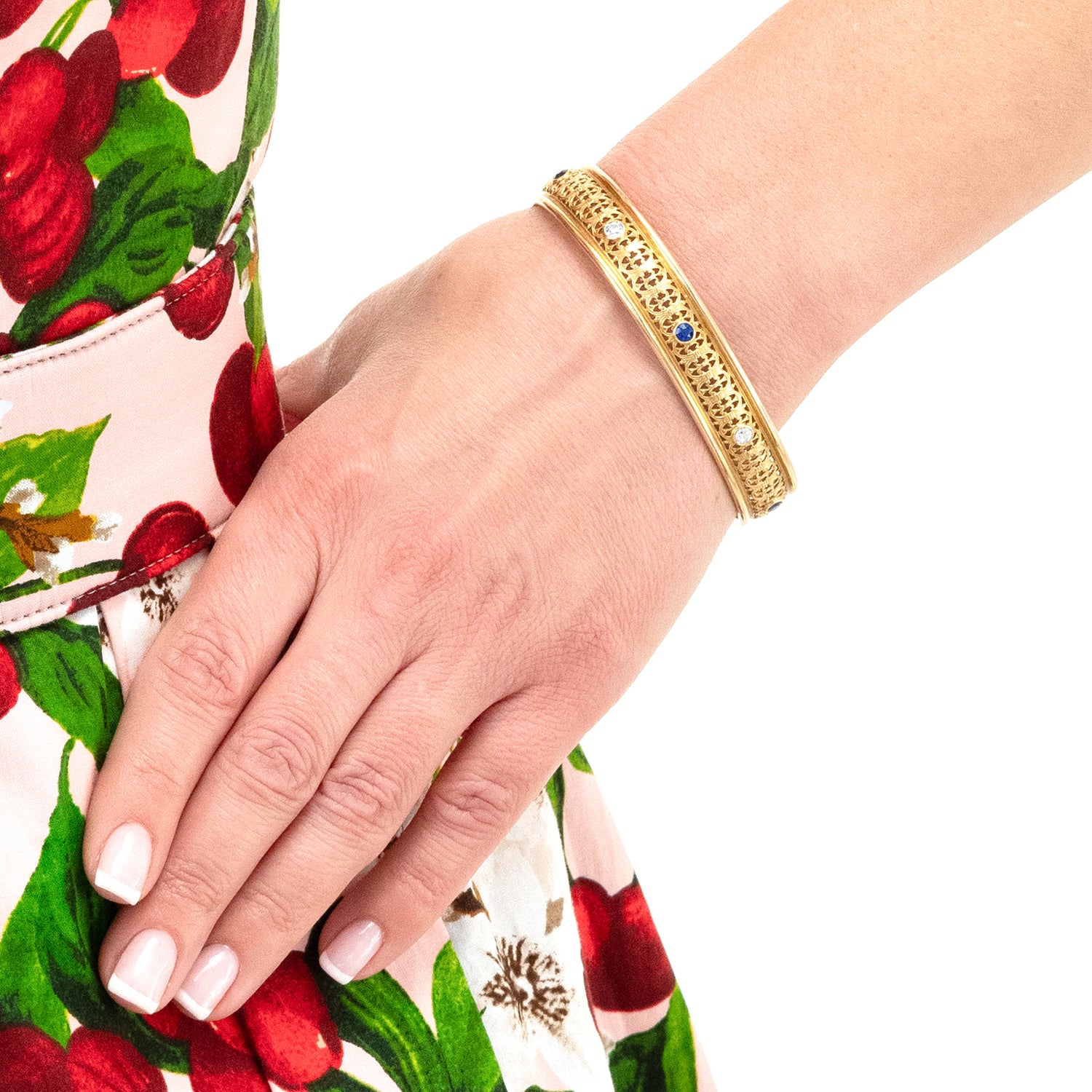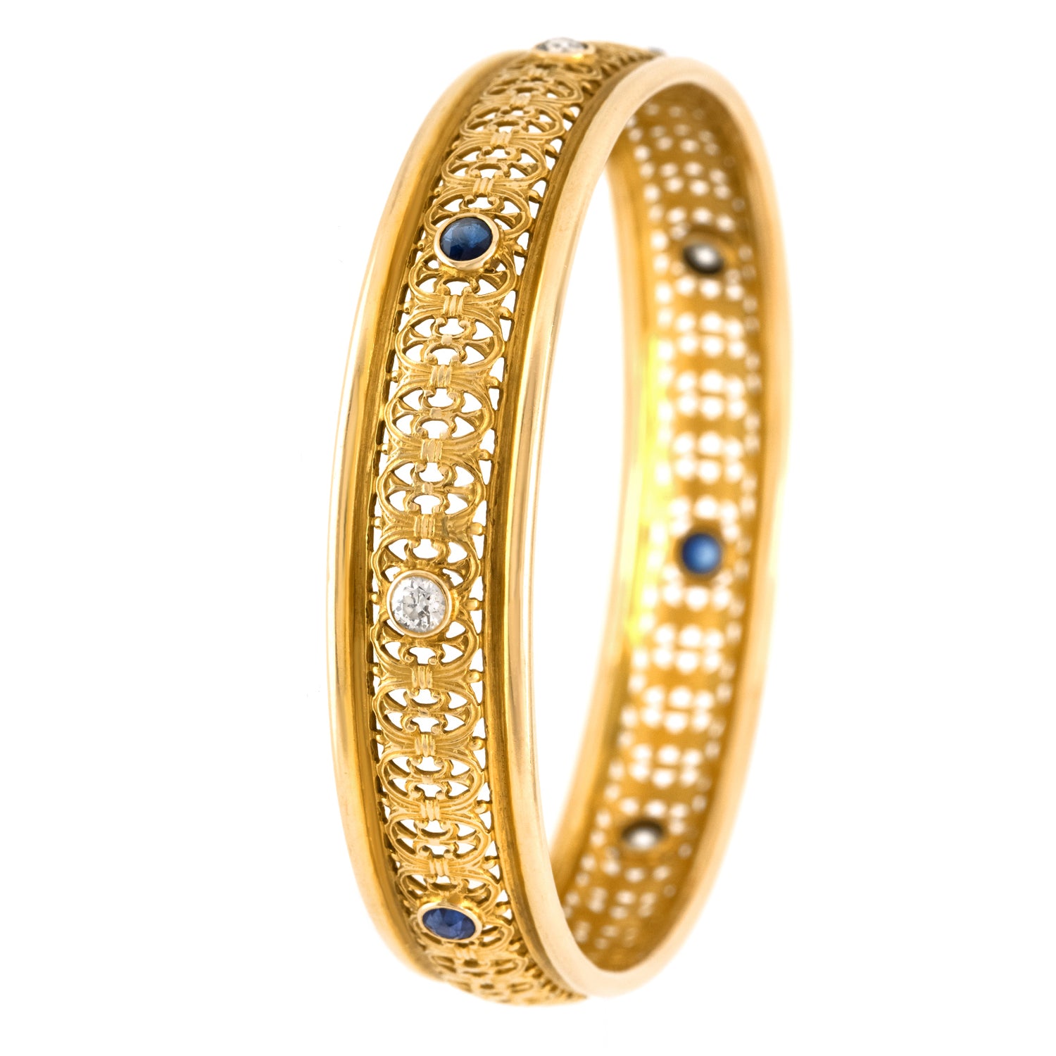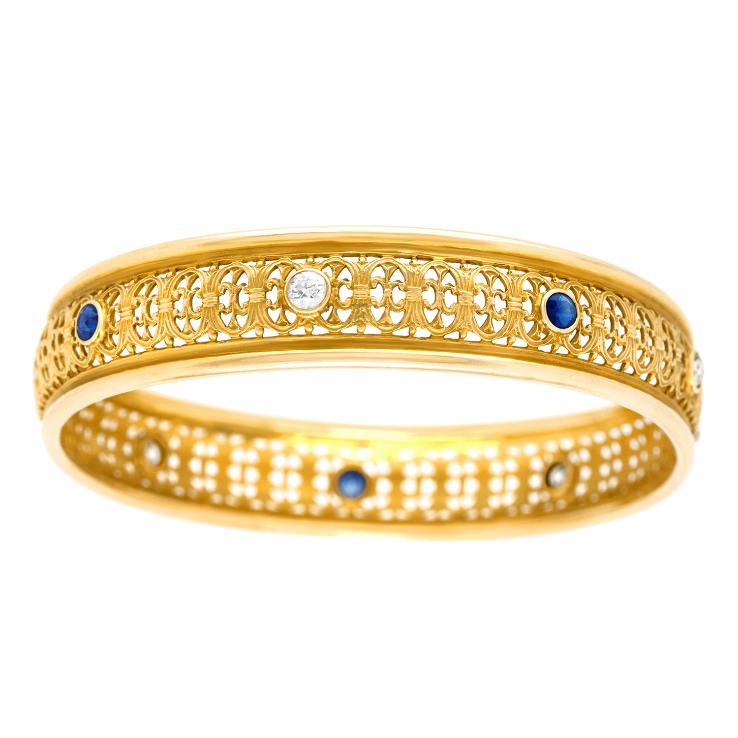 Circa 1905, 14k, American. This beautiful Renaissance Revival bangle features a reticulated foliate motif with hidden fleurs-de-lis. Reminiscent of Roman designs, it is delightfully antique-chic. It looks amazing worn alone or added to your "arm candy." Pieces like this one are quintessential examples of how the New Jersey Goldsmiths of the late 19th and early 20th century were central to the Aesthetic movement in America. Beautifully made, it is in very good condition.
