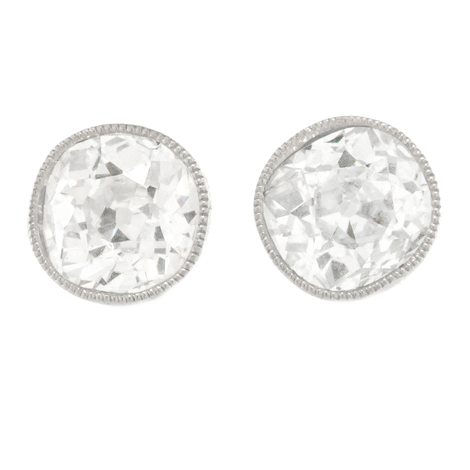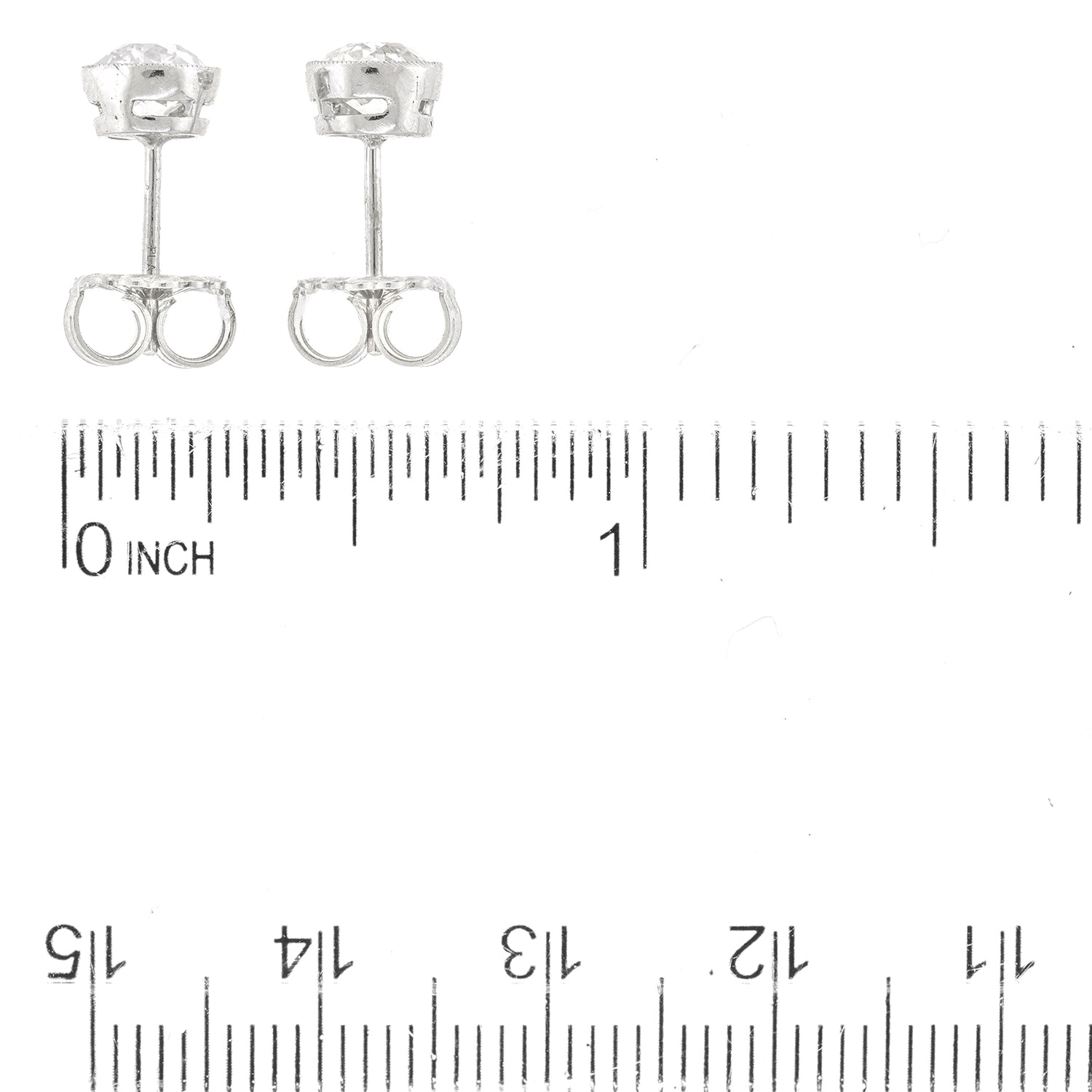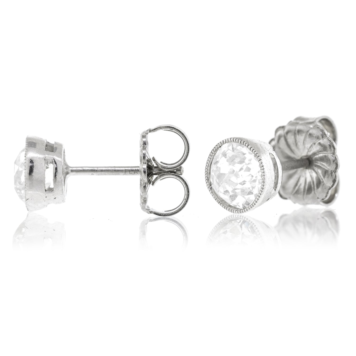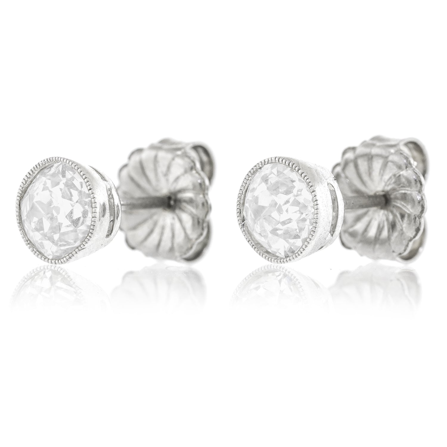 Circa 1910, Platinum.  Set with two gorgeous .85-carat old cut diamonds (G color, SI1-VS clarity), these antique earrings are a rare find. The early mine-cut diamonds have a subtle visual quality. They reflect and refract in a measured manner, casting broad prismatic shafts of light. Re-occasioned from a sadly damaged brooch into earrings, the hand-made platinum collet mountings feature beaded bezels. Excellent condition.