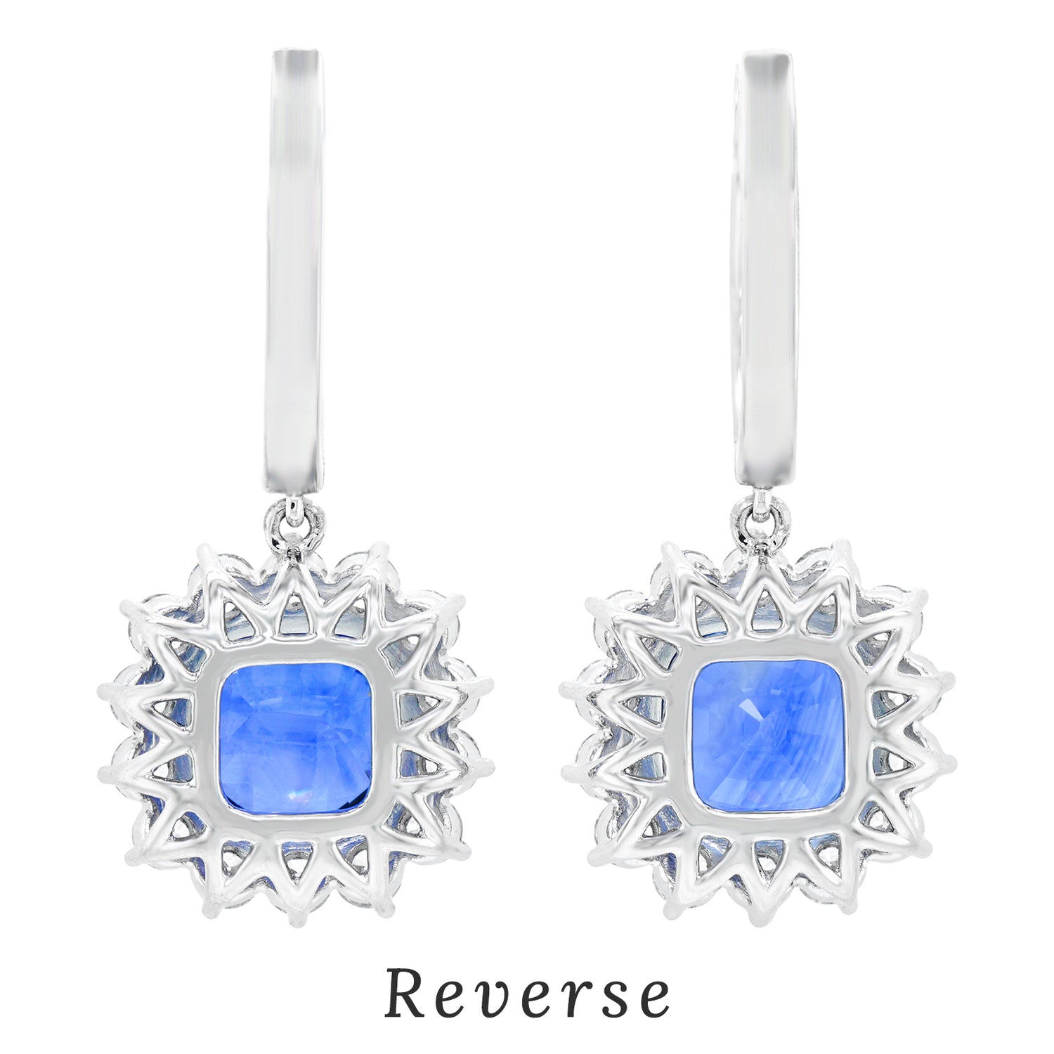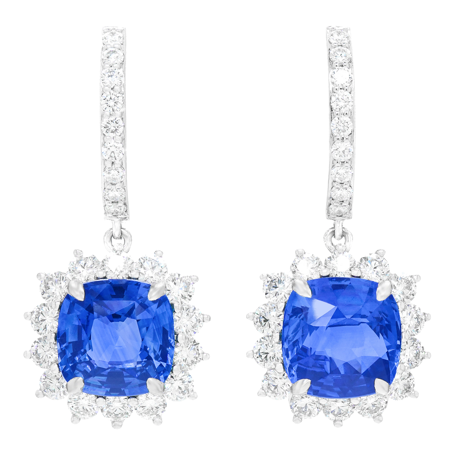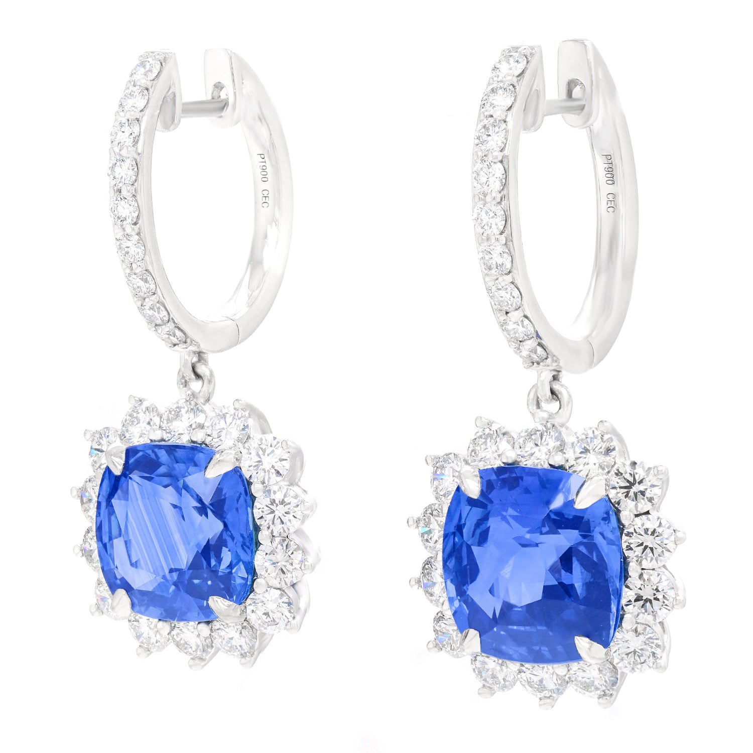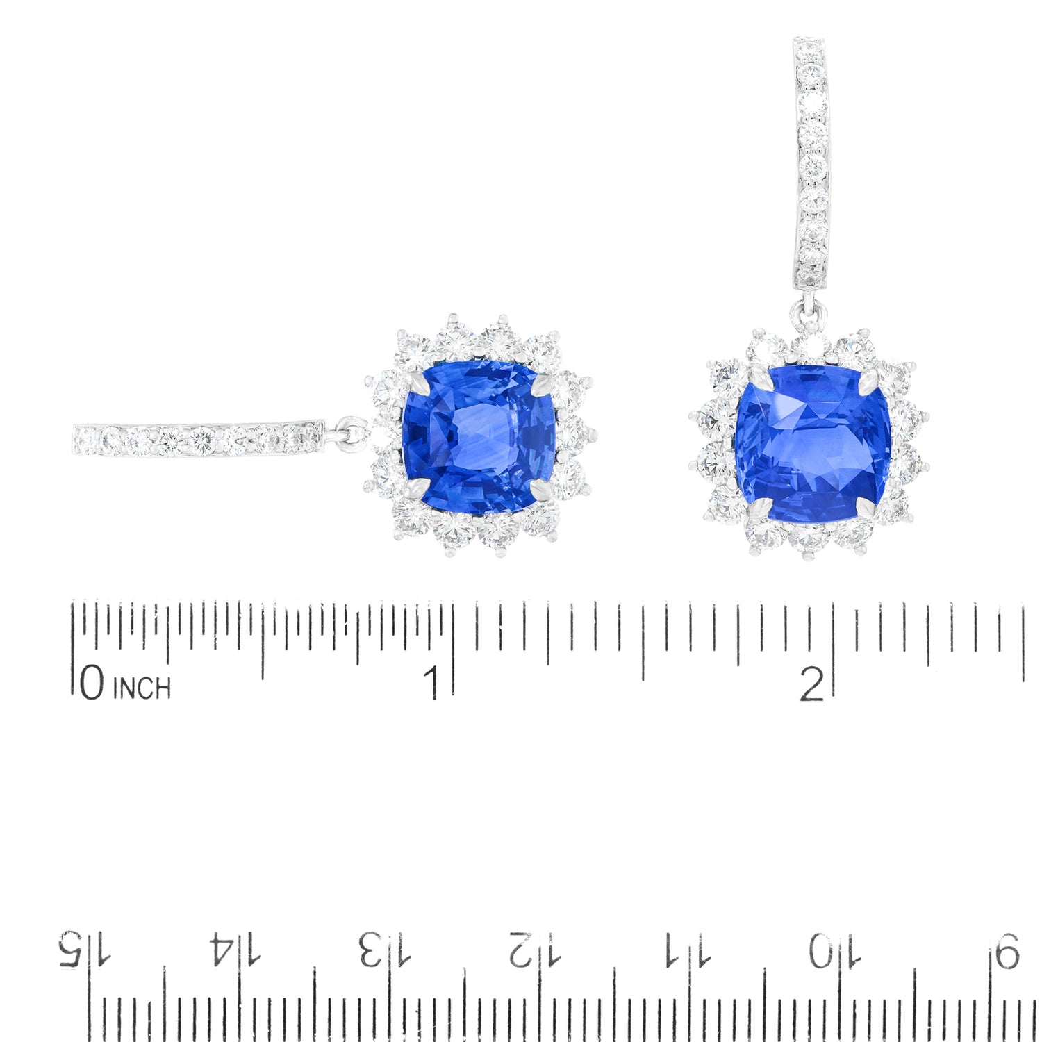Circa 2000s, Platinum, American. Set with luminous cornflower blue sapphires (5.27ct and 5.26ct) surrounded by 2.63 carats of brilliant white diamonds, these stunning drop earrings are perfect for any special occasion. Beautifully made in platinum, the look is elegantly posh with a dash of colorful dare. They are meticulously fabricated with quality found throughout. Excellent condition.