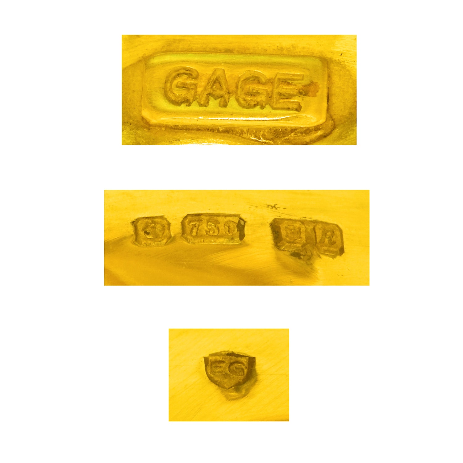 Hallmarks: GAGE, EG in a shield for Elizabeth Gage, Crown, 750 for 18k, Leopard head for London and R date letter for 1991.