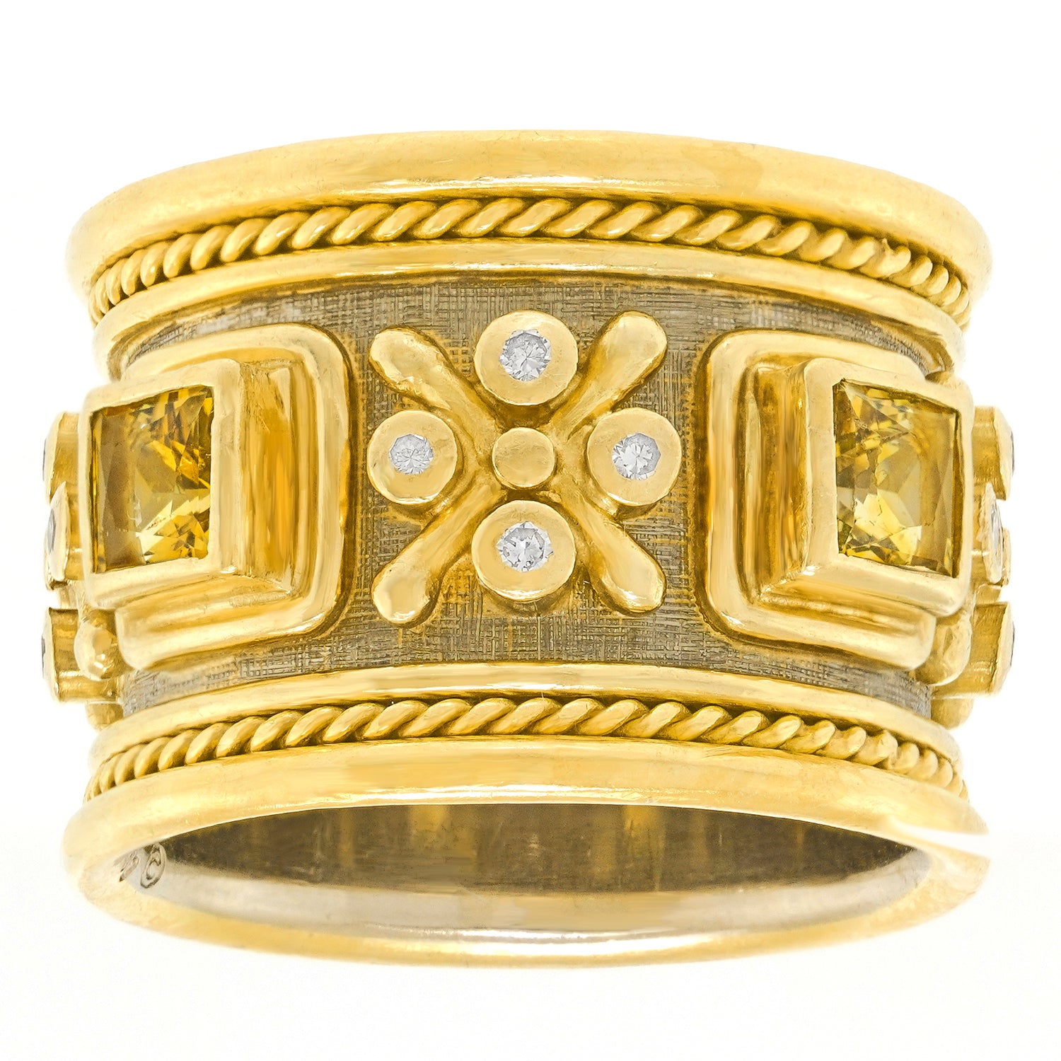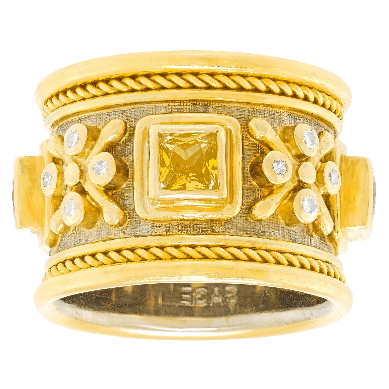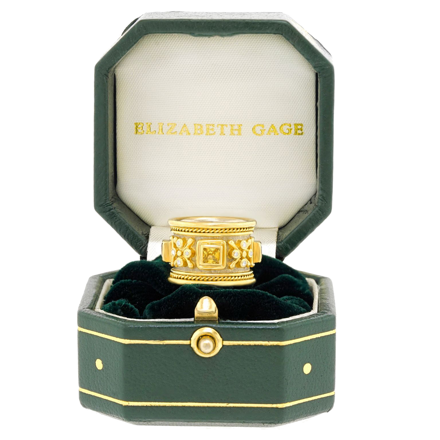 Circa 2004, 18k, by Elizabeth Gage, London. This elegant jewel is Elizabeth Gage at her Renaissance Revival best. Featuring 1.20 carats of rich yellow sapphire, .24 carats of fine white diamonds (F color, VS clarity), subtle two colors of gold, and her classic cable-twist edge …this ring has it all. Finely fabricated to the highest standards, it is hefty and feels wonderful on the hand.   Excellent condition.