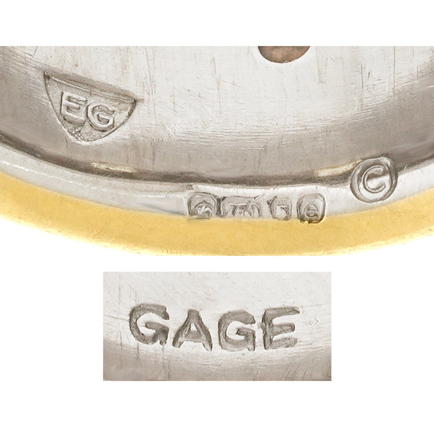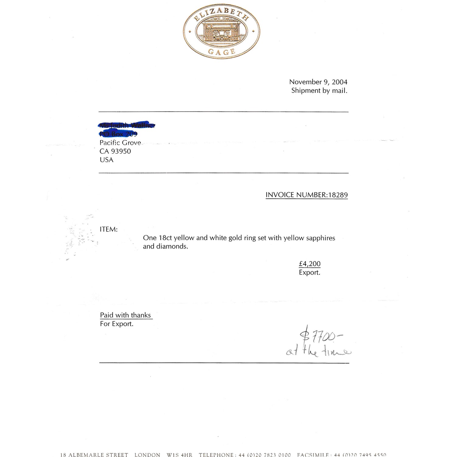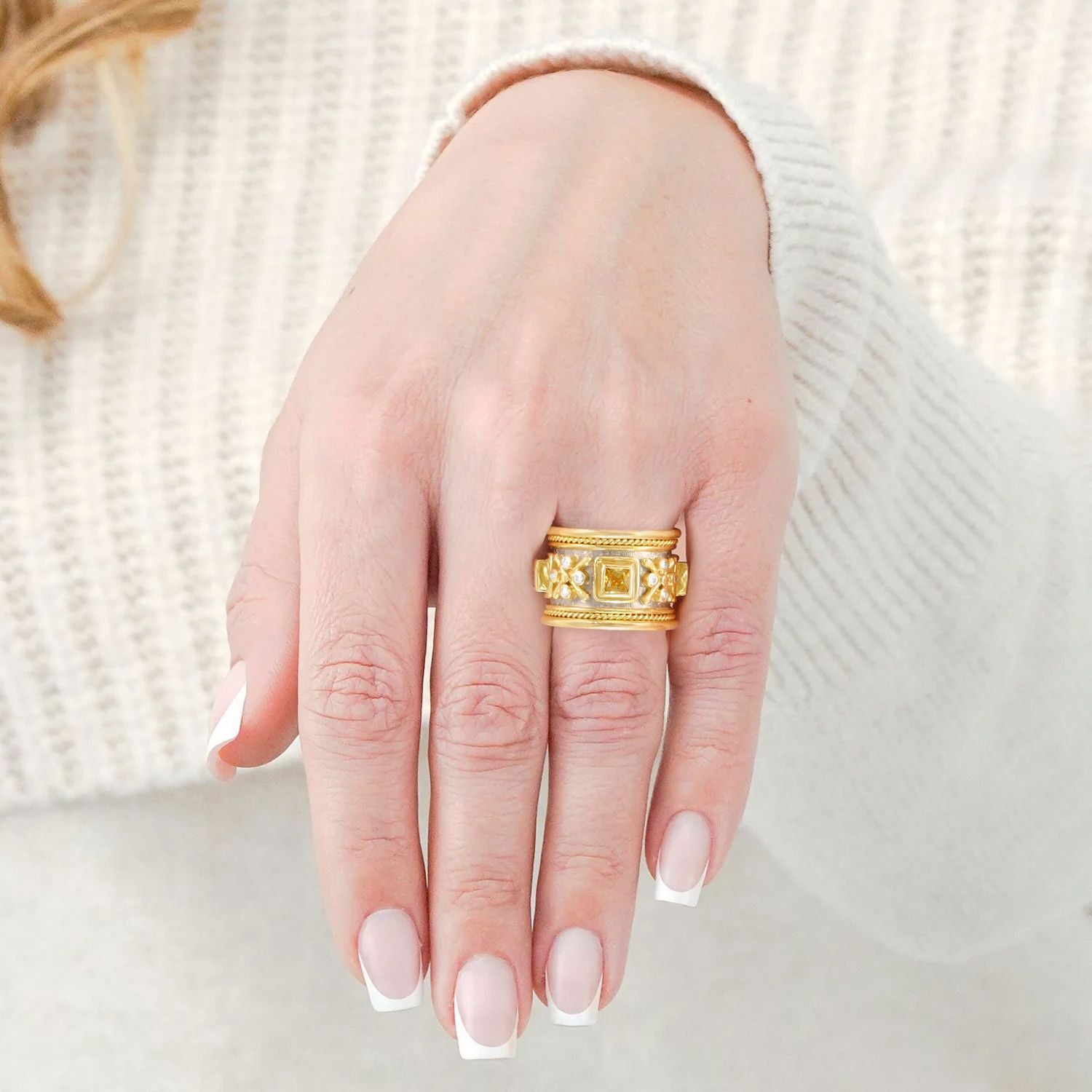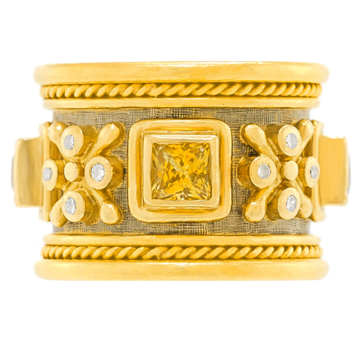 Circa 2004, 18k, by Elizabeth Gage, London. This elegant jewel is Elizabeth Gage at her Renaissance Revival best. Featuring 1.20 carats of rich yellow sapphire, .24 carats of fine white diamonds (F color, VS clarity), subtle two colors of gold, and her classic cable-twist edge …this ring has it all. Finely fabricated to the highest standards, it is hefty and feels wonderful on the hand.   Excellent condition.