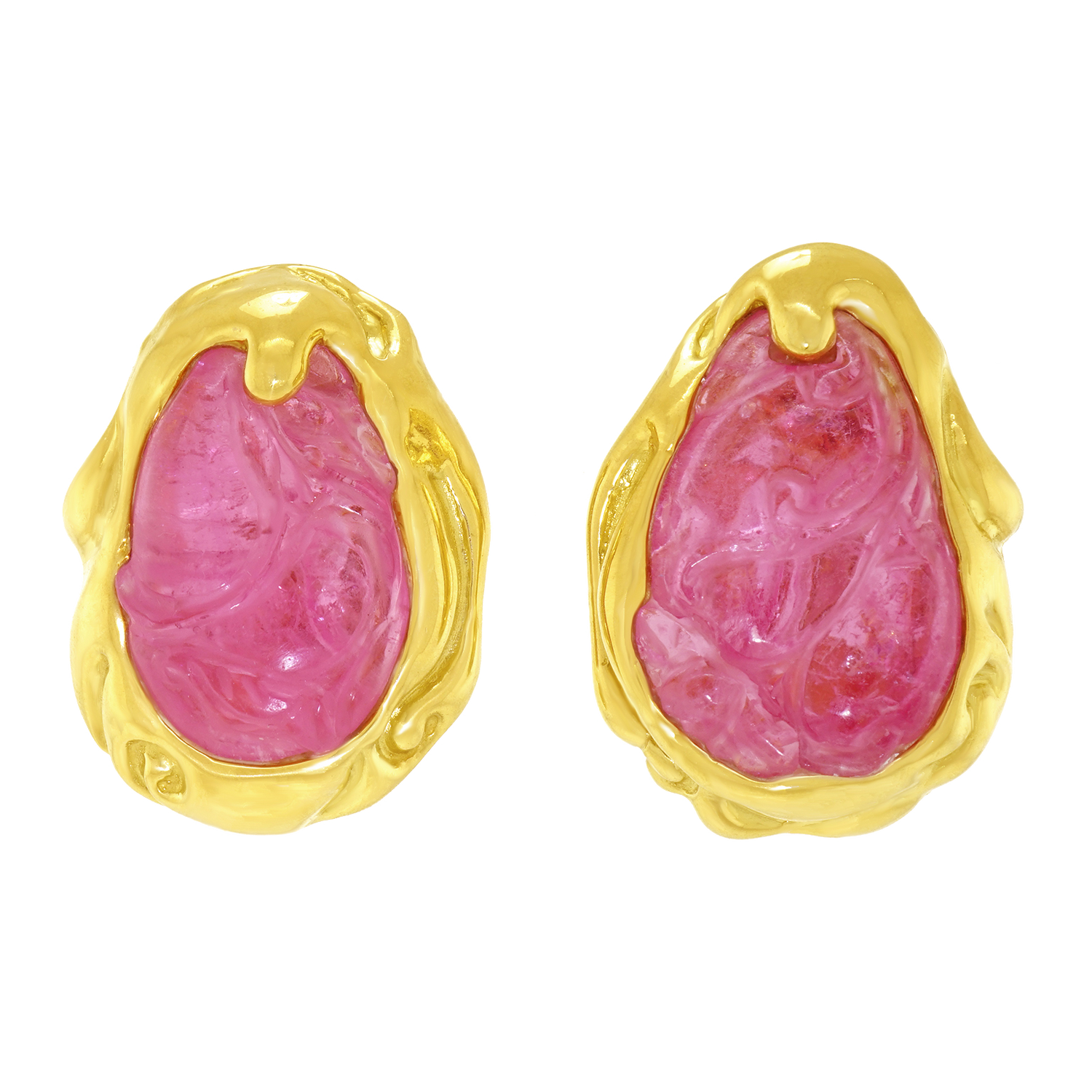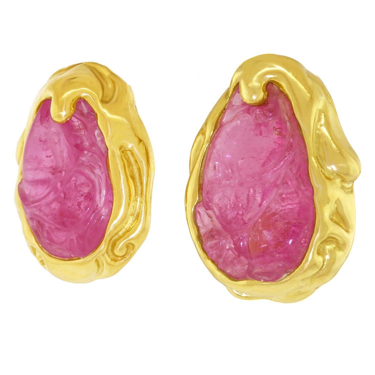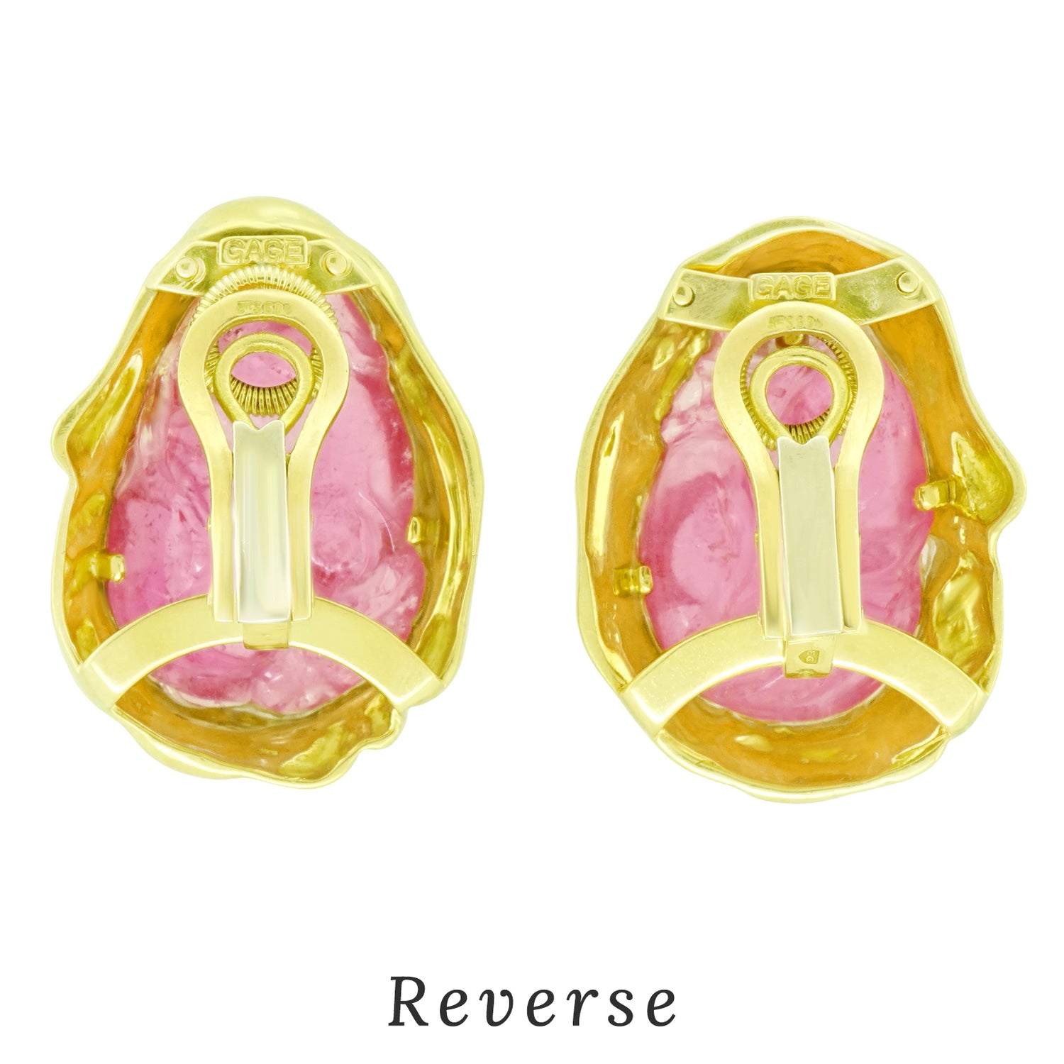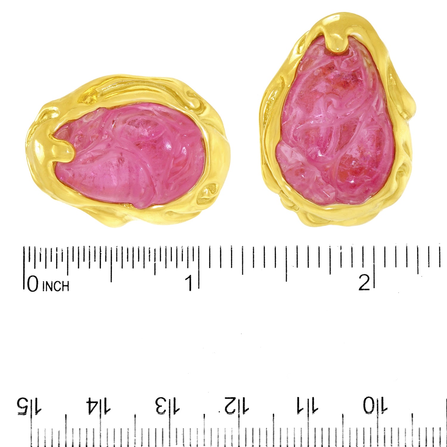 Circa 1992, 18k, by Elizabeth Gage, London.  Bright and cheerful, these Elizabeth Gage earrings feature gorgeous pink tourmalines set in rich yellow eighteen-karat gold. Made in 1992, the contemporary look is London chic all the way … abstract, timeless, and fresh! Finely made with the distinctive quality that Elizabeth Gage is famous for, they are in excellent condition.