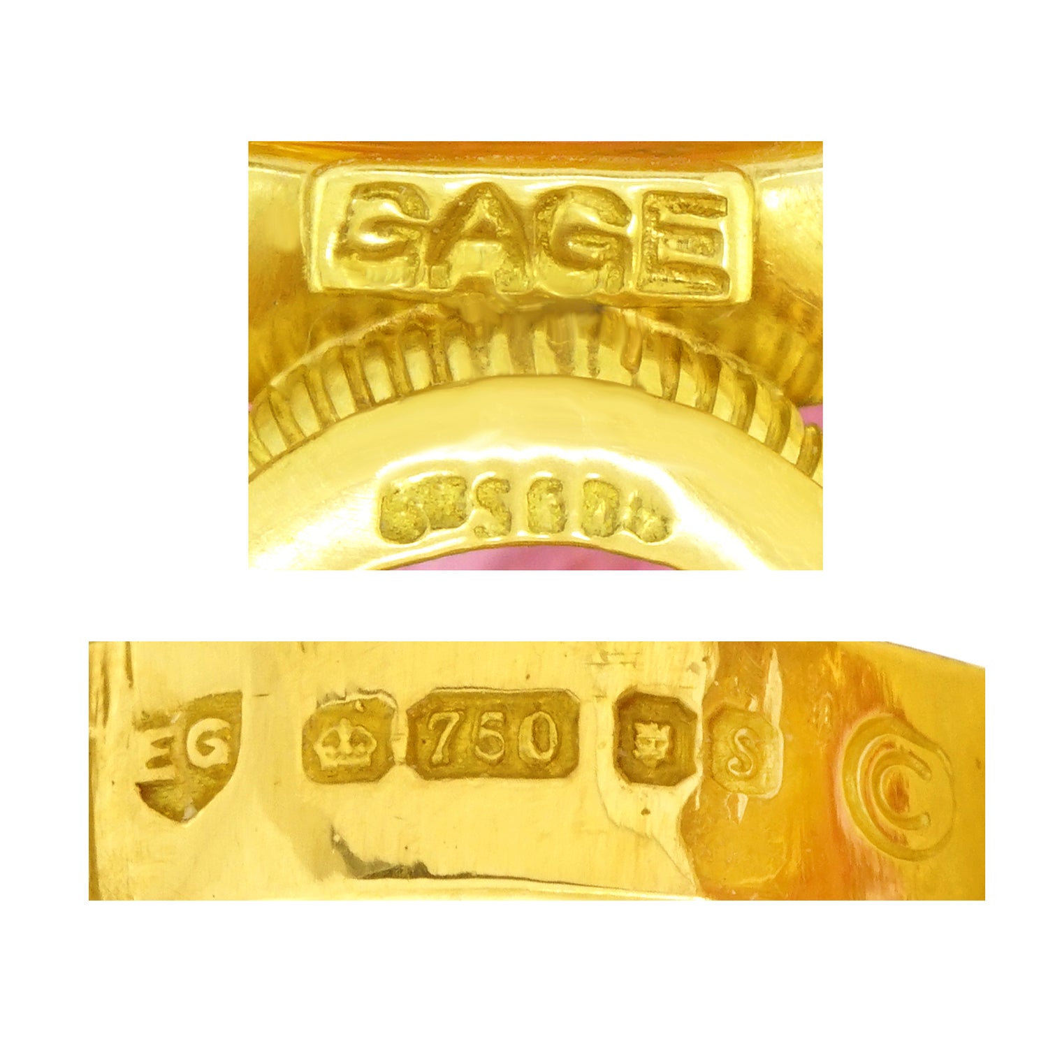 Hallmarks: GAGE, EG maker's mark for Elizabeth Gage, Crown, 750 for 18k, Leopard Head assay mark for London, date letter, along with copyright symbol.