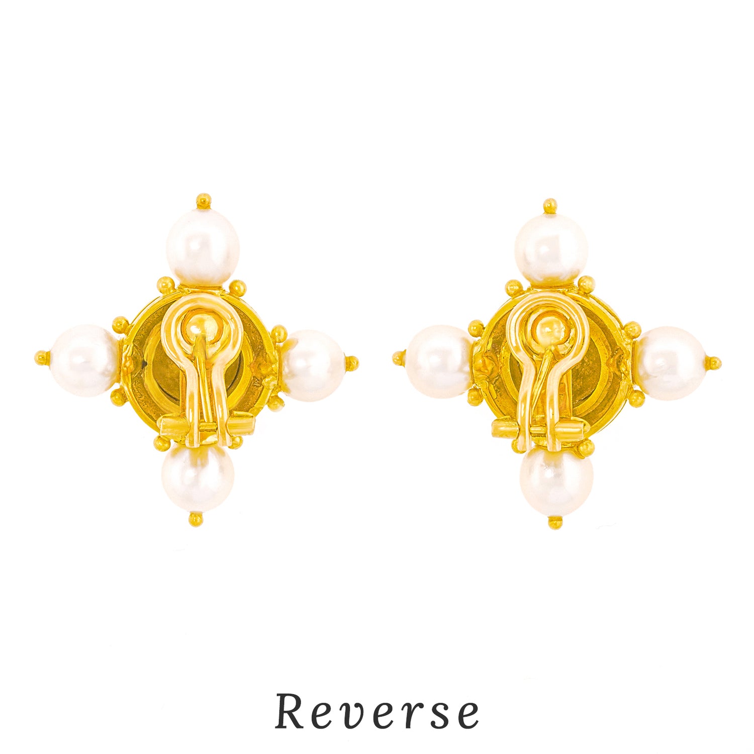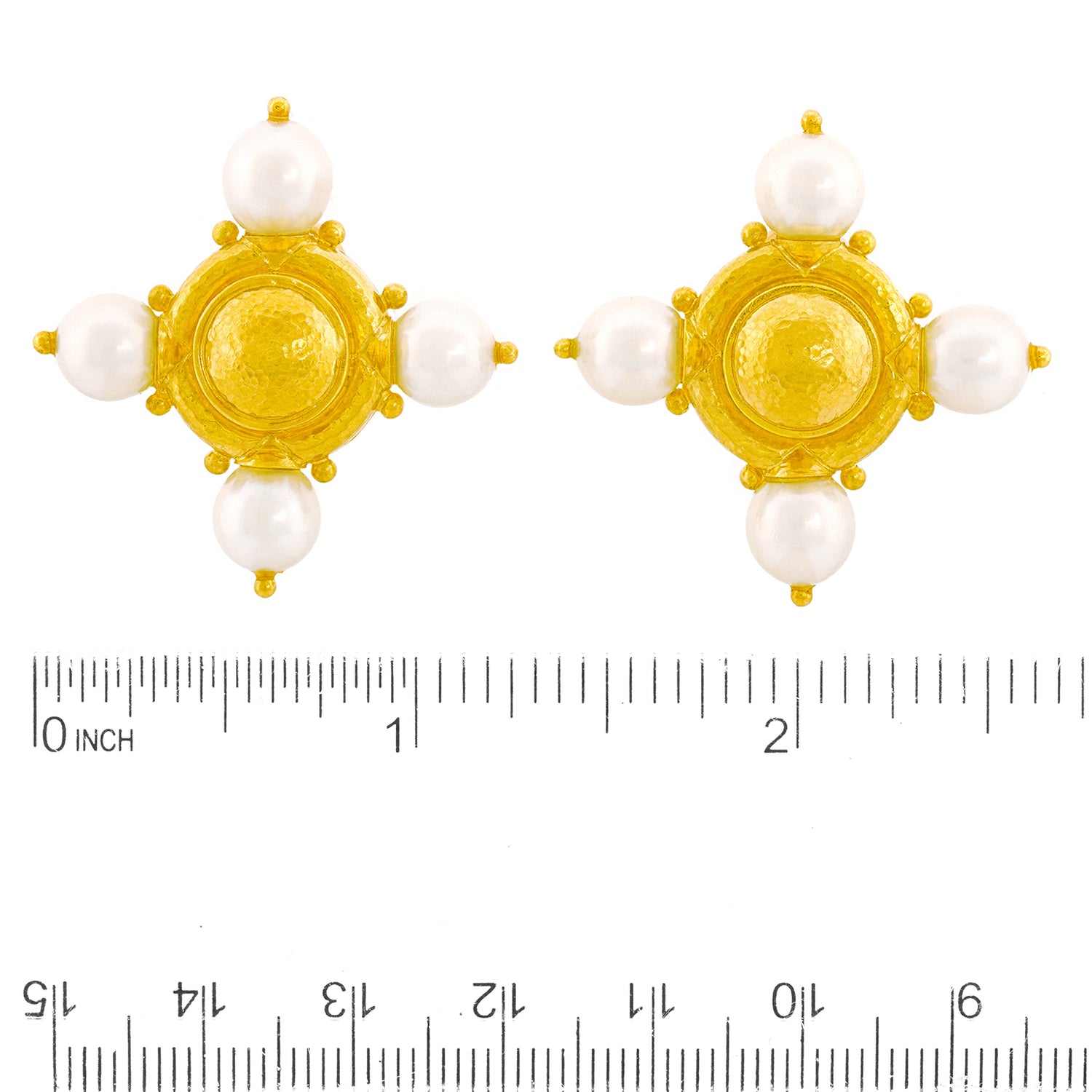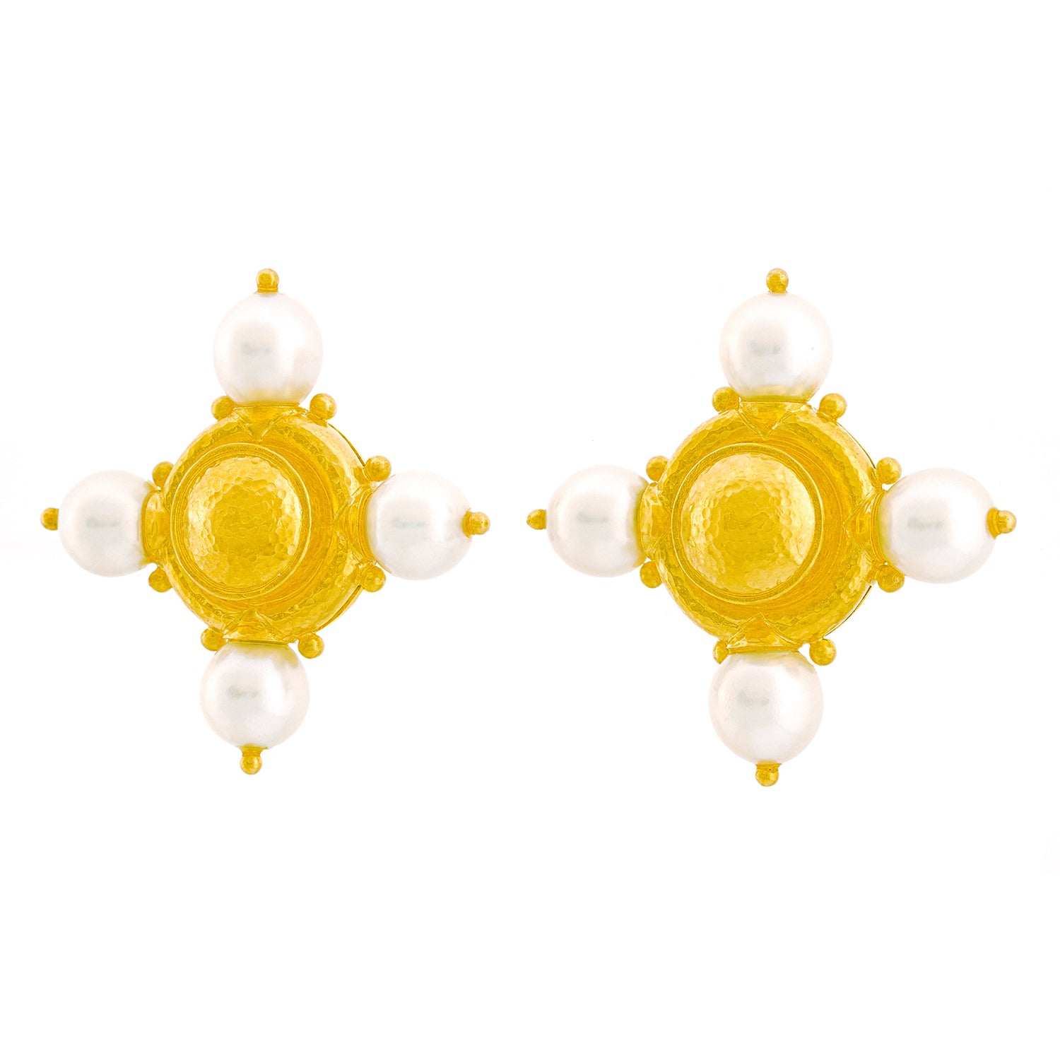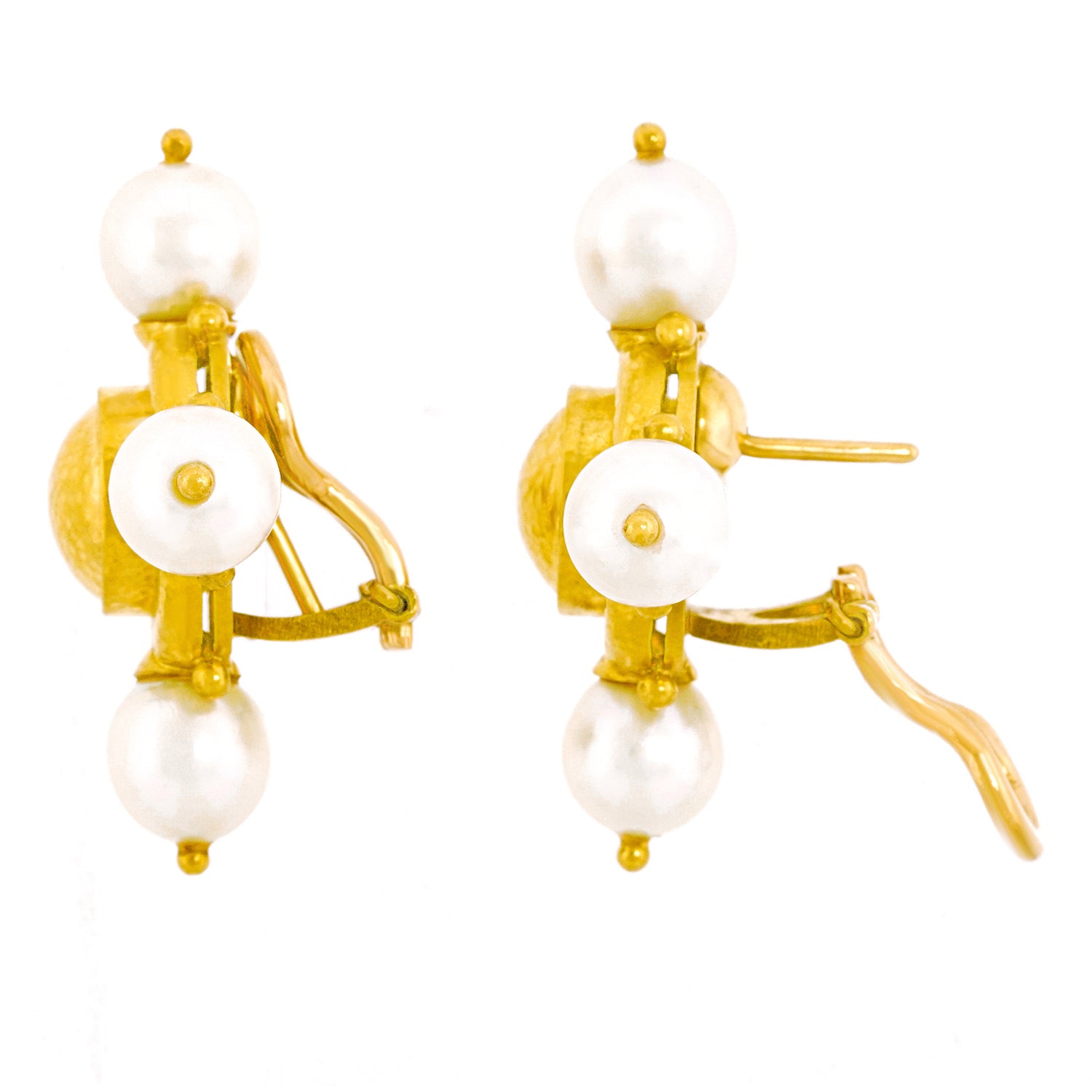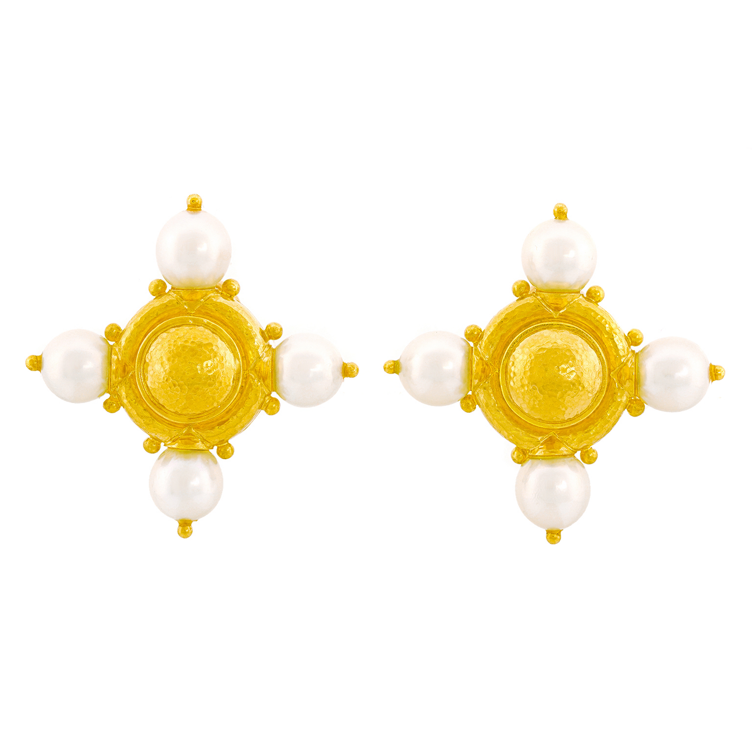Circa 1990s, 19k, by Elizabeth Locke, New York.  Known for her Renaissance Revival motifs, Elizabeth Locke's jewelry is timeless. These earrings feature a hand-hammered finish, stellar period design notes, and lustrous white pearls. Excellent condition.