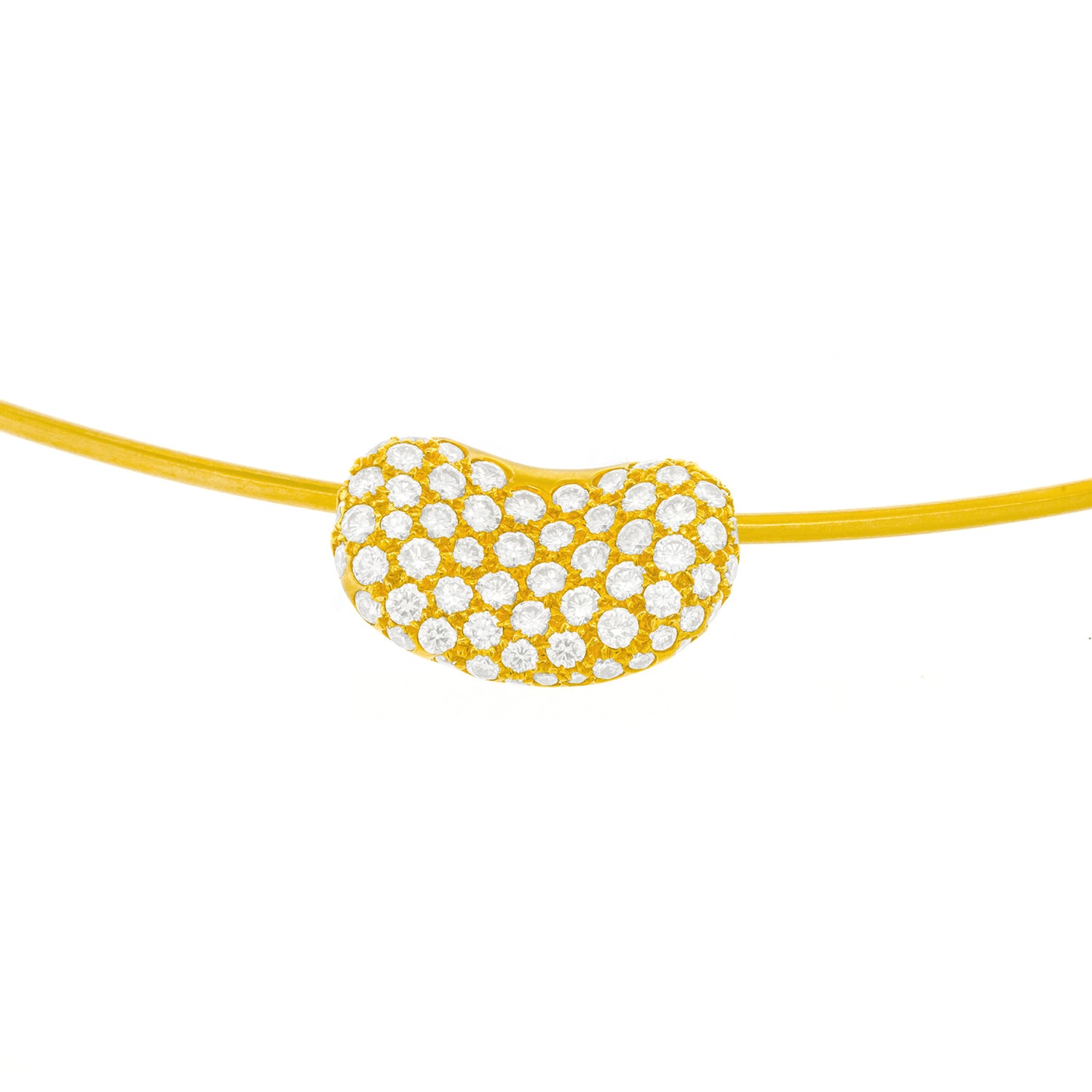 Circa 1990s, 18k, by Elsa Peretti for Tiffany & Co., New York.  The iconic bean collection was created for Tiffany & Co. by Elsa Peretti in 1974. This diamond pave bean in eighteen-karat yellow gold features 2.10 carats of brilliant white diamonds (G color, VS clarity). There have been many delightful pieces created in this collection, but this might be my favorite! Perfect on its own, dressed up or dressed down, or as the top necklace in a multiples look, this piece does it all! Excellent condition.