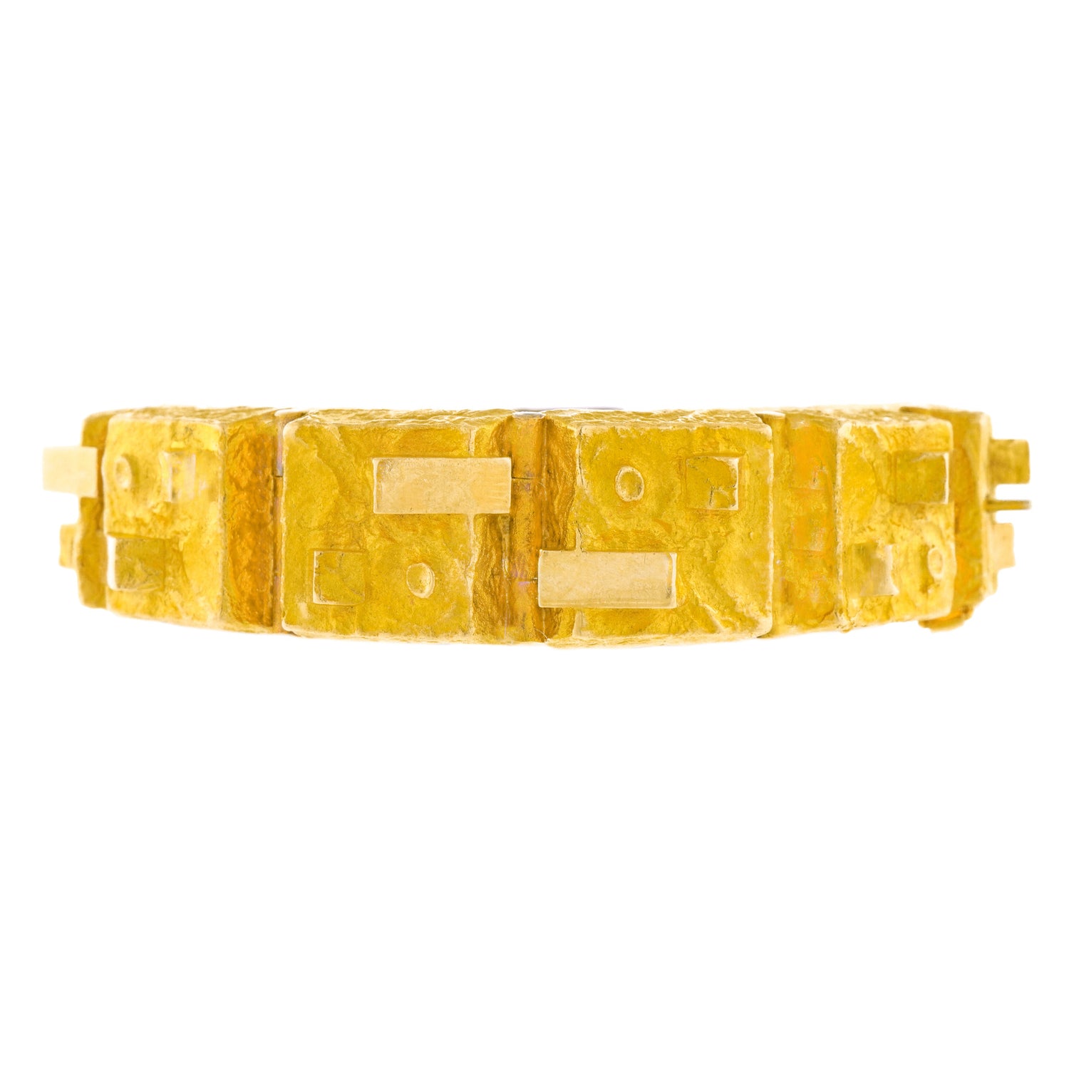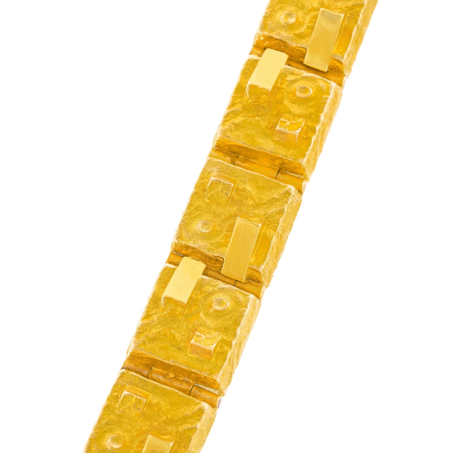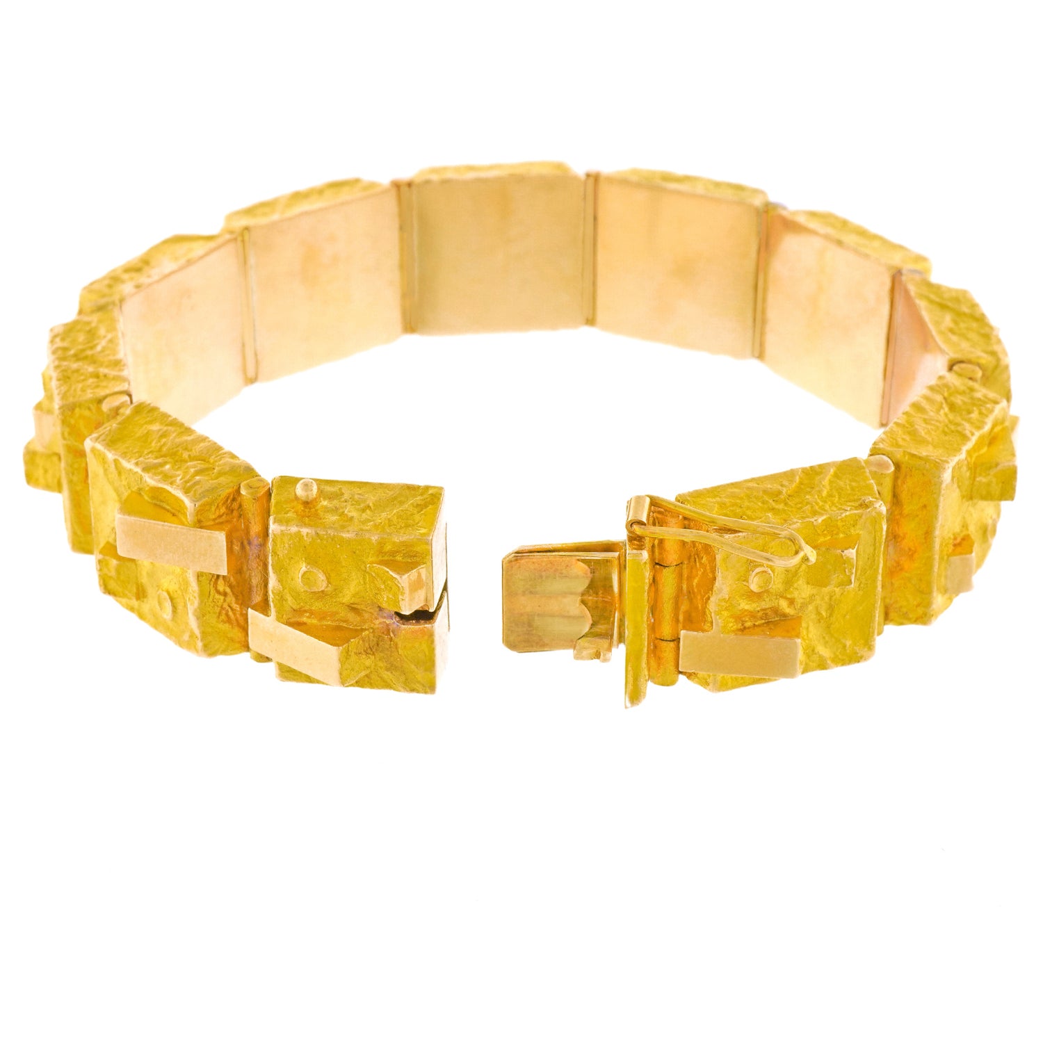 Circa 1970, 14k, by Nils Westerback, Finland. This bracelet is a spectacular example of Finnish artist Nils Westerback's jewelry. Stunning in its jagged imperfection, its links feature a brutalist landscape of textured and polished gold. The contrasting forms and varied surfaces create visual excitement for a brilliantly chic all-gold look. Exceptional in design and execution, this bracelet resonates with his sculptural work. Excellent condition.