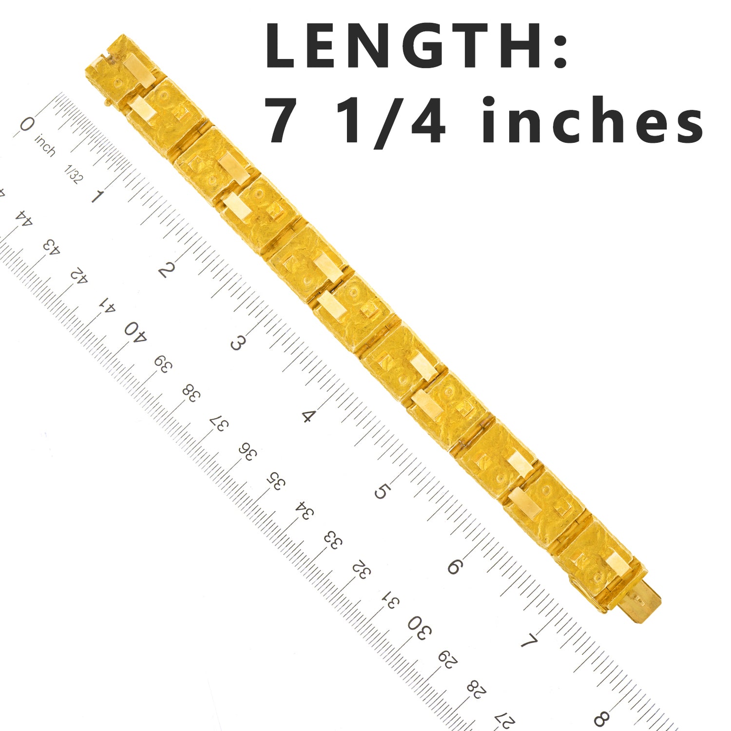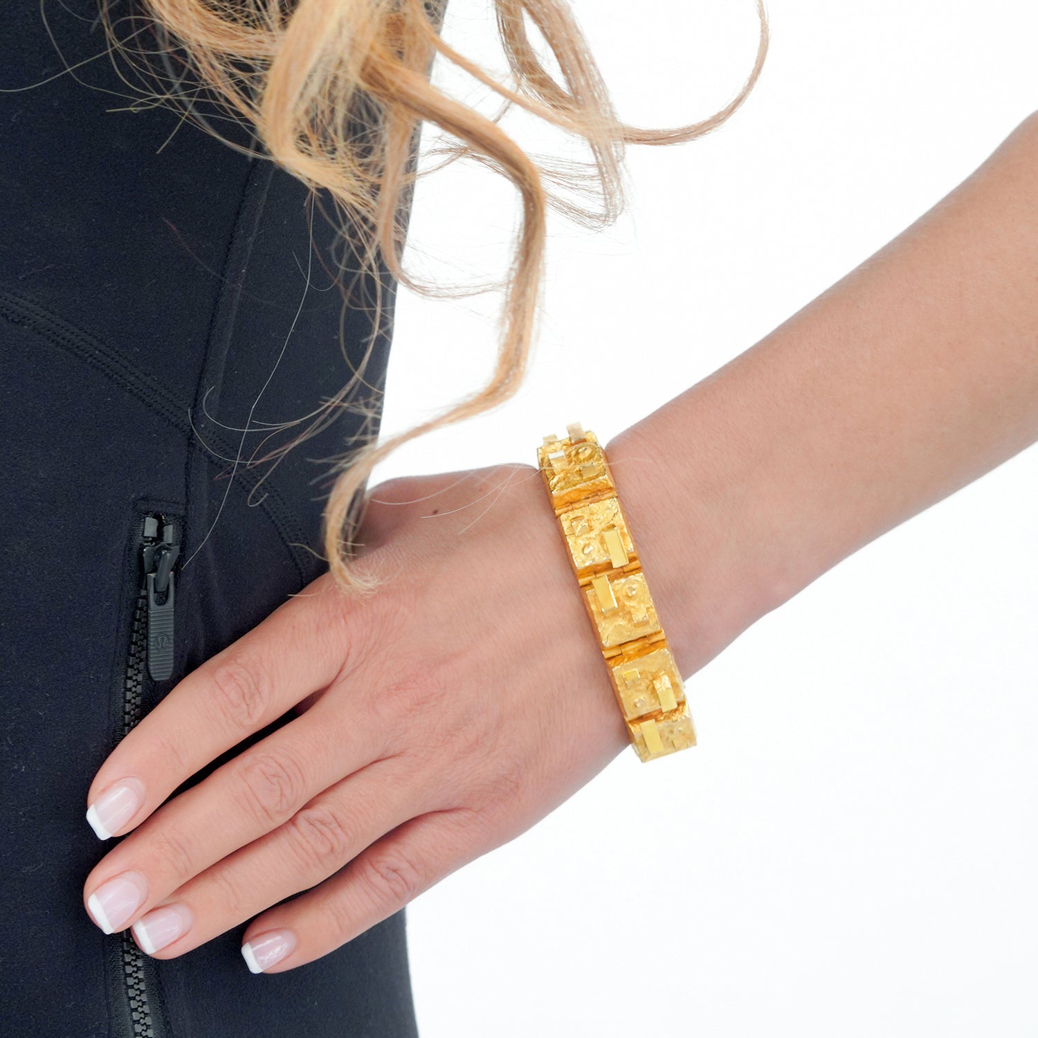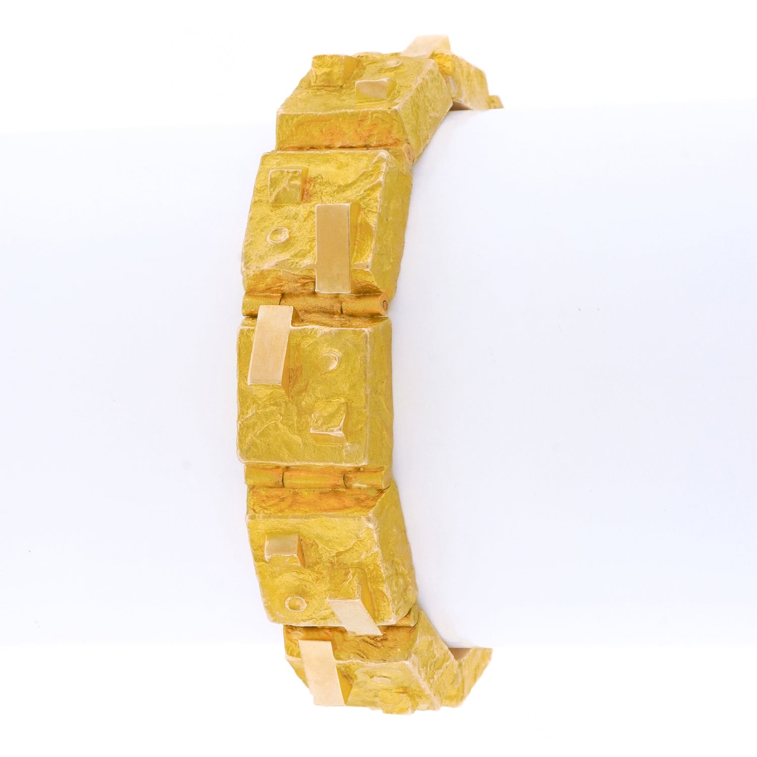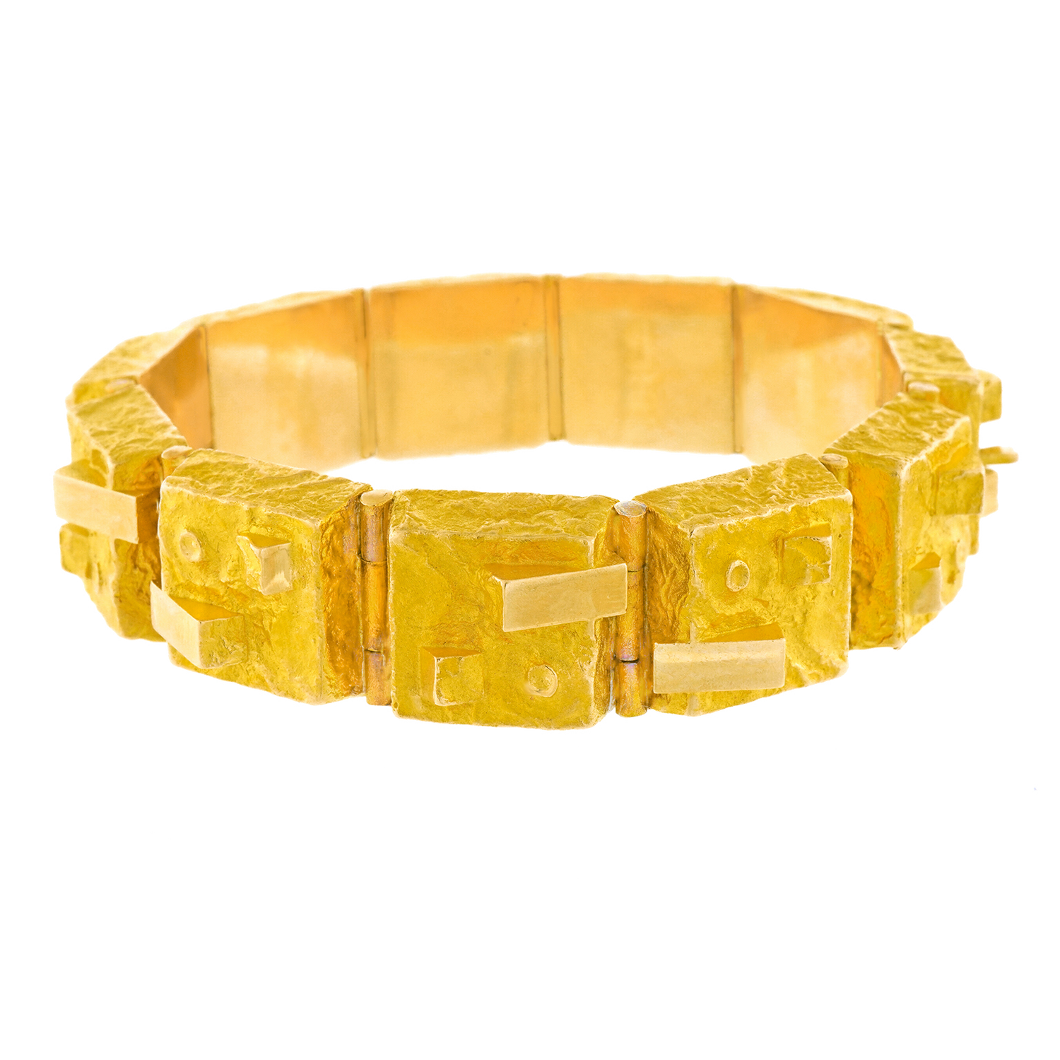 Circa 1970, 14k, by Nils Westerback, Finland. This bracelet is a spectacular example of Finnish artist Nils Westerback's jewelry. Stunning in its jagged imperfection, its links feature a brutalist landscape of textured and polished gold. The contrasting forms and varied surfaces create visual excitement for a brilliantly chic all-gold look. Exceptional in design and execution, this bracelet resonates with his sculptural work. Excellent condition.