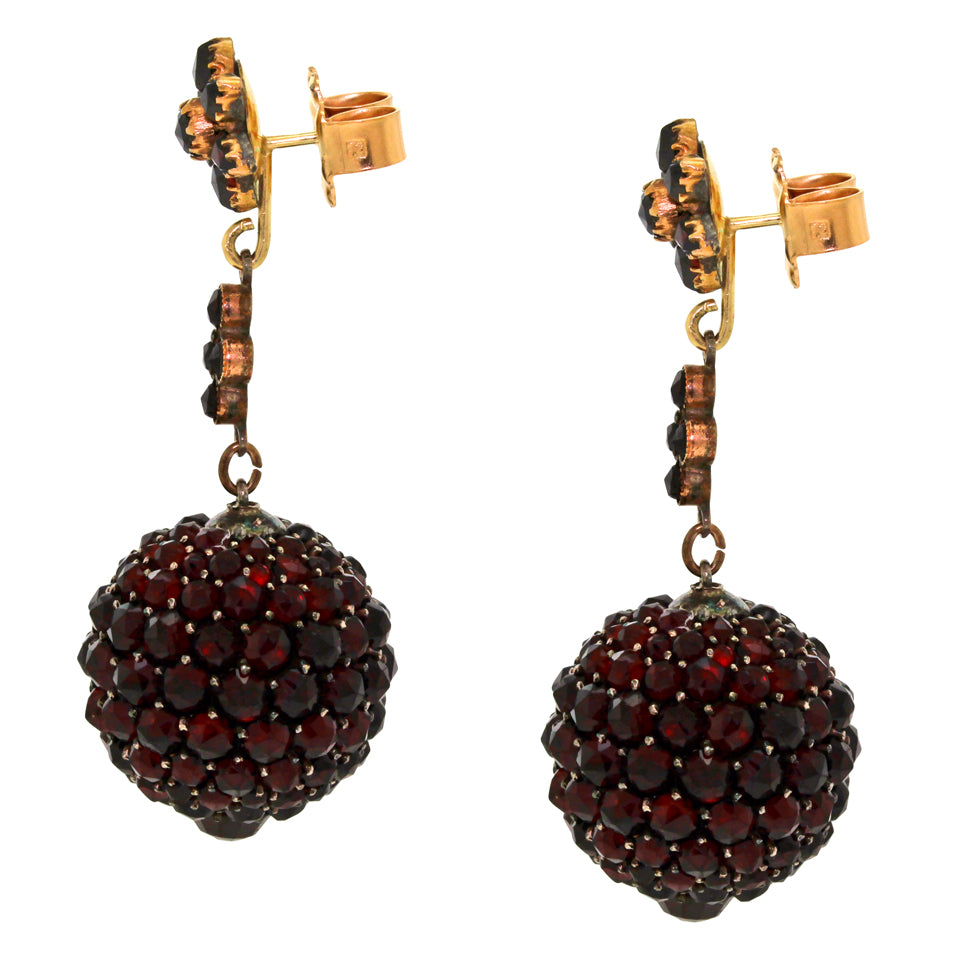 Circa 1880-1900, gilt silver and 14k gold, attributed Austrian.  These amazing Victorian earrings have remained in style and fashionable for over 125 years.  Their bold look has a unique verve that captures the imagination while turning heads.  A superlative technical achievement, the dangling balls are set with fire-red Bohemian garnets which smolder like embers when they catch the light.  These earrings are sublime marriages remade most probably in the 1920s from three components all late Victorian. This is vintage chic at its one-of-a-kind best.