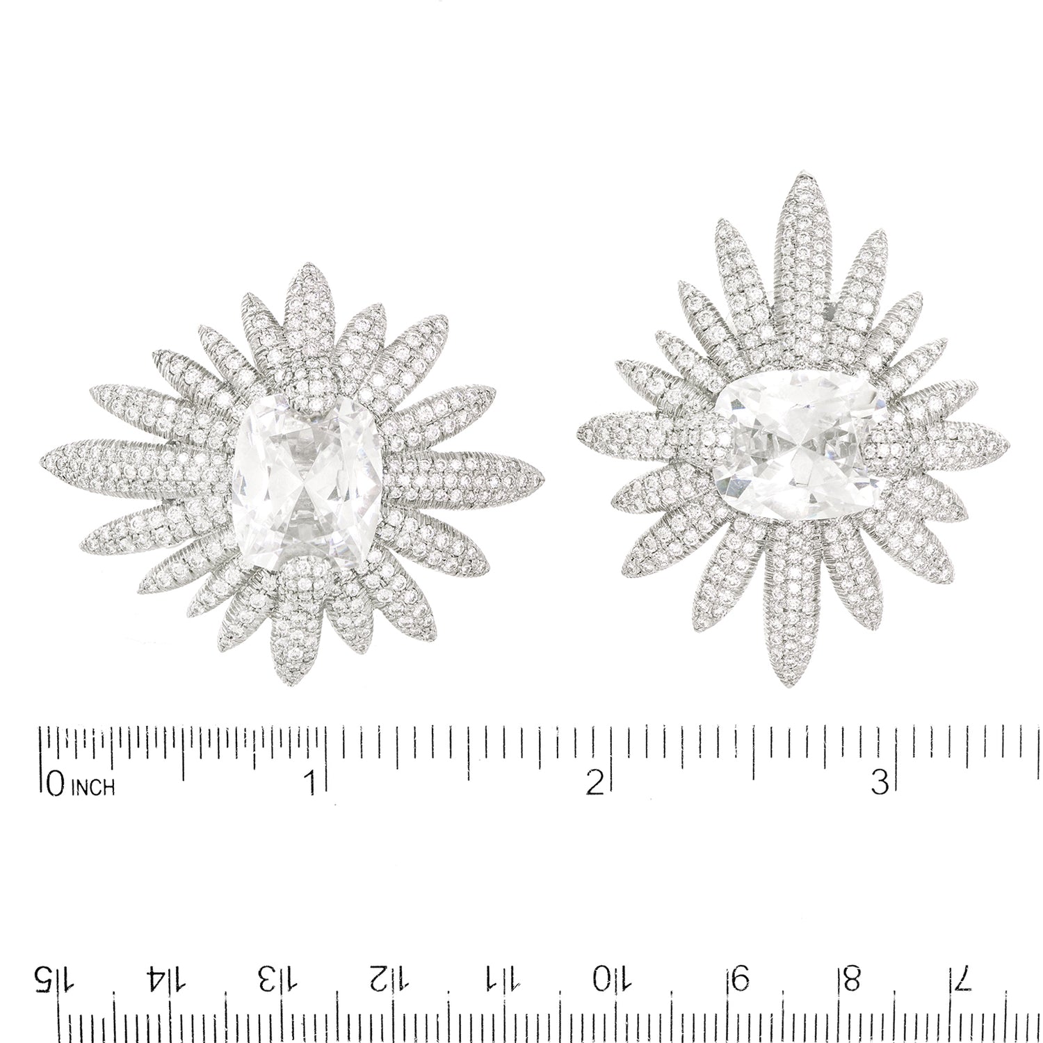 Circa 1980s, 14k and sterling, by Patrick.  Big fashion, lots of diamonds, big look! These earrings feature 6.50 carats of brilliant white diamonds (G color, VS clarity) and a pair of superb cushion-cut rock crystal stones. The look is high glamor, perfect for sleek or maximal looks. Fabricated in sterling silver and 14k gold, these earrings are well-made and comfortable.  Excellent condition.
