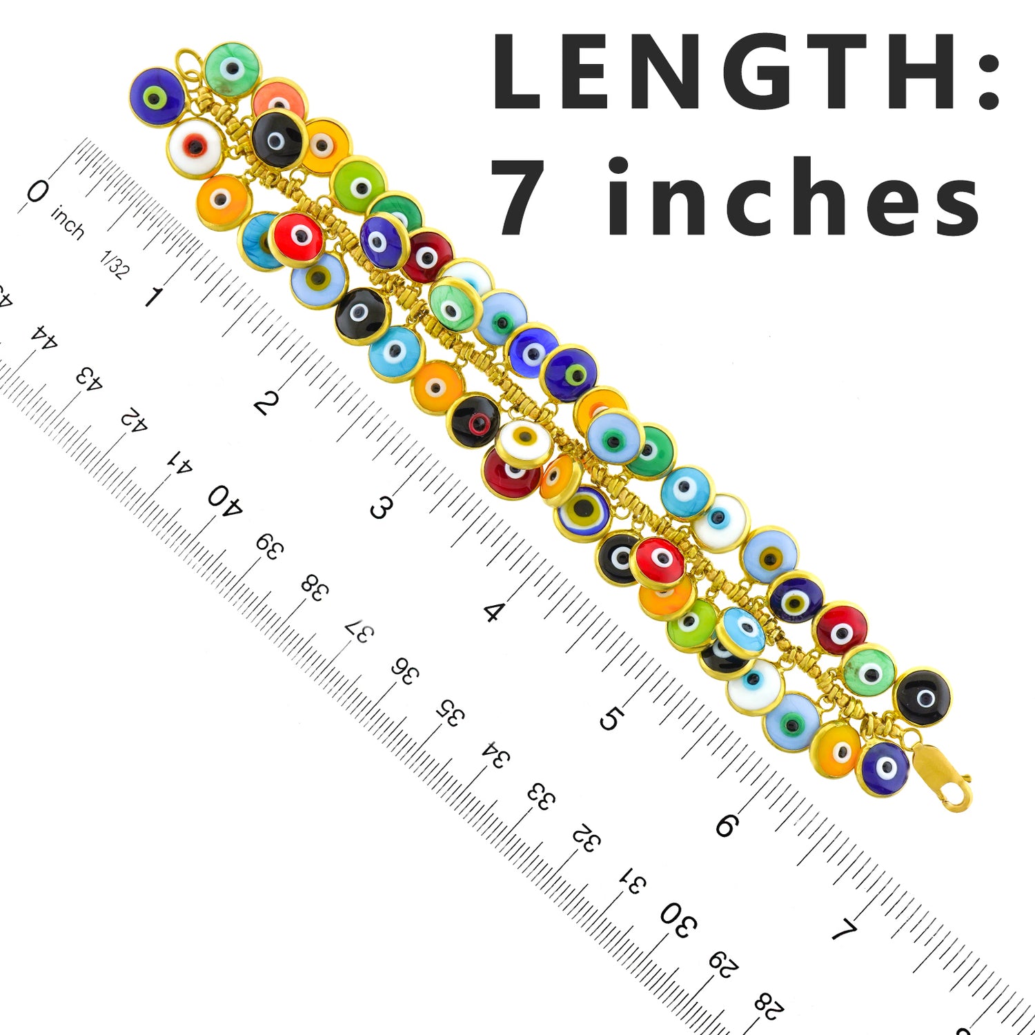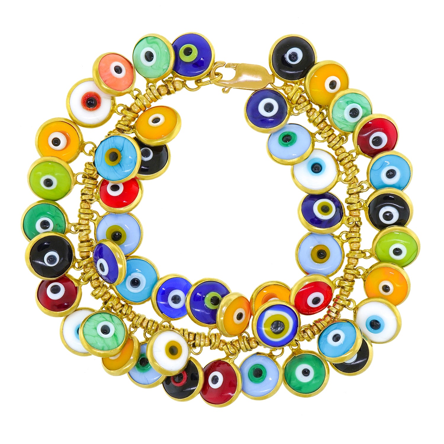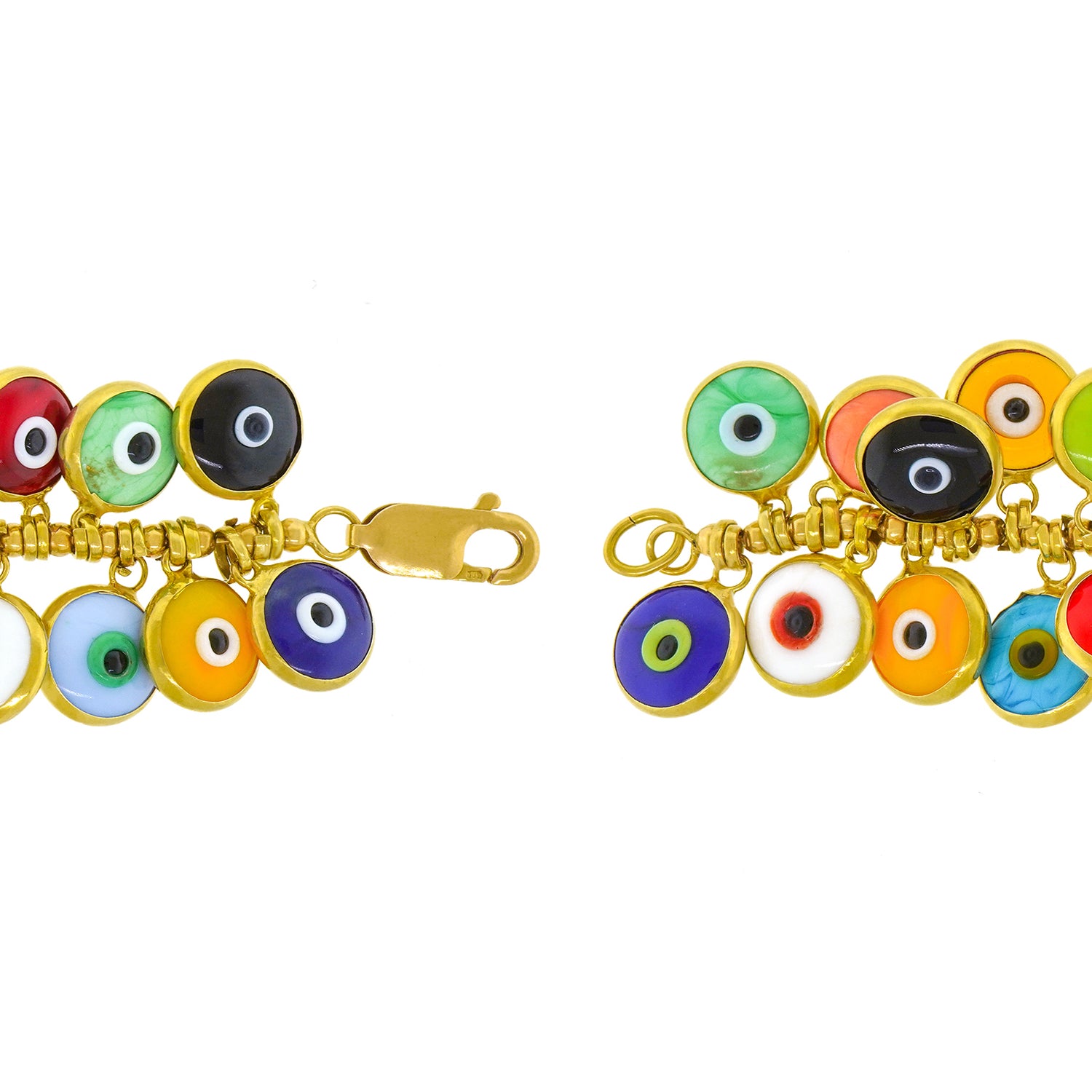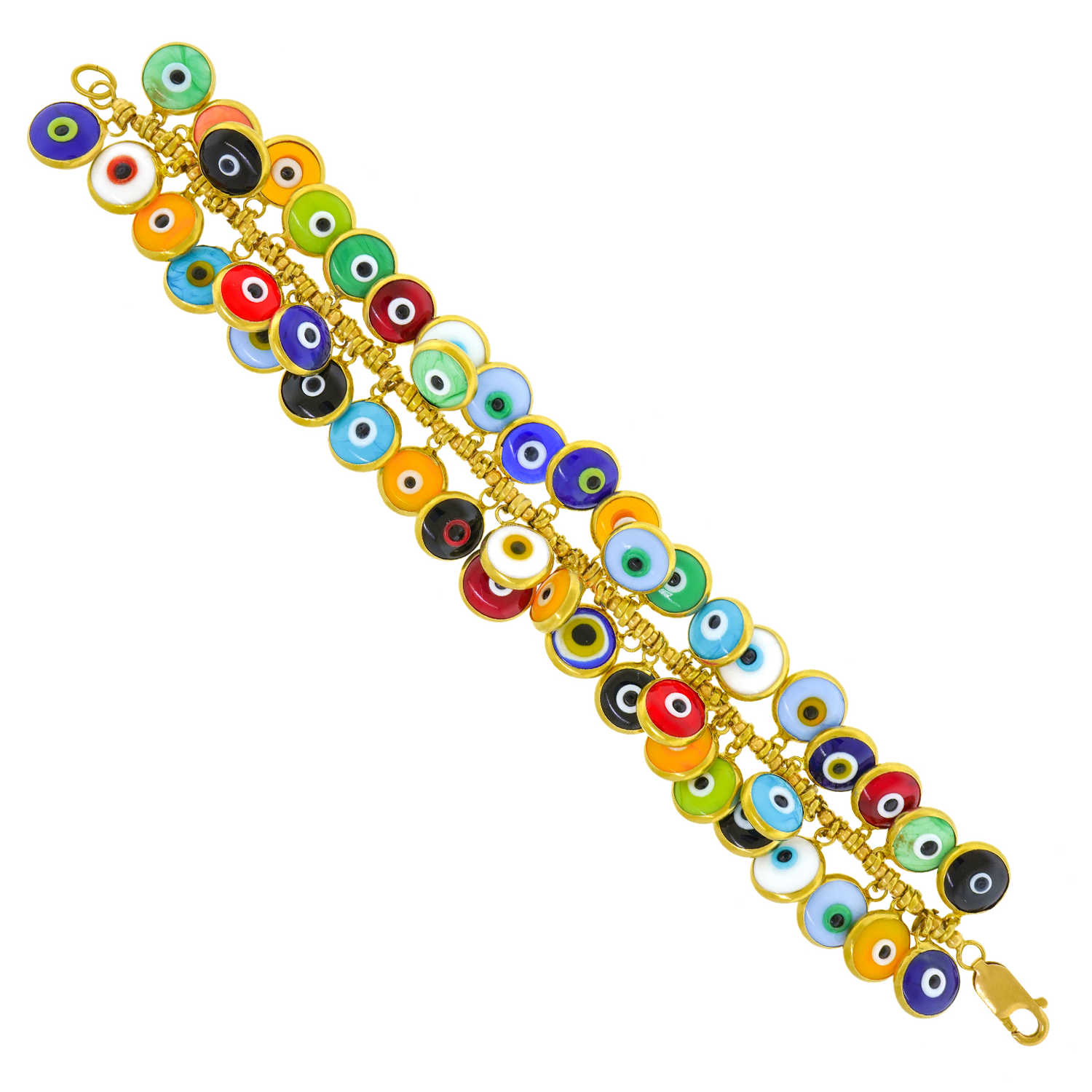 Circa 1990s, 14k.  Colorfully fun, and delightfully playful, this bracelet is summer accessory perfection. Featuring Venetian glass, the evil eye, a charm of protection for centuries, is brilliant au-courante fashion for everyday wear. This one is finely fashioned and in excellent condition.