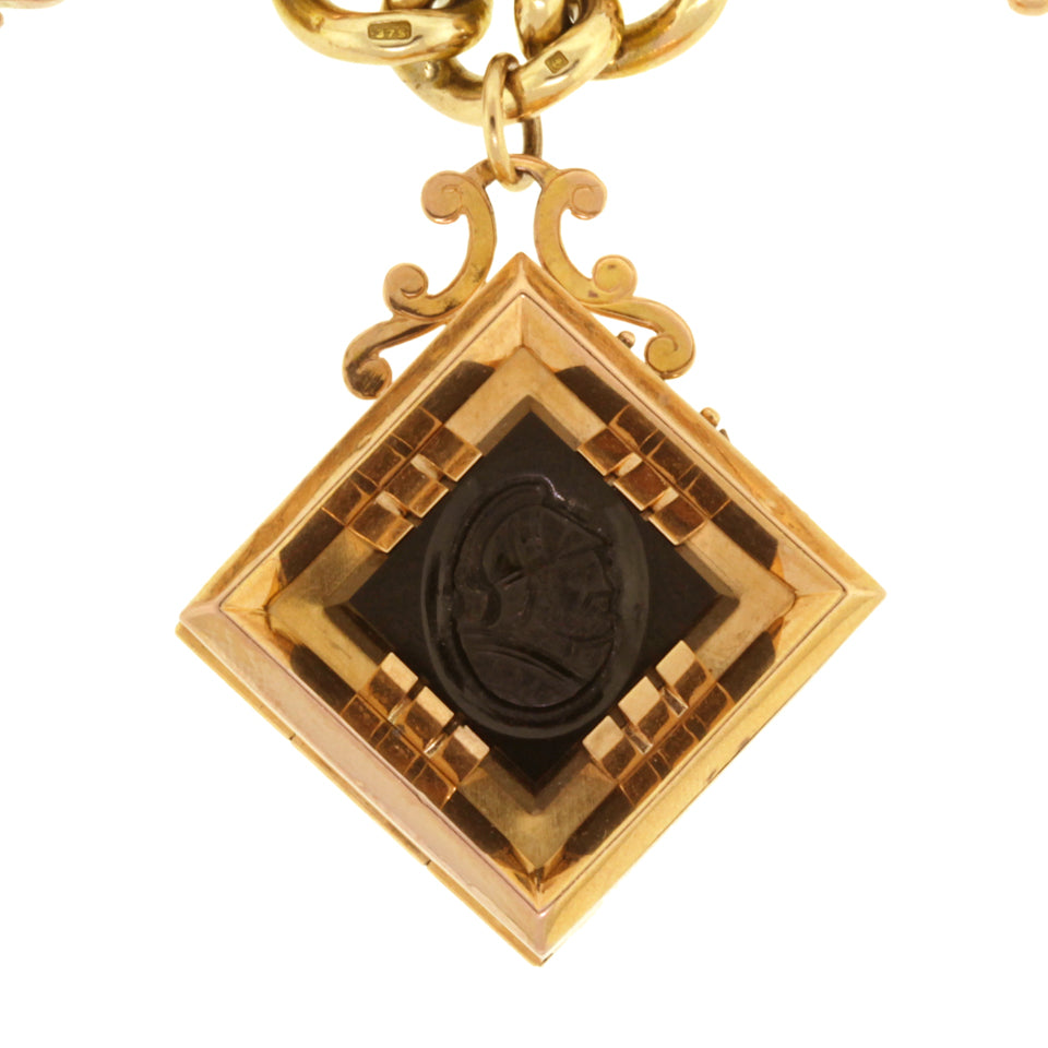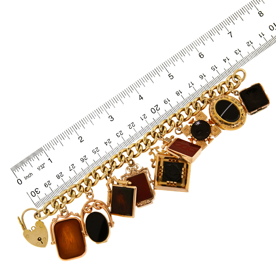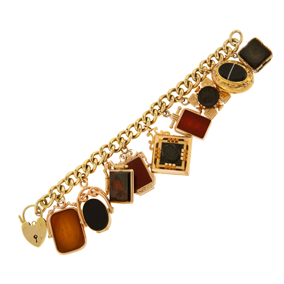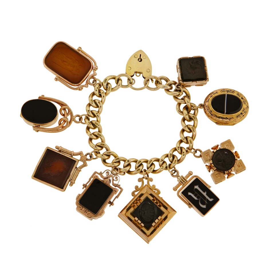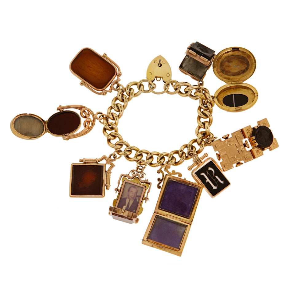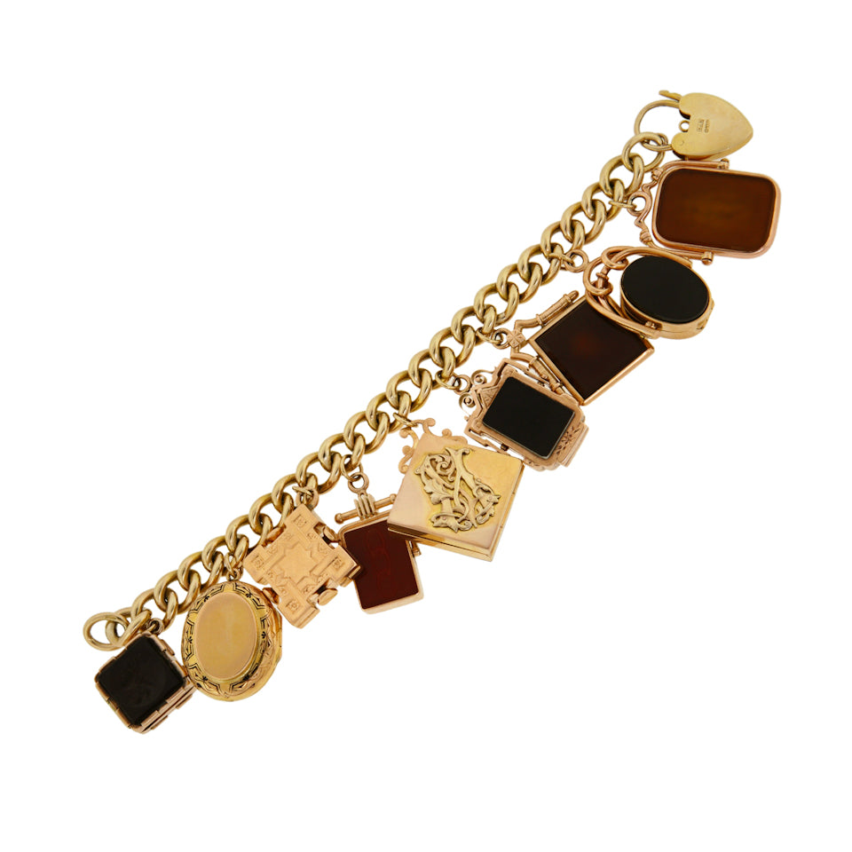 9k, 14k, 18k, English. Pieces dating from 1870 to 1910. On an English, mid-20th Century 9k bracelet.  Festooned with 14k and 18k gold lockets and fobs dating from 1870 to 1910, this bracelet is a  chic one-of-a-kind. The 9k padlock bracelet is English from the mid-20th Century. Excellent condition.