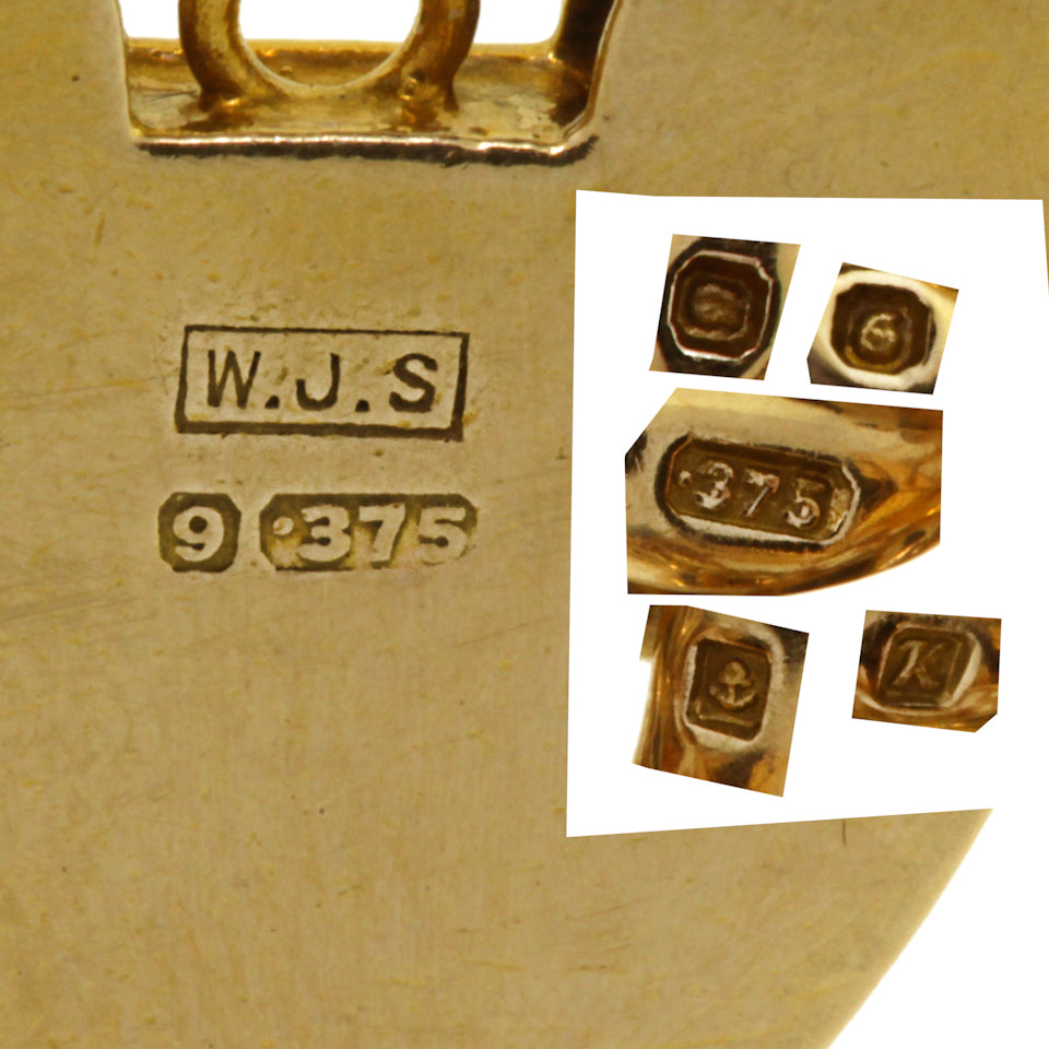 Hallmarks: 375 for 9k, maker's mark WJS, on bracelet, charms are 14k and 18k, tested