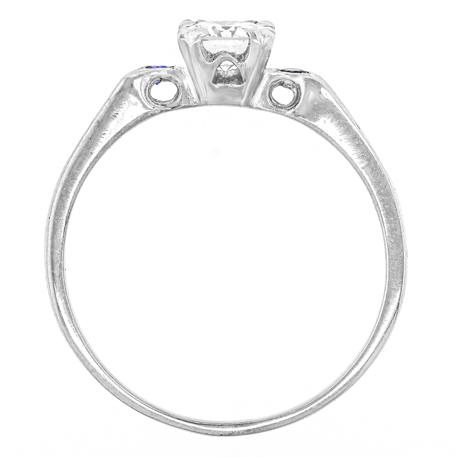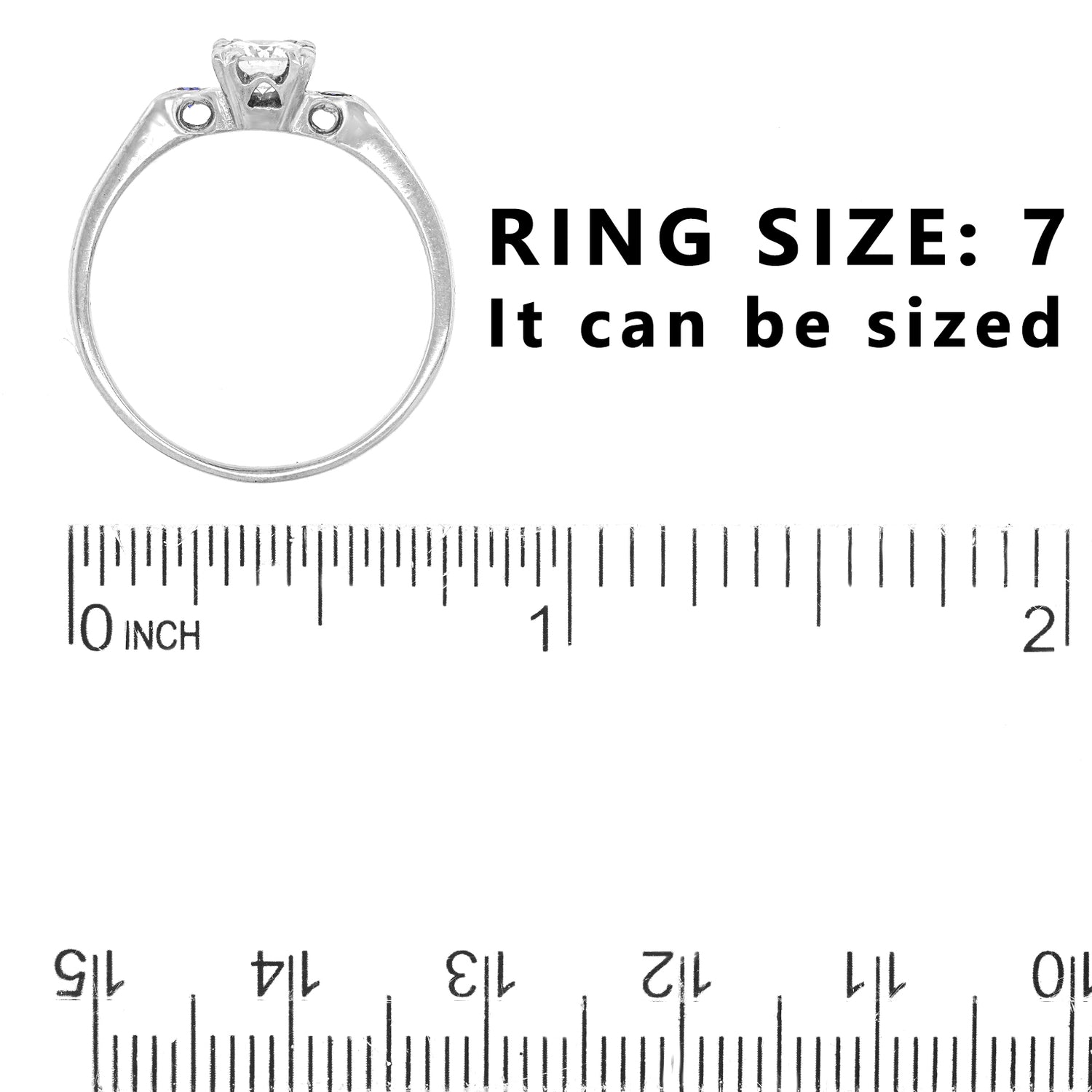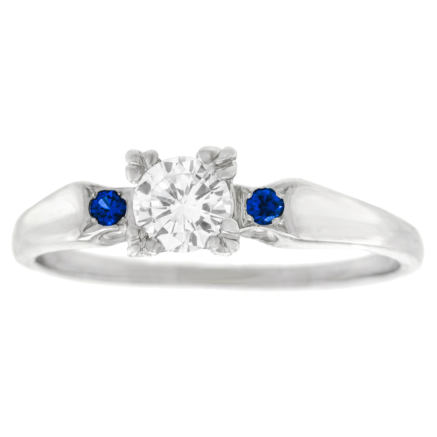 Circa 1950s, 14k, American.  This diamond engagement ring is a charming classic. Made in white gold and set with a .33-carat brilliant white diamond (H color VS clarity) and .05 carats of fine blue sapphires, its good looks are underscored by quality fabrication.  Excellent condition.