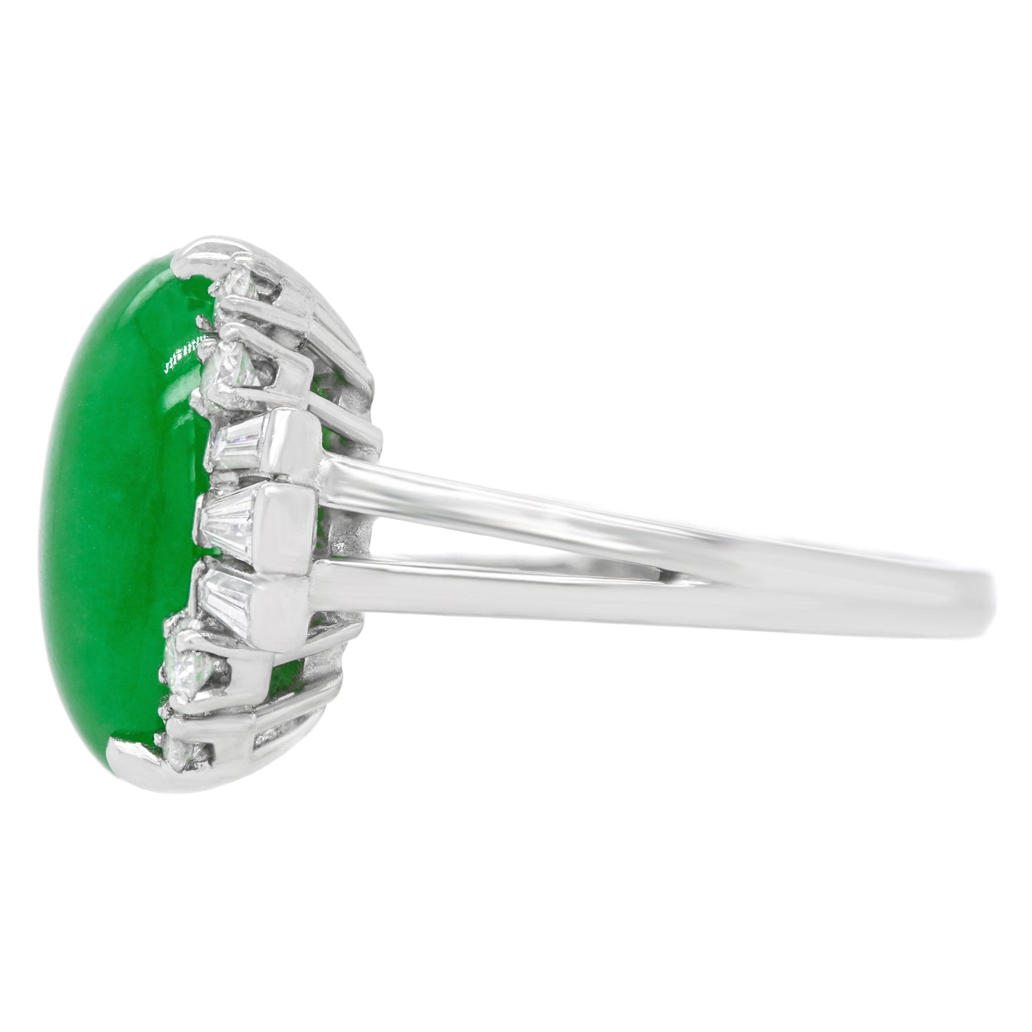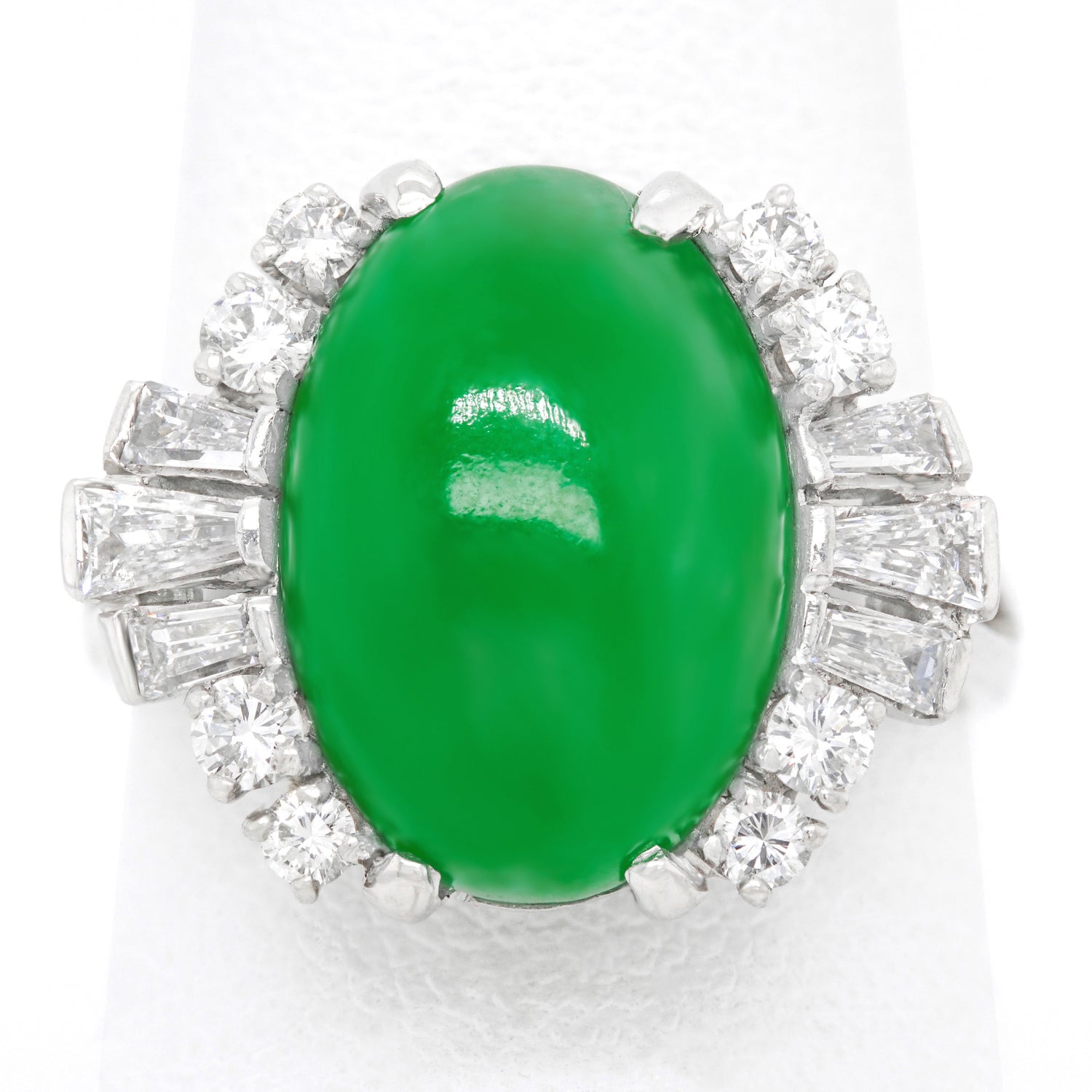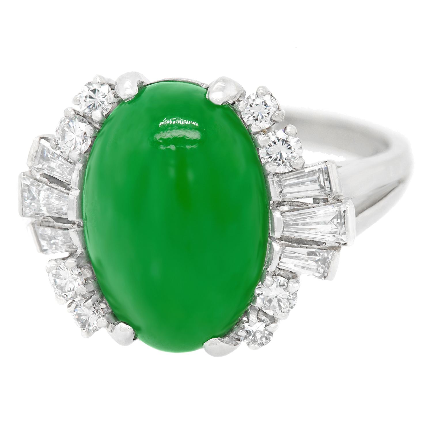 Circa 1950s, Platinum, by F&F Felger, Newark, NJ, American. This sublime fifties platinum ring features brilliant white diamonds (G color VS clarity) surrounding a superb natural green jade cabochon. Using only the finest materials available, this meticulously fabricated ring by F&F Felger of Newark, New Jersey, is accompanied by a GIA laboratory report guaranteeing the jade as natural with no impregnation or alteration of color. Excellent condition.