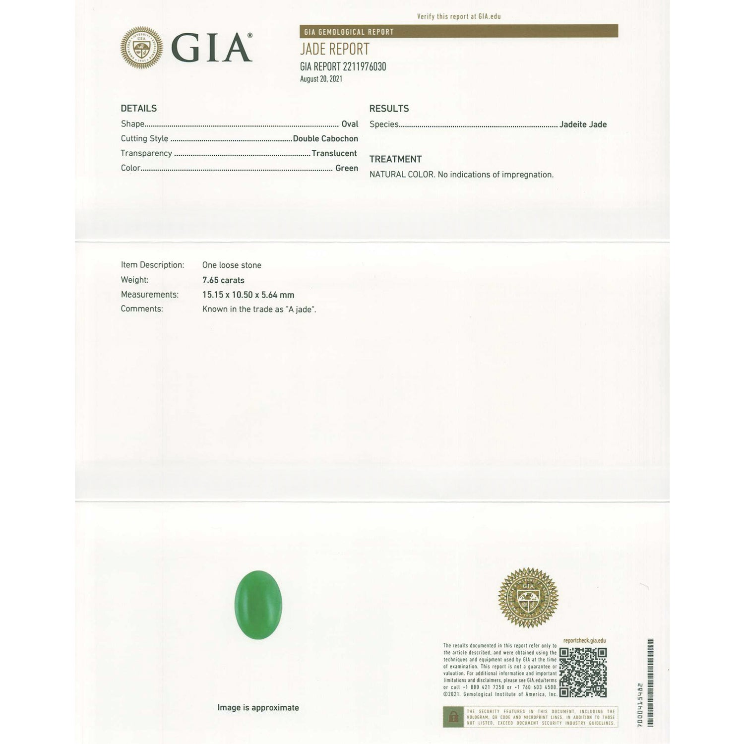 Certificates: GIA report number 2211976030