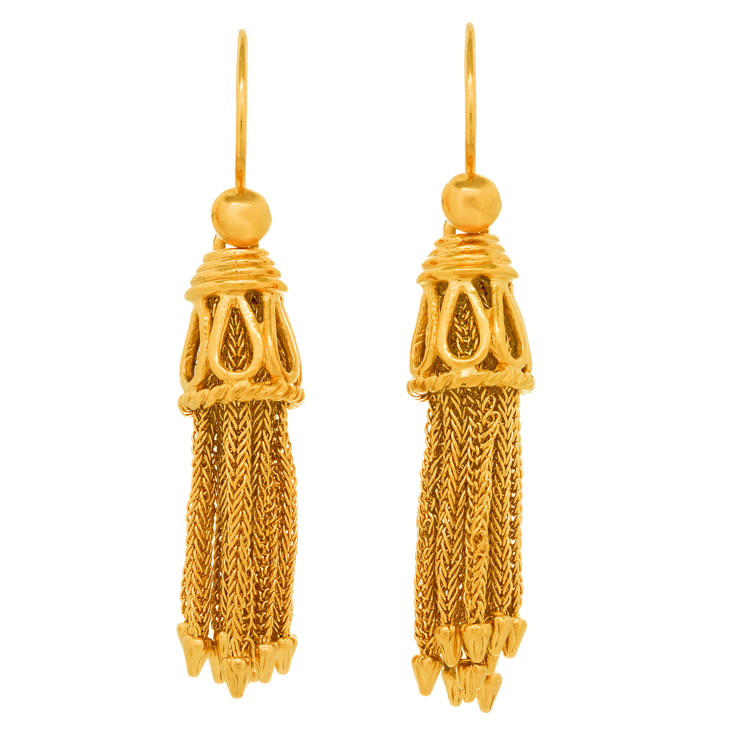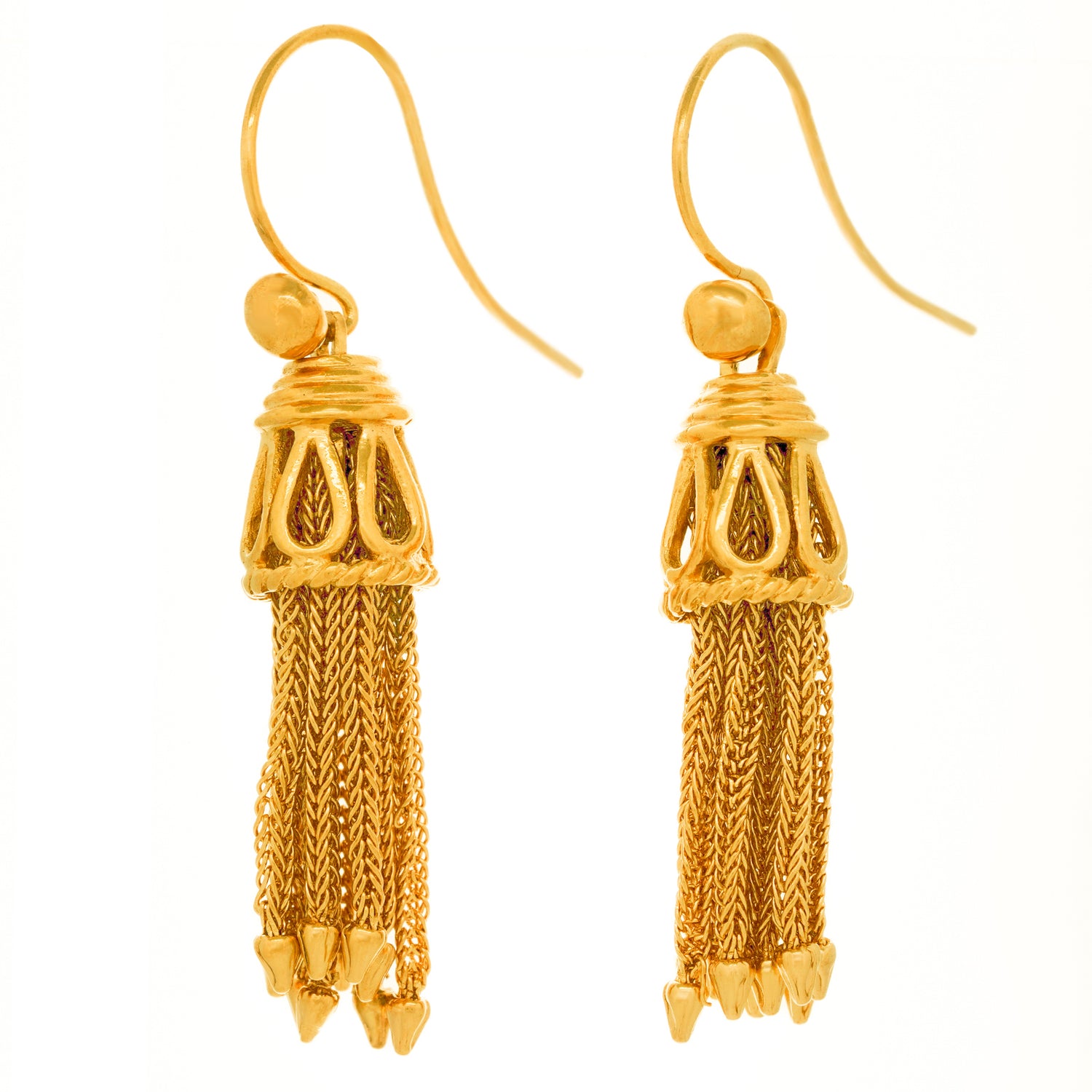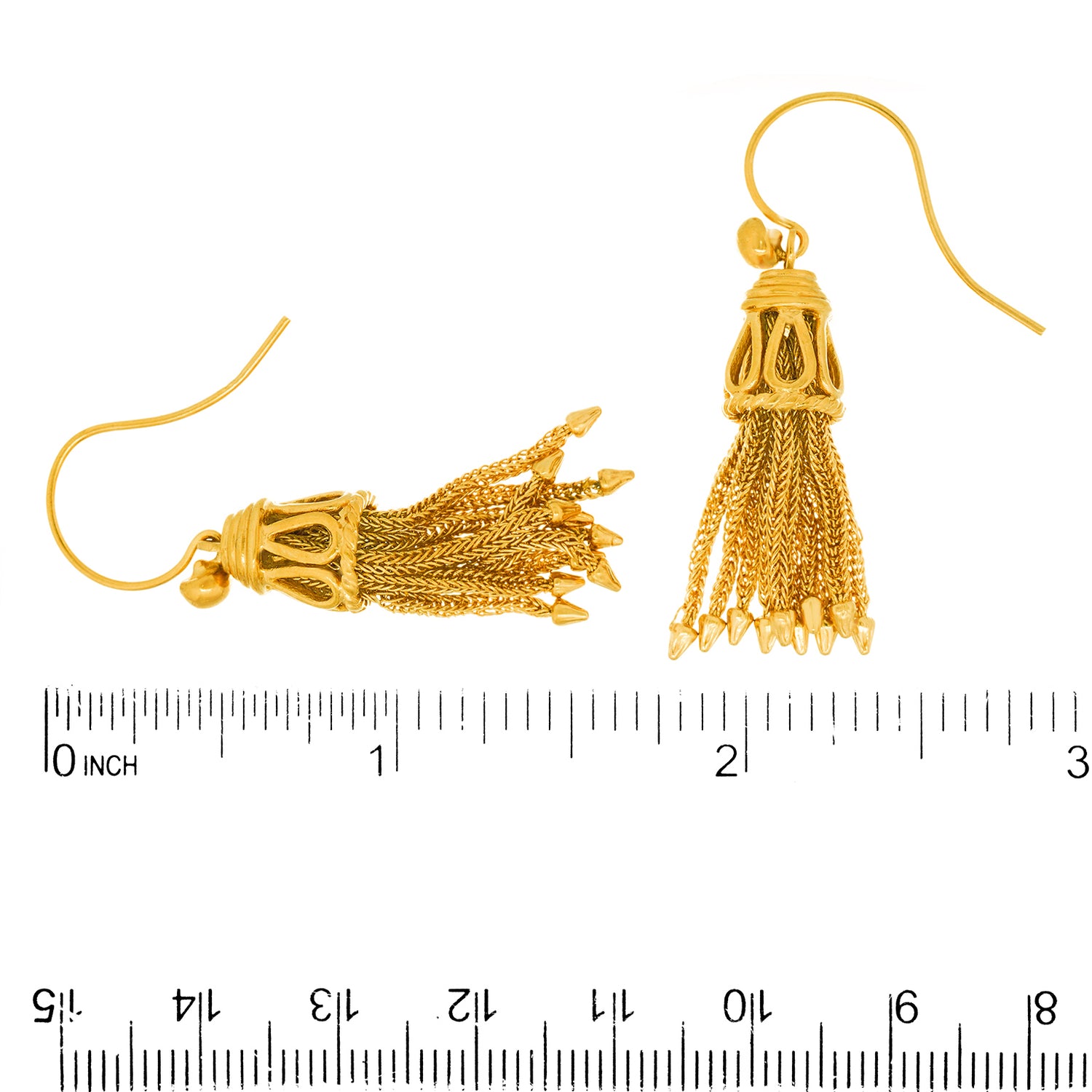 Circa 1950s, 14k, American.  These fabulous fifties earrings feature handmade tassels in a detailed gold top. Tassel earrings are a perennial fashion favorite. Rife with flirty movement, the look is vintage chic at its au courant best! Finely fashioned in 14k gold, they are in excellent condition.