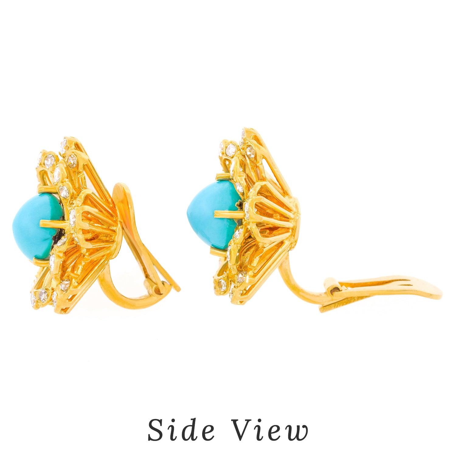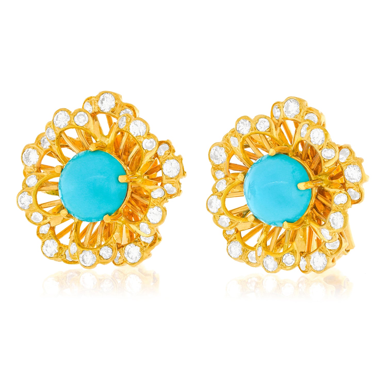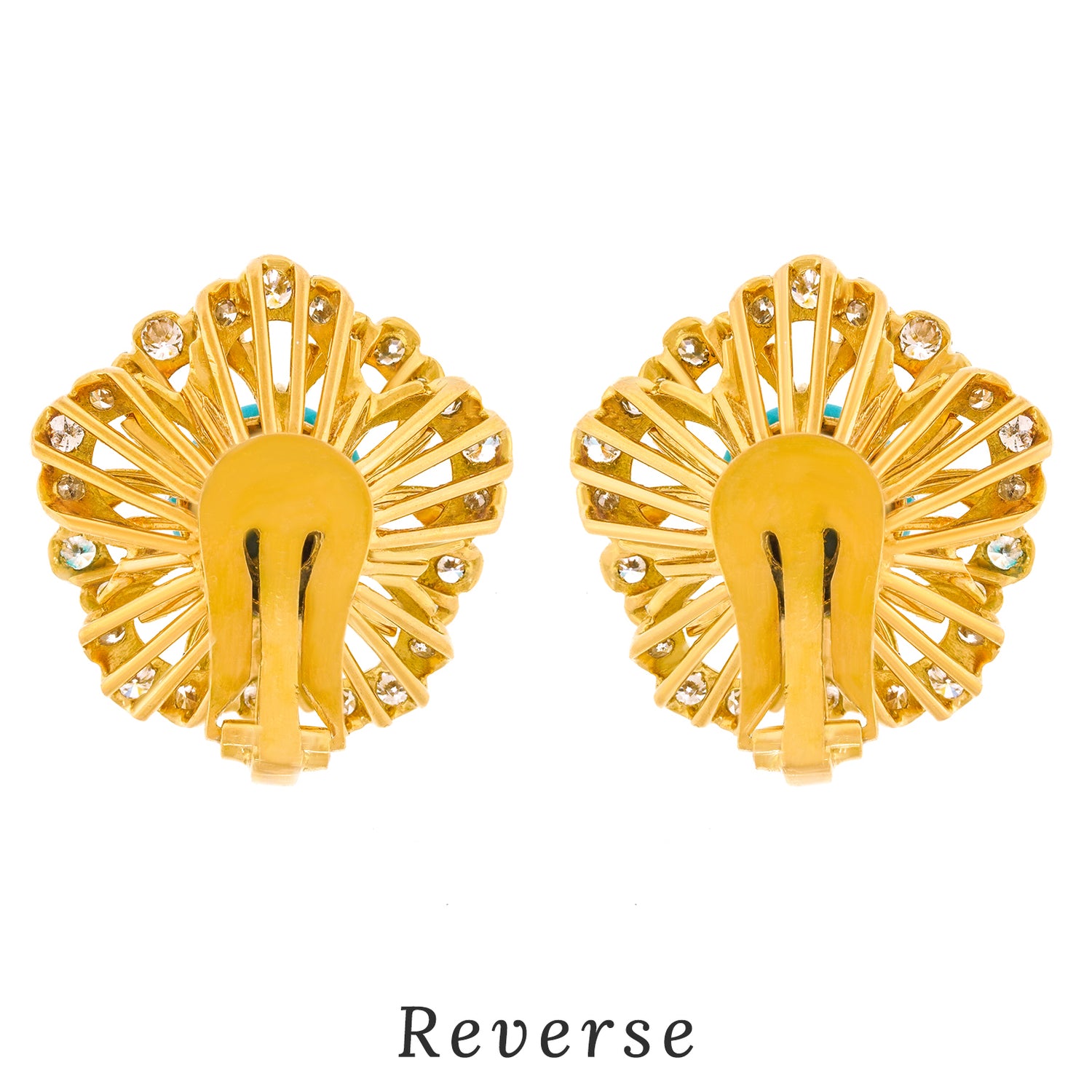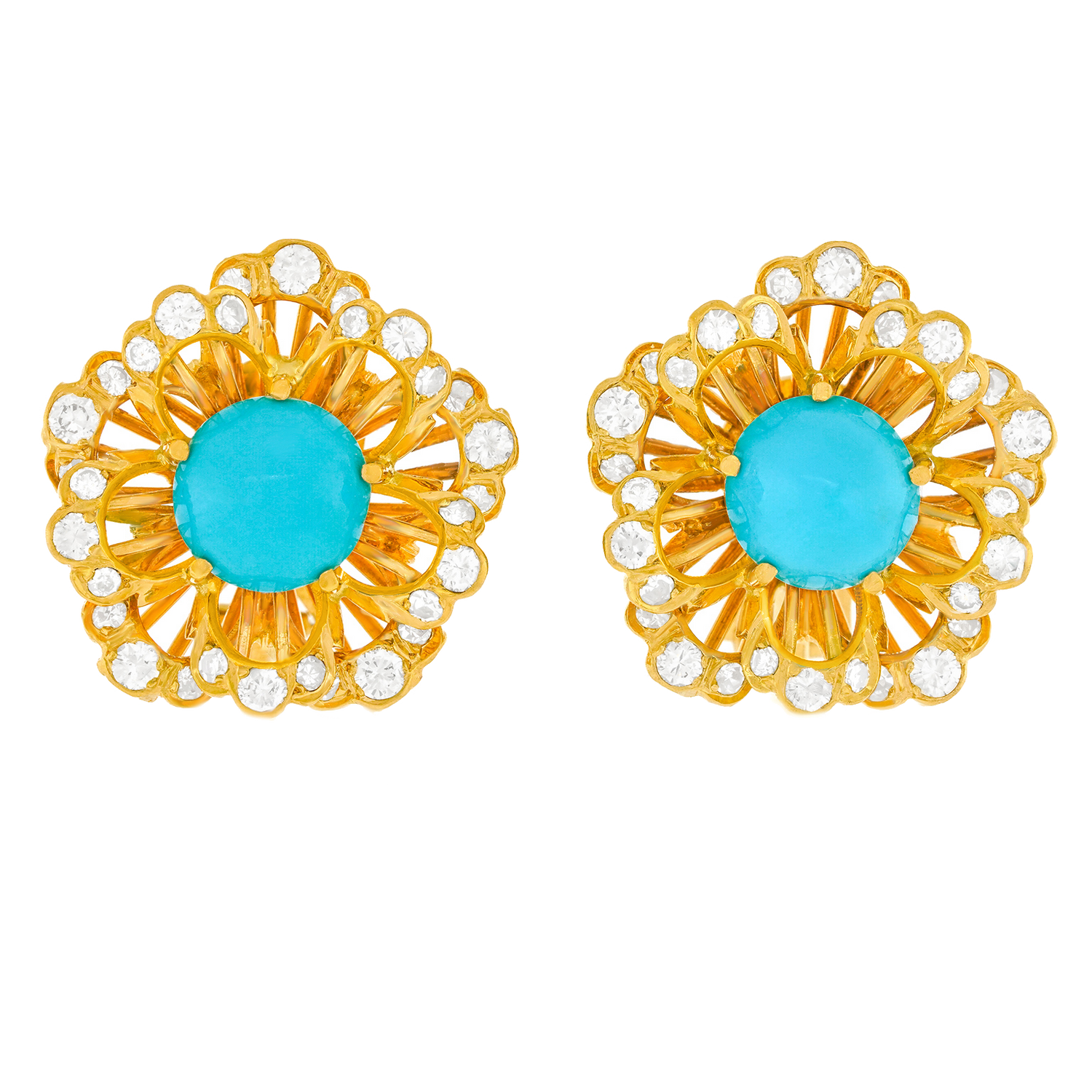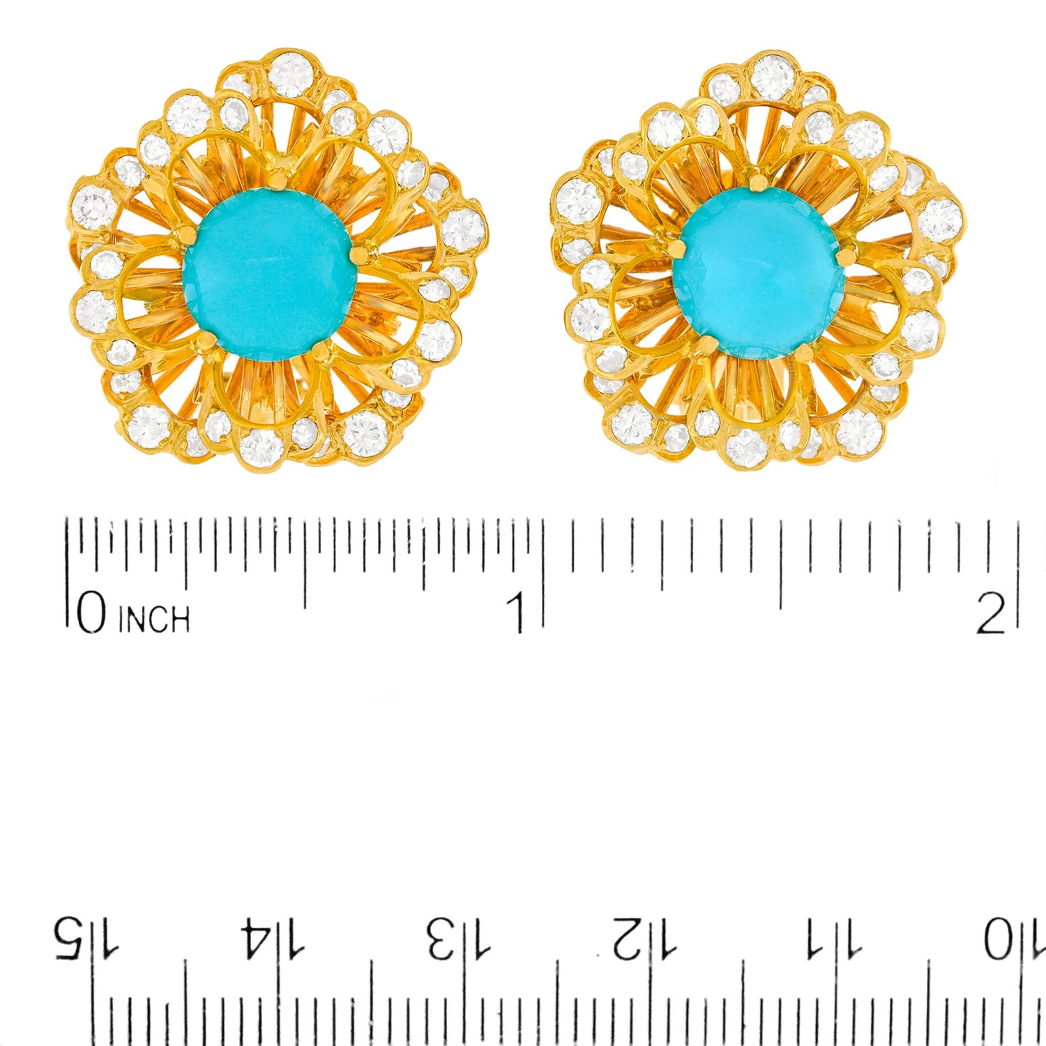 Circa 14k, c1950s. The exceptionally vivid Persian turquoise at the heart of these chic earrings makes their vintage fifties look ...pop ...pop ...pop!!!  Their exuberant color is underscored by the sparkle of 2.0 carats of superb white diamonds (G color, SI1 clarity). Well-made and comfortable to wear, they are in excellent condition.