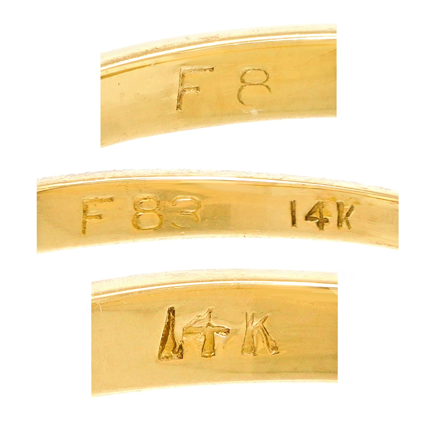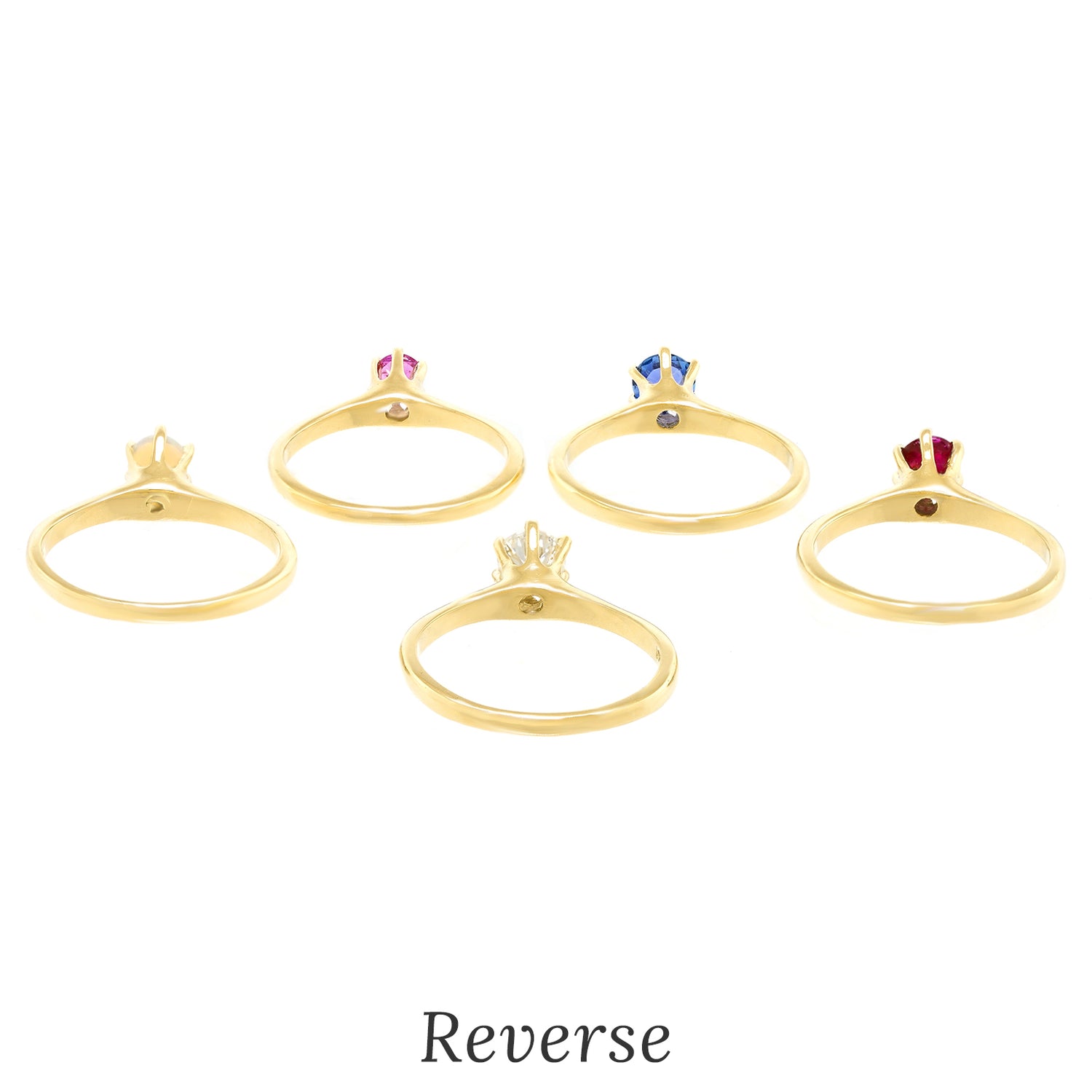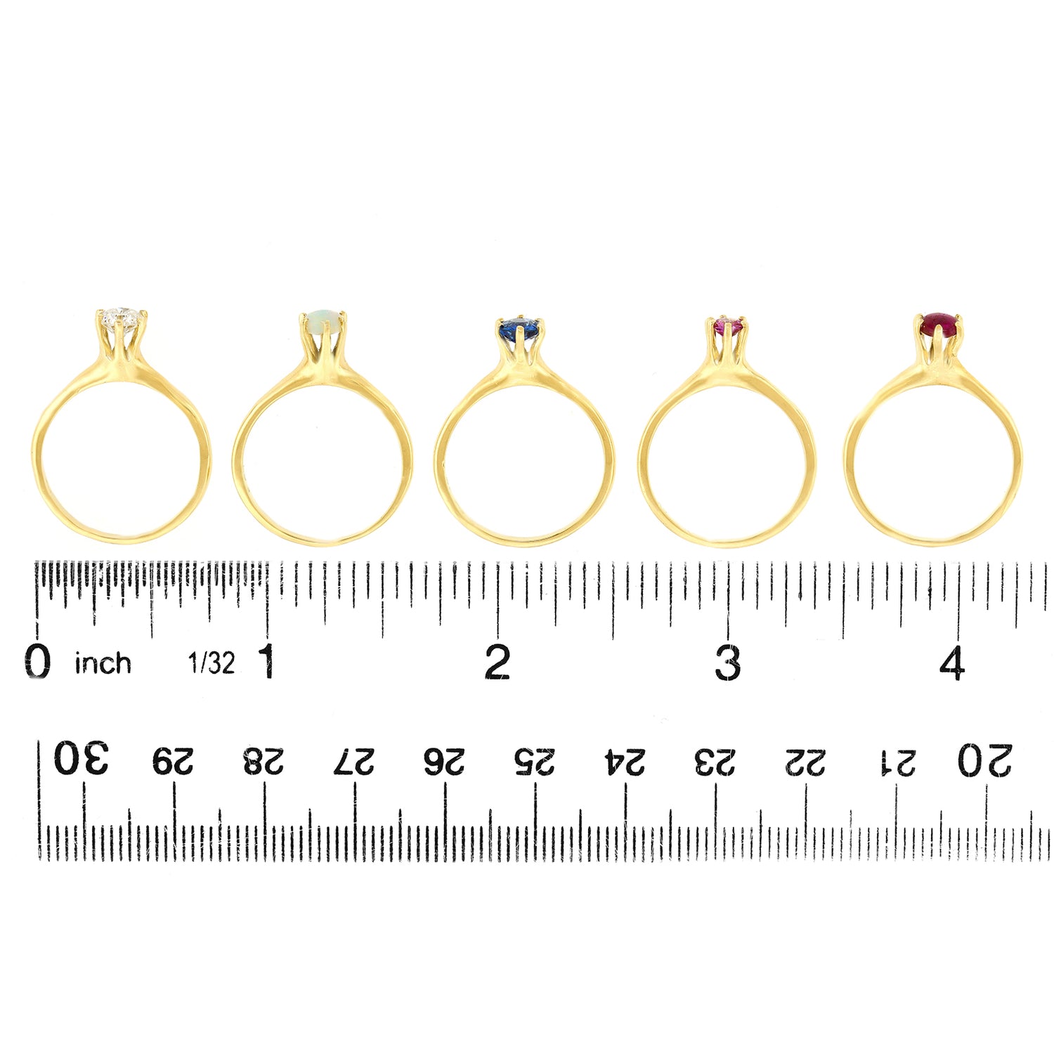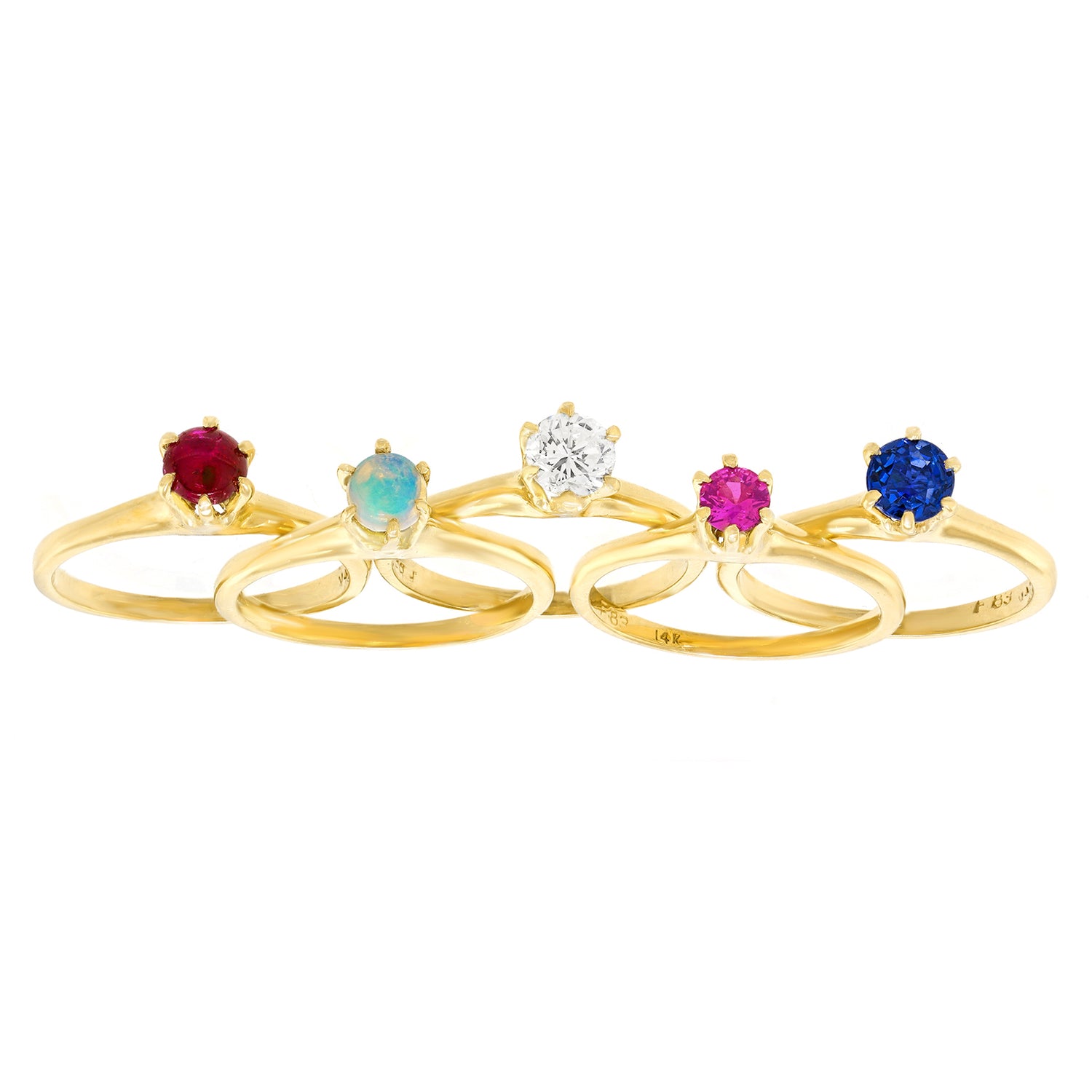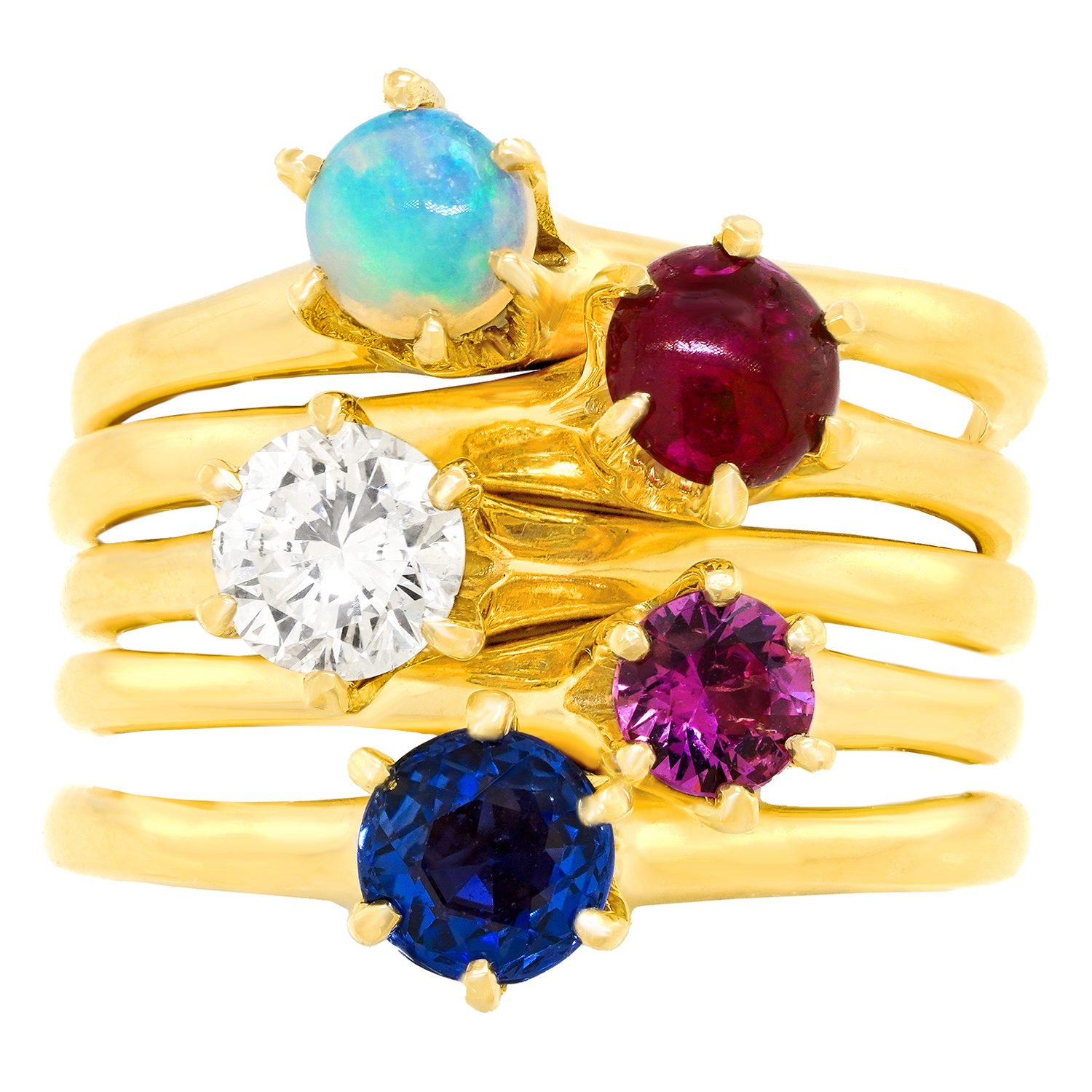 Circa 1960s, 14k, American. This group of five stacking rings offers endless possibilities! Wear them all at once on the same finger, mix and match stacking them, or wear a single to coordinate with an understated look. Jewelry should be fun, fashionable, chic, and an expression of your personal style! These well-made rings, with their bright gemstones (Diamond, Ruby, Pink Sapphire, Opal, and Blue Sapphire), are in excellent condition. They invite you to play!