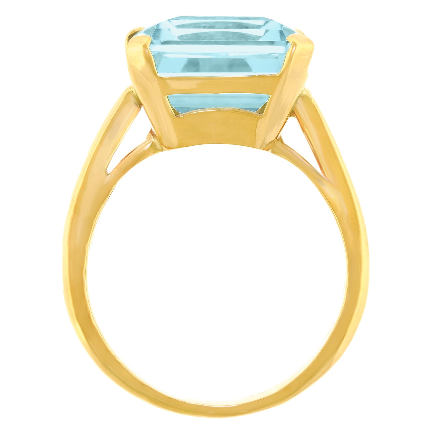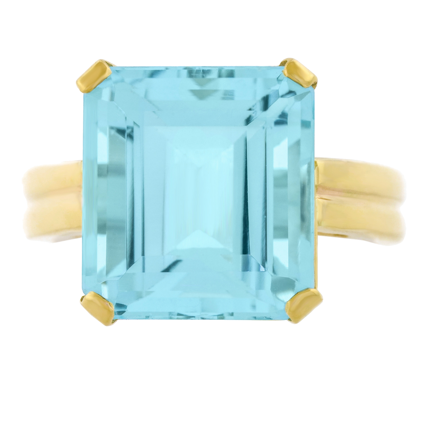 Circa 1940 with restored shank, 14k, American. From the catwalk to the sidewalk, this fashionable forties ring is American glamour at its colorful best. Set with a delicately-hued deep blue 10.0-carat aquamarine, it is well made in 14k yellow gold. Excellent condition.