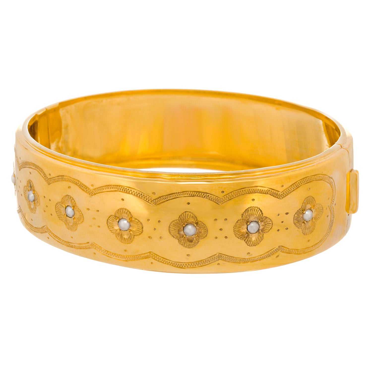 Circa 1940s, 18k, by Amiel, Paris, France. Impeccably styled for everyday wear, this eighteen-karat gold bangle is as fashionably relevant today as it was chic 60 years ago. Known for specializing in Victorian styles, Amiel of Paris dates back to the 19th century. This bangle is beautifully made and in especially crisp condition. (Excellent condition.)