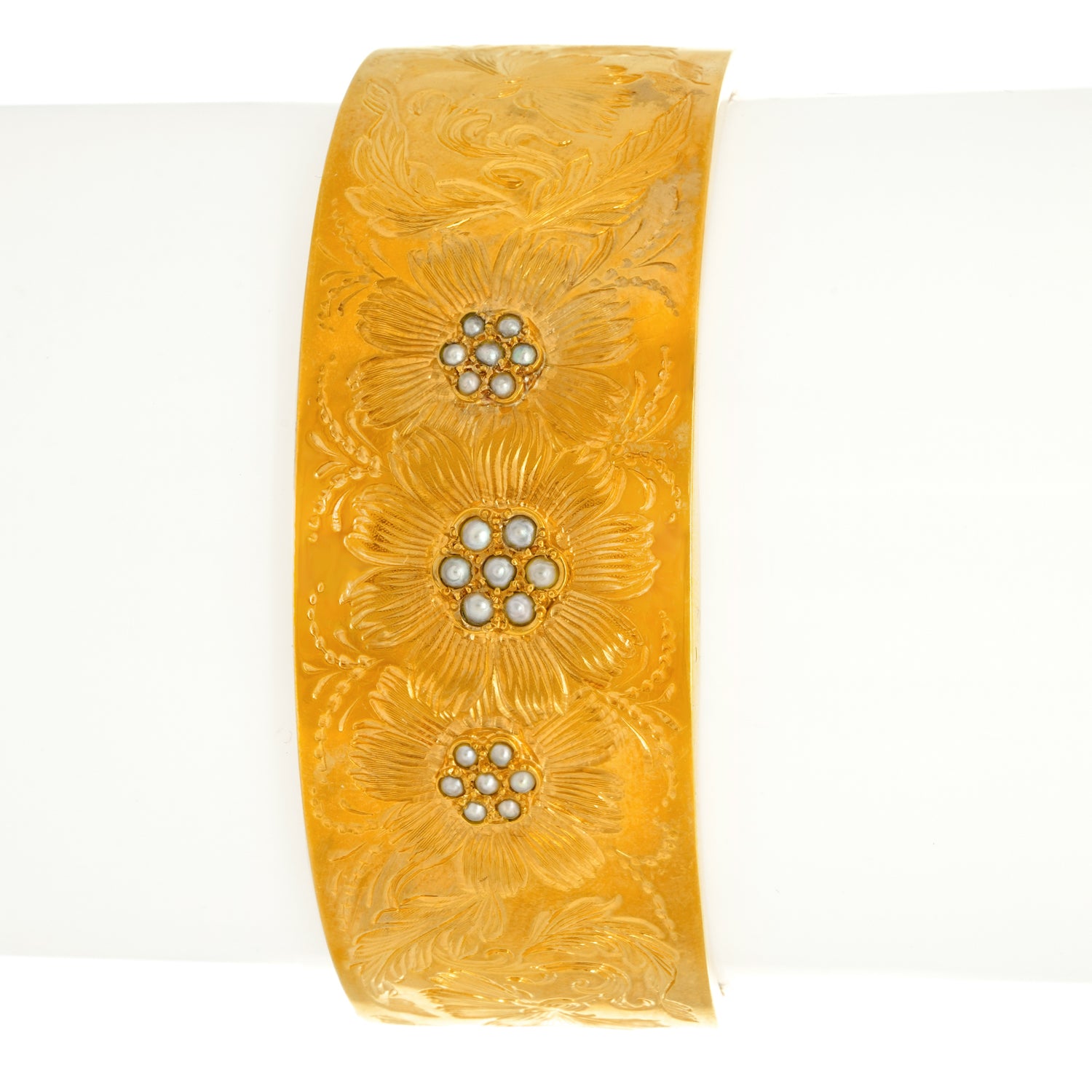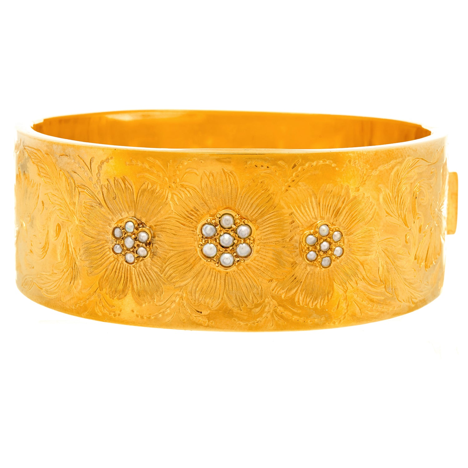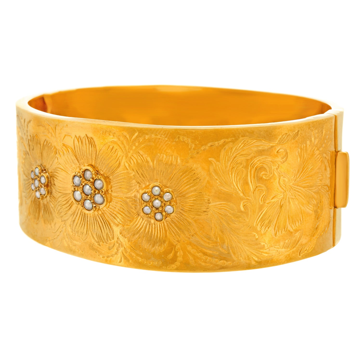 Circa 1940s, 18k, by Amiel, Paris, France. Impeccably styled for everyday wear, this eighteen-karat gold bangle is as fashionably relevant today as it was chic 60 years ago. Known for specializing in Victorian styles, Amiel of Paris dates back to the 19th century. This bangle is beautifully made and in especially crisp condition. (Excellent condition.)